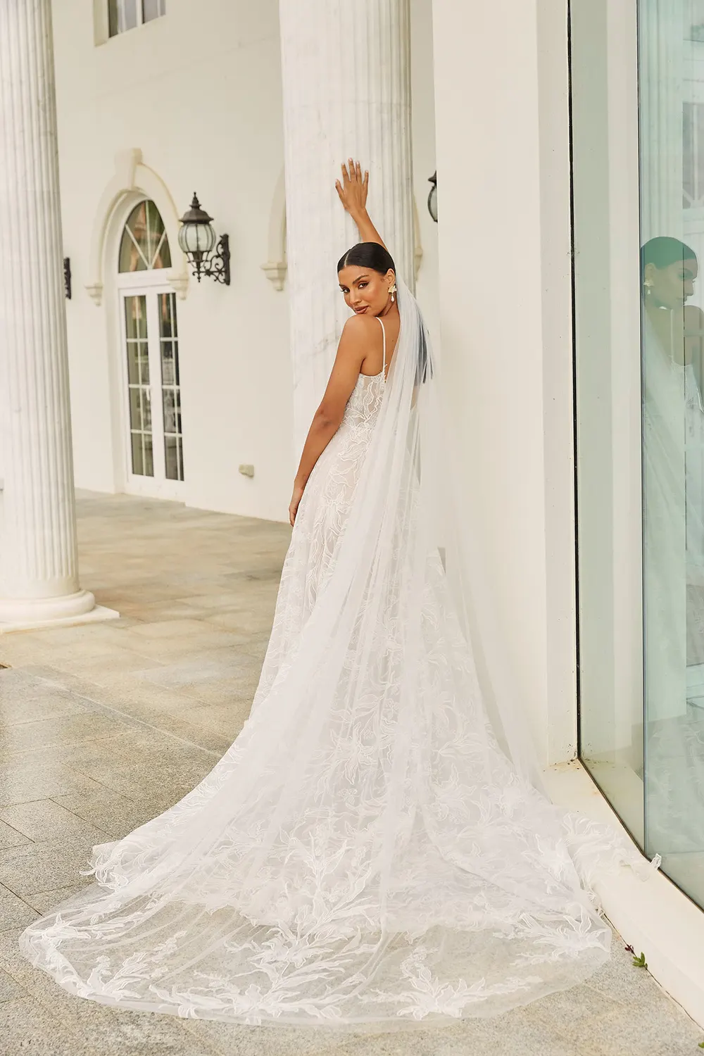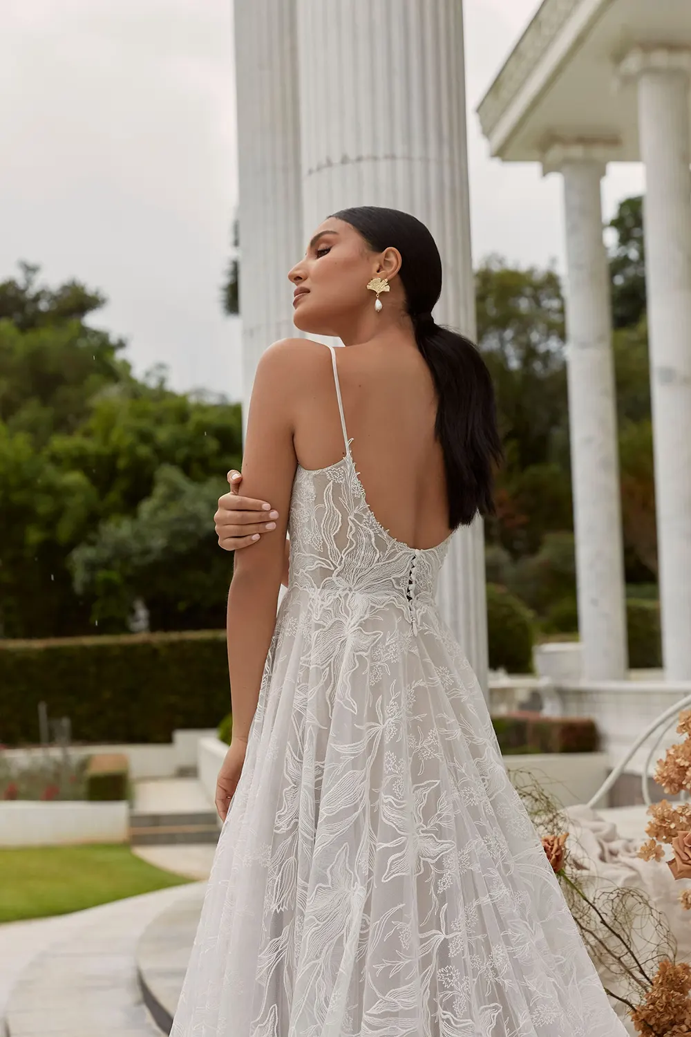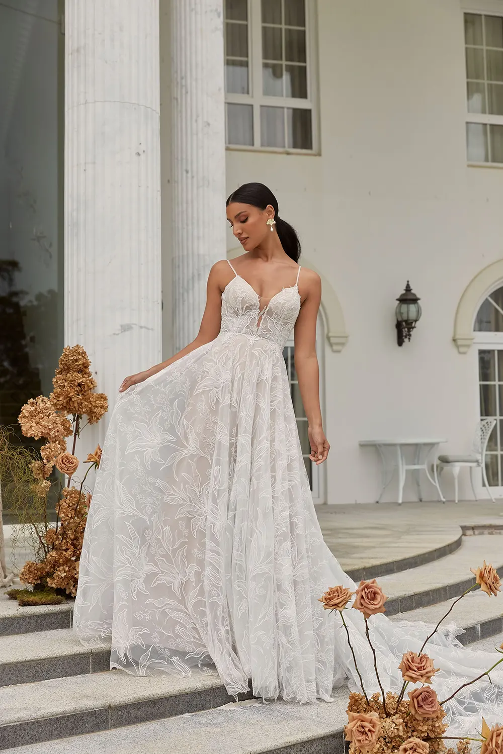 Das Brautkleid Dune von Madi Lane verzaubert durch seine großformatige florale Spitze. Der semitransparente Rock in A-Linie umspielt die Silhouette seiner Trägerin bei jeder Bewegung. Der Ausschnitt geht über in schmale Tüllträger, die für Leichtigkeit sorgen und den romantischen Look abrunden. Ein besonderes Element ist der tiefe, abgerundete Rückenausschnitt mit kurzer Knopfleiste. Das moderne Spitzenmotiv bedeckt das Kleid mitsamt der weiten Schleppe. Durch die Transparenz kommt die Spitze hier besonders zur Geltung.