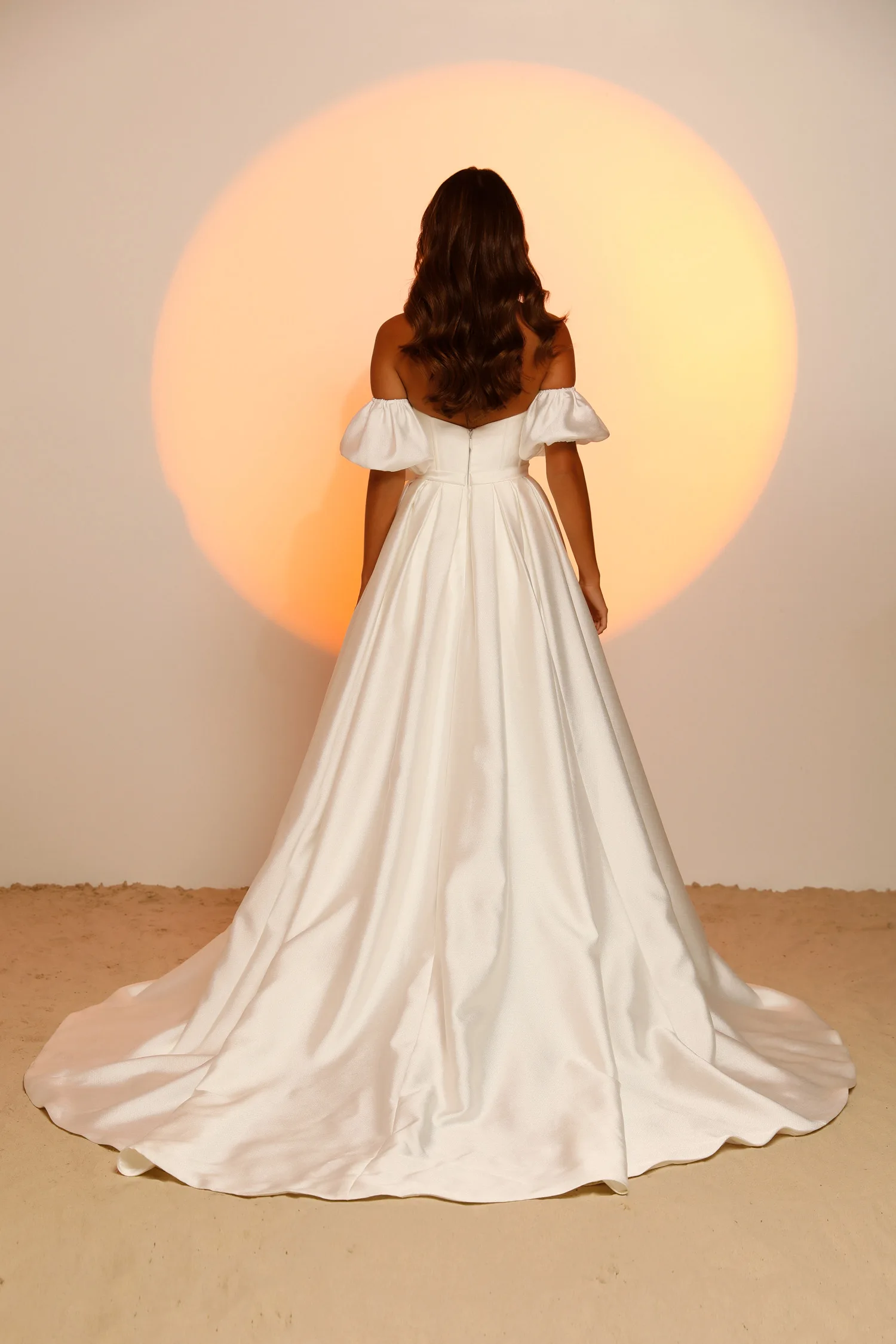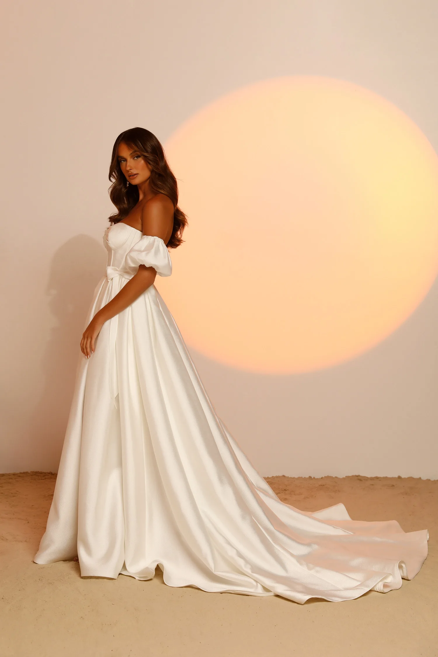 Jonnie von Madi Lane ist ein klassisches Prinzessin-Brautkleid mit modernen Elementen. Der gesamte Entwurf ist aus glänzendem Mikado mit Oberflächenstruktur gefertigt. Abnehmbare, kurze Bischofsärmel komplementieren das trägerlose Mieder im Carmen-Stil. Unter dem schmalen Gürtel mit Schleifendetail fächern sich die Kellerfalten des weit schwingenden Rocks auf. An der Vorderseite sorgt ein Schlitz für Beinfreiheit. Der Rock schließt mit einer drapierten Schleppe ab.