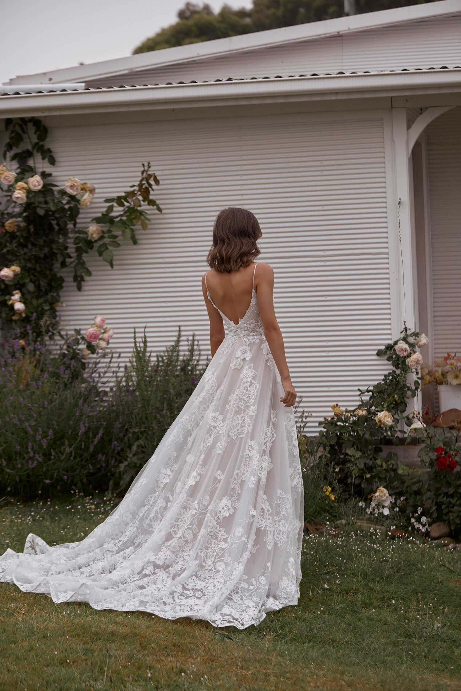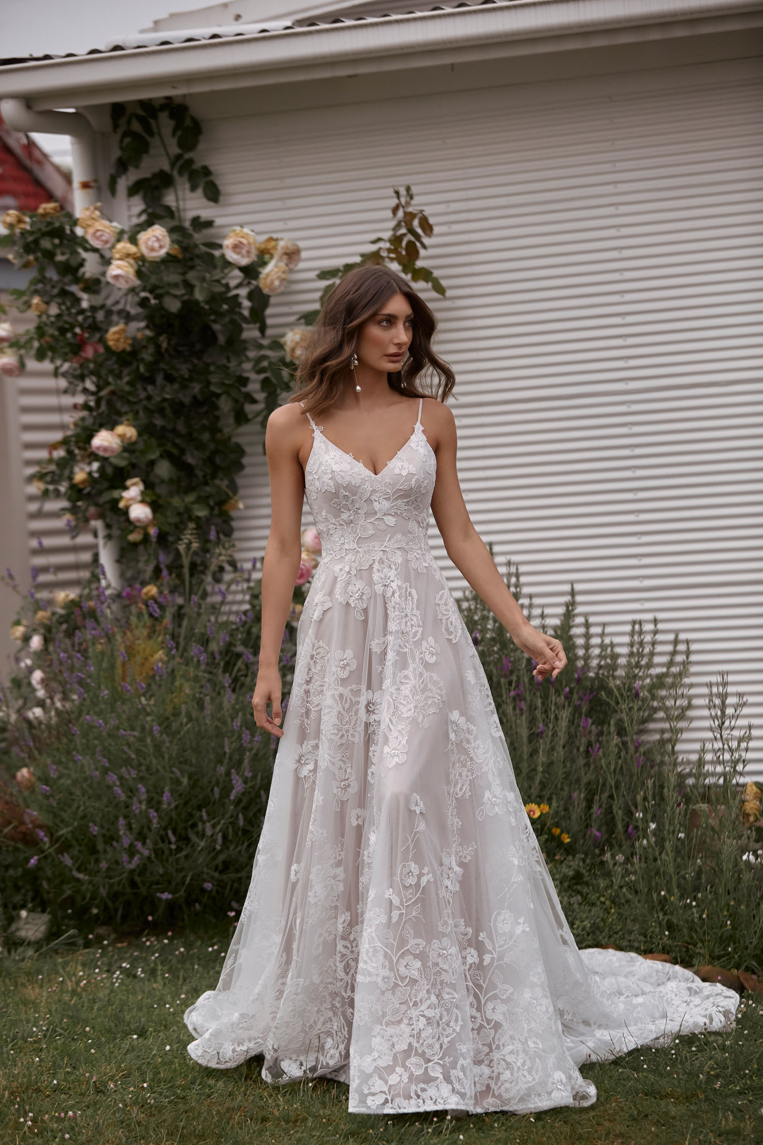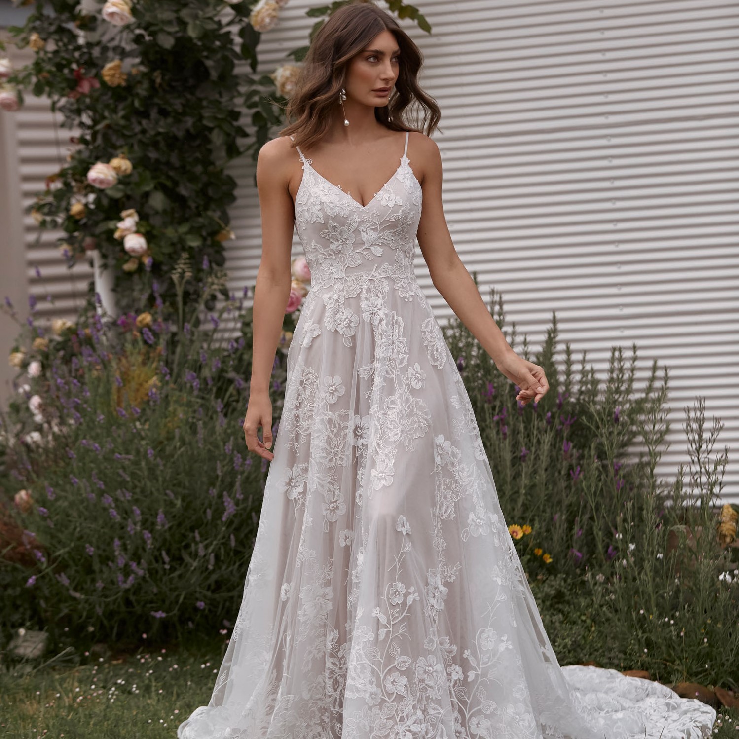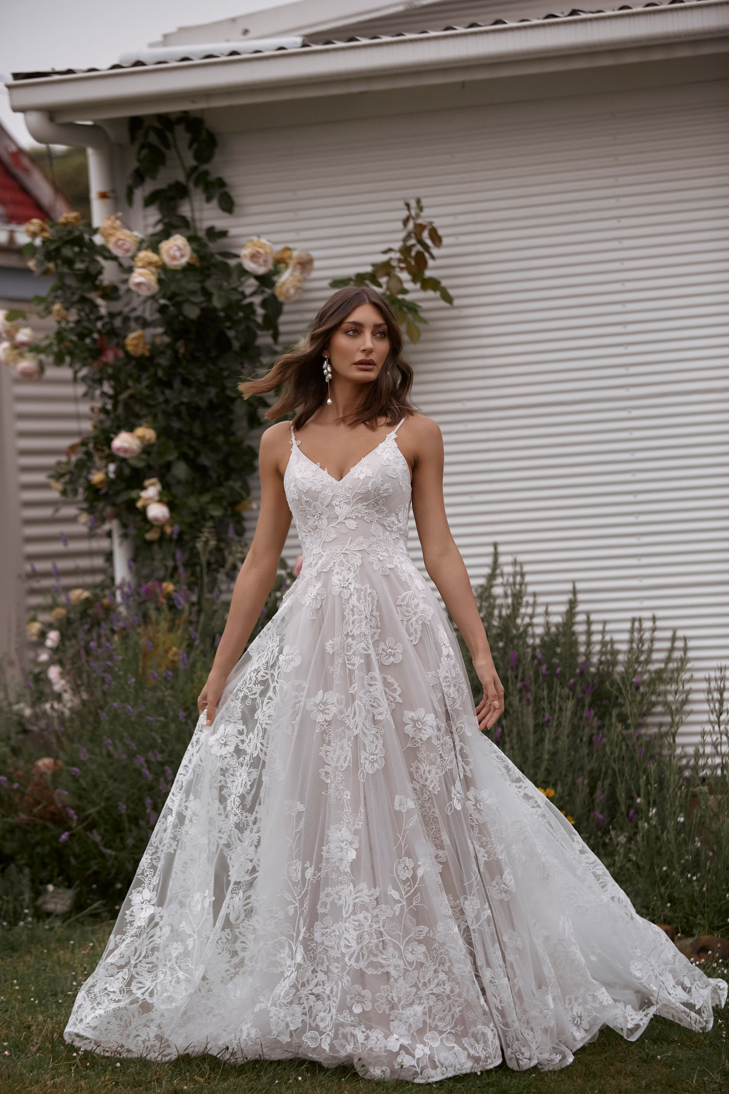 Mit Carina präsentiert Madi Lane ein Brautkleid für moderne Romantikerinnen. Großformatige Blütenspitze bedeckt den gesamten Stoff, der wiederum mit geschmeidiger Charmeuse unterlegt ist. Somit ist das Kleid angenehm leicht zu tragen. Die Spitze rankt sich bis zu den Übergängen in die Spaghettiträger. Ein praktischer Reißverschluss befindet sich unterhalb des Rückenausschnitts. Mehrere Lagen Tüll bilden die Rockpartie, dabei schimmern durchsichtige Pailletten subtil durch die oberste Lage und verleihen einen dezenten Glamour. Den Abschluss bildet eine breite Kapellenschleppe, deren Saum durch ein schmales Band verstärkt ist und dadurch besonders lebendig wirkt.