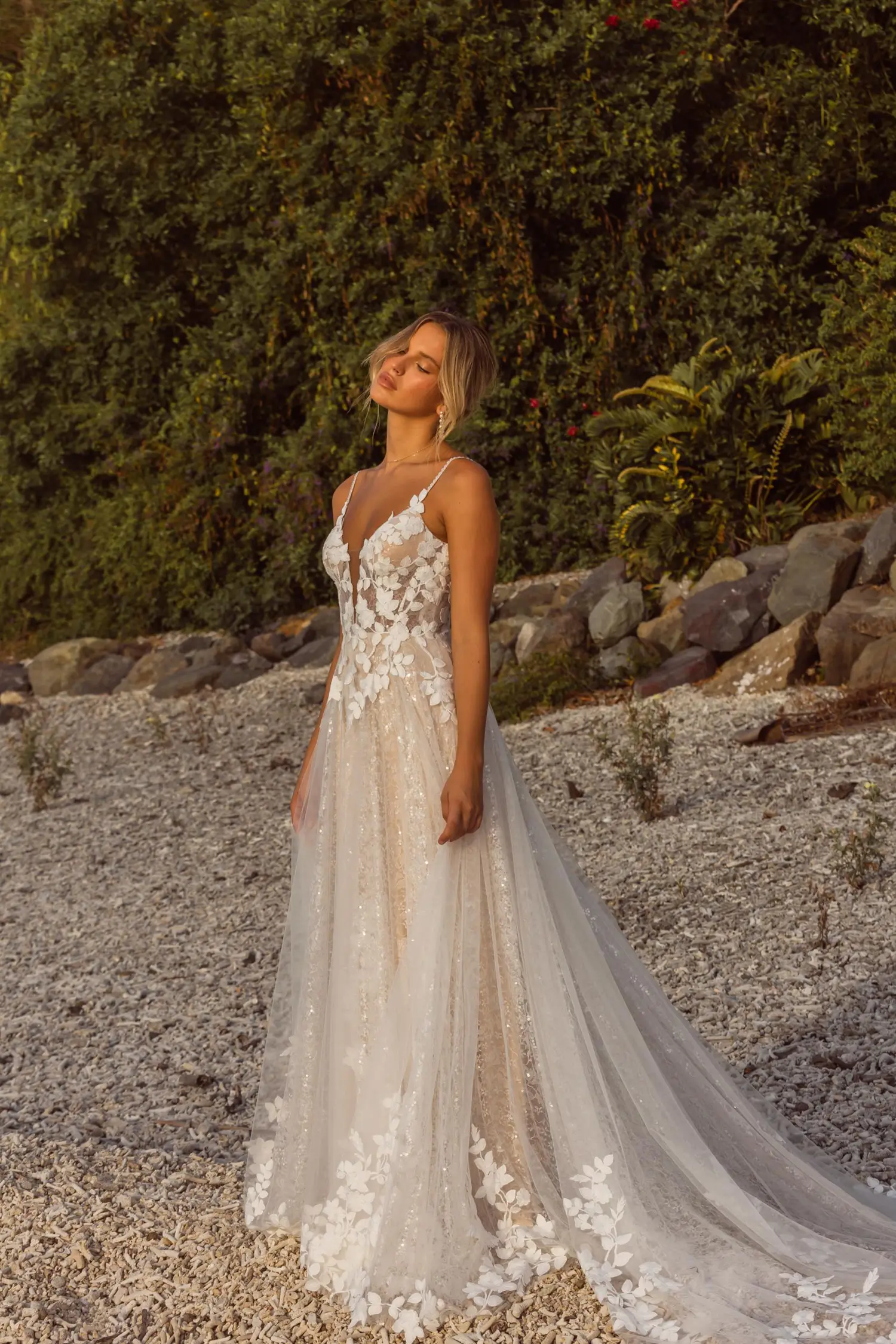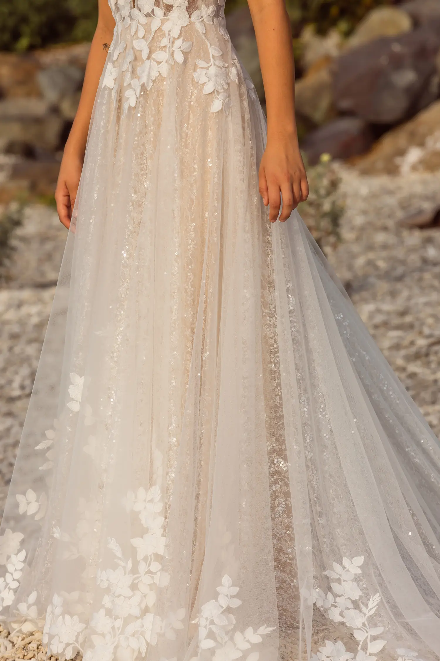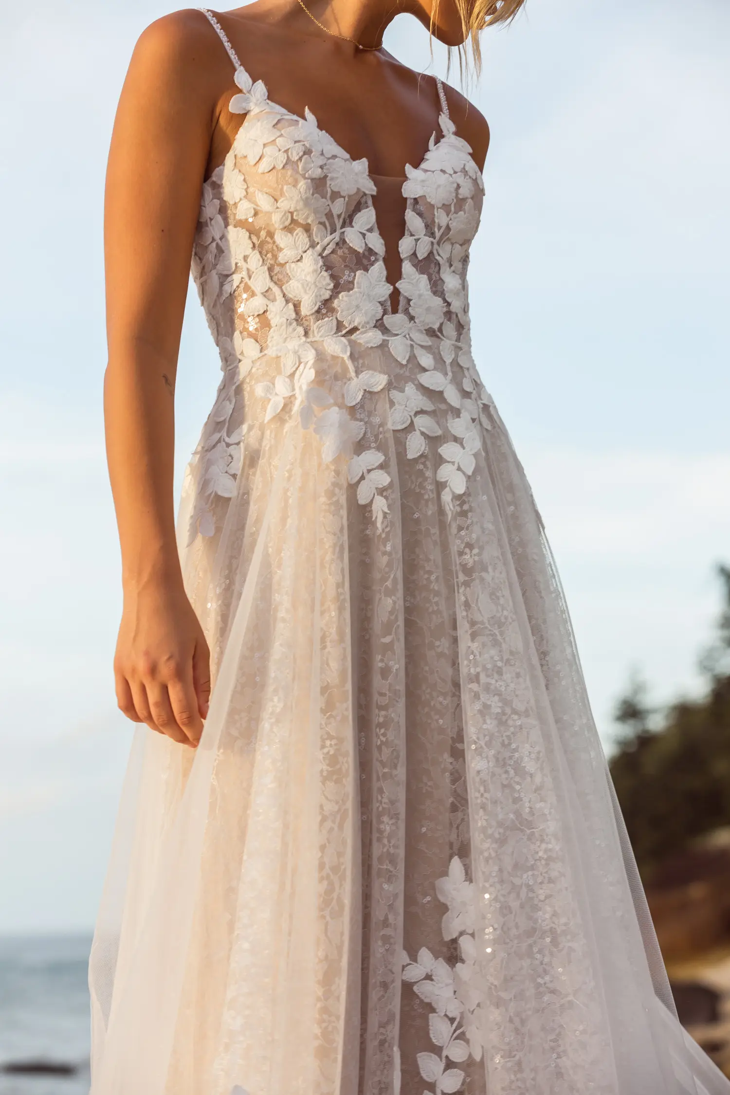 Das Brautkleid Jenica von Madi Lane ist eine Symbiose von Tüll, Spitze und Pailletten. Damit besteht es aus den gleichen Komponenten wie das Modell Jesslyn, besitzt aber einen klassischeren Charakter. Oberteil und Rock sind aus paillettenbestickter Chantilly-Spitze gefertigt, die wiederum von einer präsenteren Schicht Spitze bedeckt ist. Perlen zieren die filigranen Träger. Am tiefen, U-förmigen Rückenausschnitt setzt eine kurze Knopfleiste an. Am nudefarben gefütterten Rock fächert sich der Tüll auf und endet in einer Schleppe, die das florale Muster des Oberteils aufgreift.