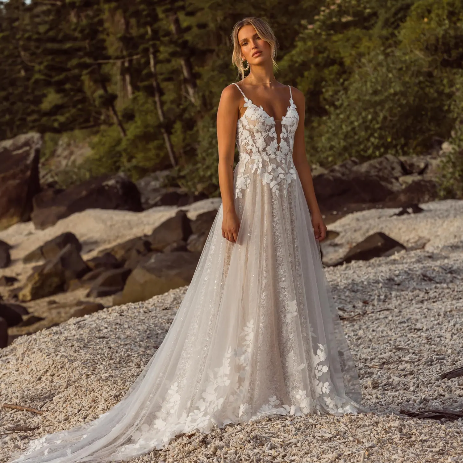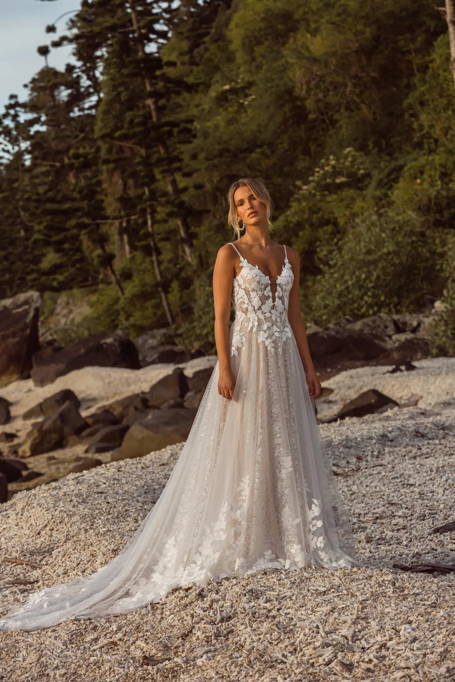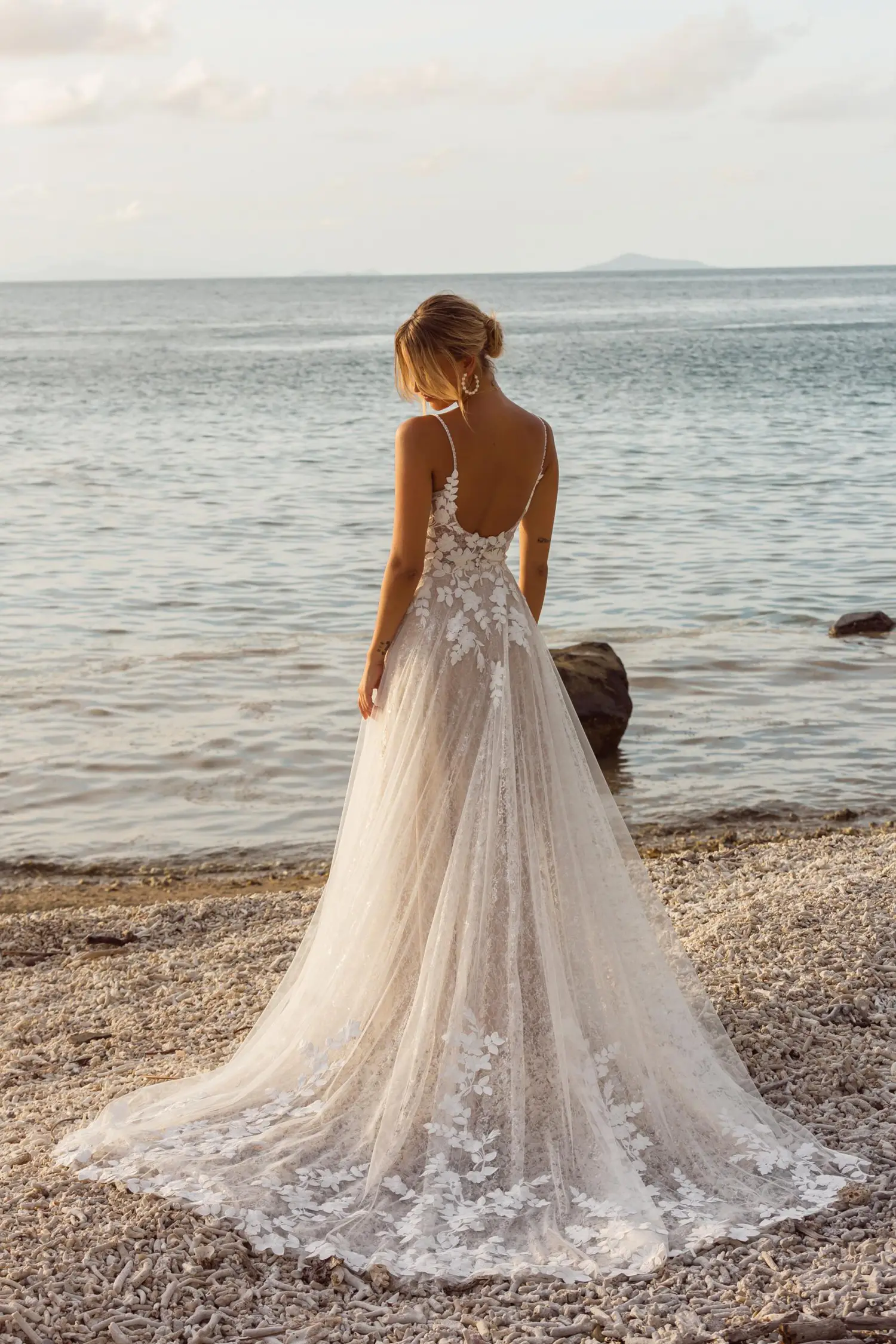 Das Brautkleid Jenica von Madi Lane ist eine Symbiose von Tüll, Spitze und Pailletten. Damit besteht es aus den gleichen Komponenten wie das Modell Jesslyn, besitzt aber einen klassischeren Charakter. Oberteil und Rock sind aus paillettenbestickter Chantilly-Spitze gefertigt, die wiederum von einer präsenteren Schicht Spitze bedeckt ist. Perlen zieren die filigranen Träger. Am tiefen, U-förmigen Rückenausschnitt setzt eine kurze Knopfleiste an. Am nudefarben gefütterten Rock fächert sich der Tüll auf und endet in einer Schleppe, die das florale Muster des Oberteils aufgreift.
