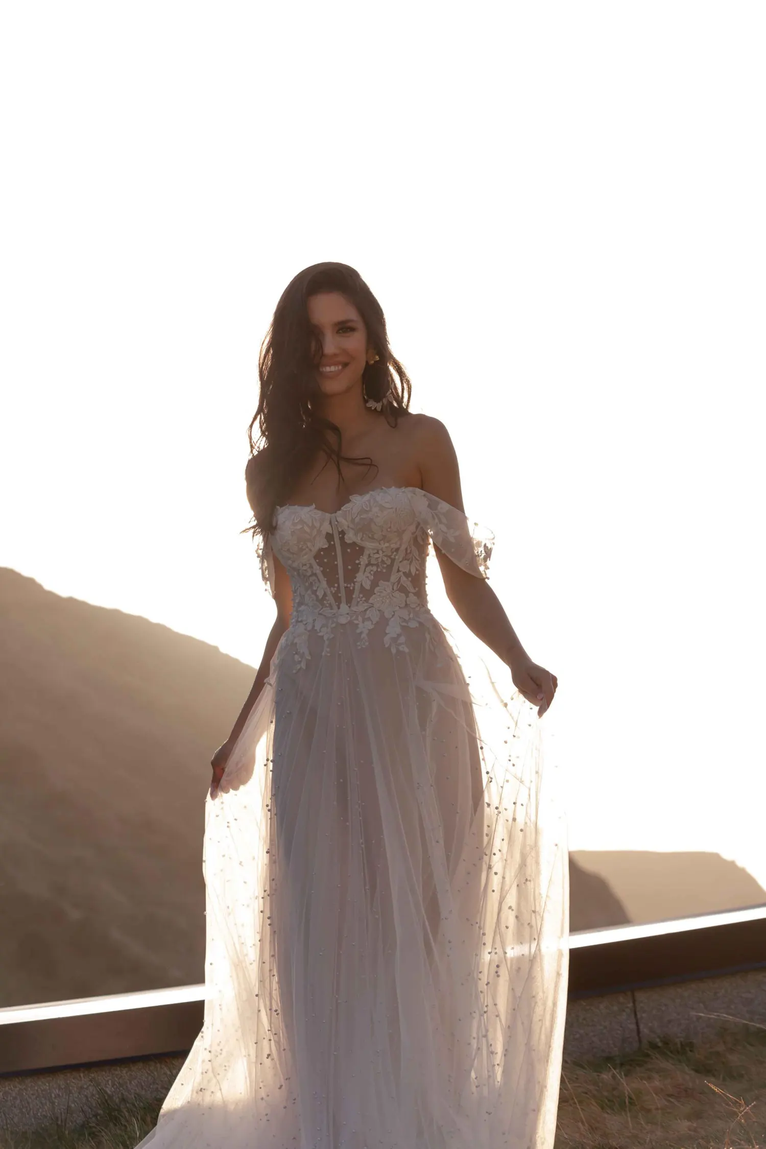 Moderne und romantische Elemente vereinen sich in Kaiya von Madi Lane zu einem trendigen Boho-Brautkleid. Das kurze, transparente Oberteil ist mit sichtbar eingearbeiteten Stäbchen, floraler Spitze, Perlen und Pailletten versehen. Die seitlichen Träger im Carmen-Stil unterstreichen den Boho-Look, sind aber auch abnehmbar. An der Rückseite verläuft eine Knopfleiste. Die Perlen finden sich auch auf dem nudefarben unterlegten Tüllrock mitsamt Schleppe.