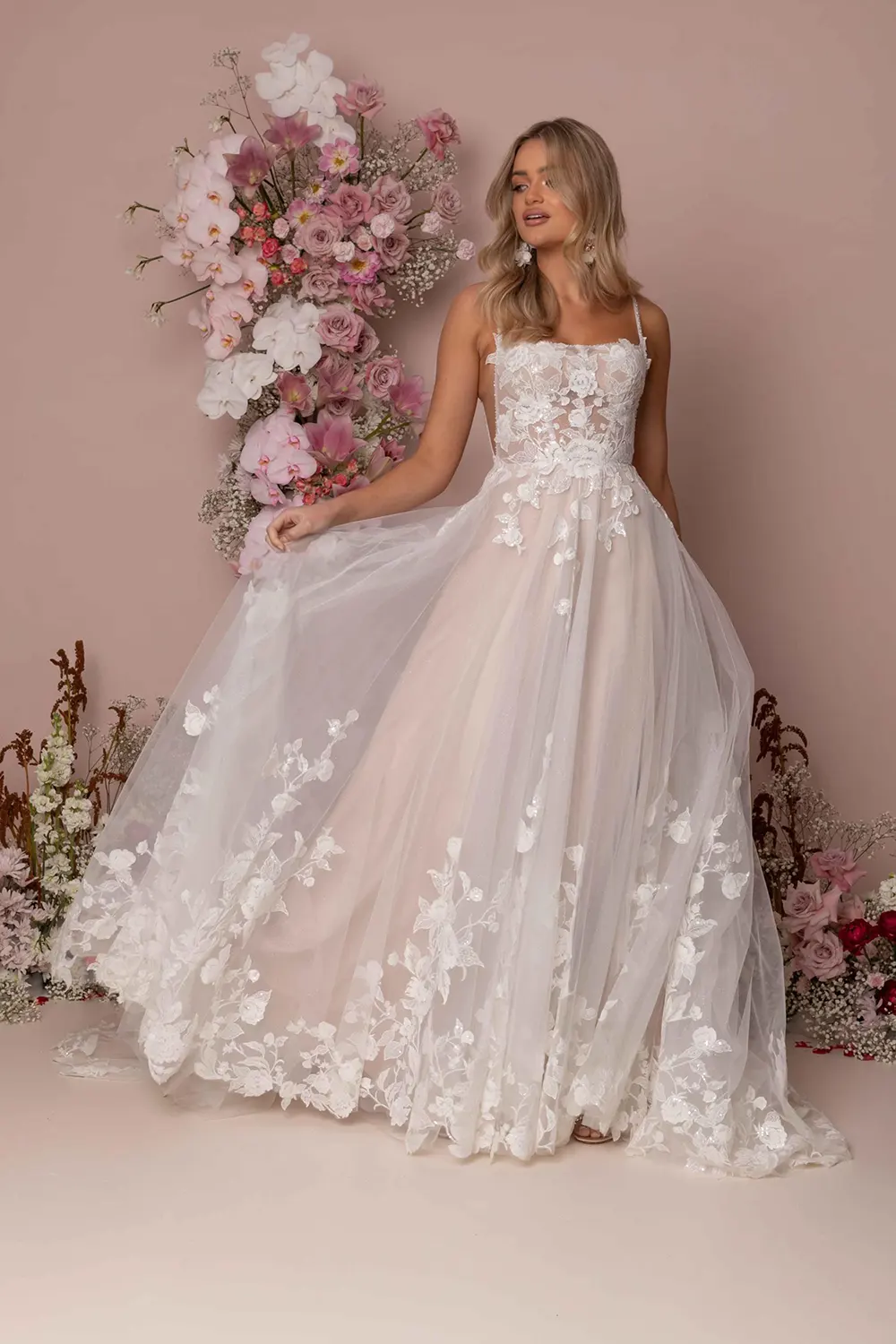 Das Brautkleid Kalani von Madi Lane verkörpert moderne Romantik, die mit einem Hauch Glamour versehen ist. Das Modell aus Glitzertüll ist zart nudefarben gefüttert und mit floraler, paillettenbestickter Spitze bedeckt, die sich vom transparenten Oberteil aus in die Rockpartie ergießt. Perlen rahmen den Karree-Ausschnitt und die Seitenschlitze. Zudem lassen sie die schmalen Träger glitzern, die am Rücken in grafischem Muster verlaufen. Sichtbar eingearbeitet Stäbchen verleihen dem Oberteil Stabilität. Der lange Glitzertüll-Rock bildet auf dem Boden eine abgerundete, große Schleppe.