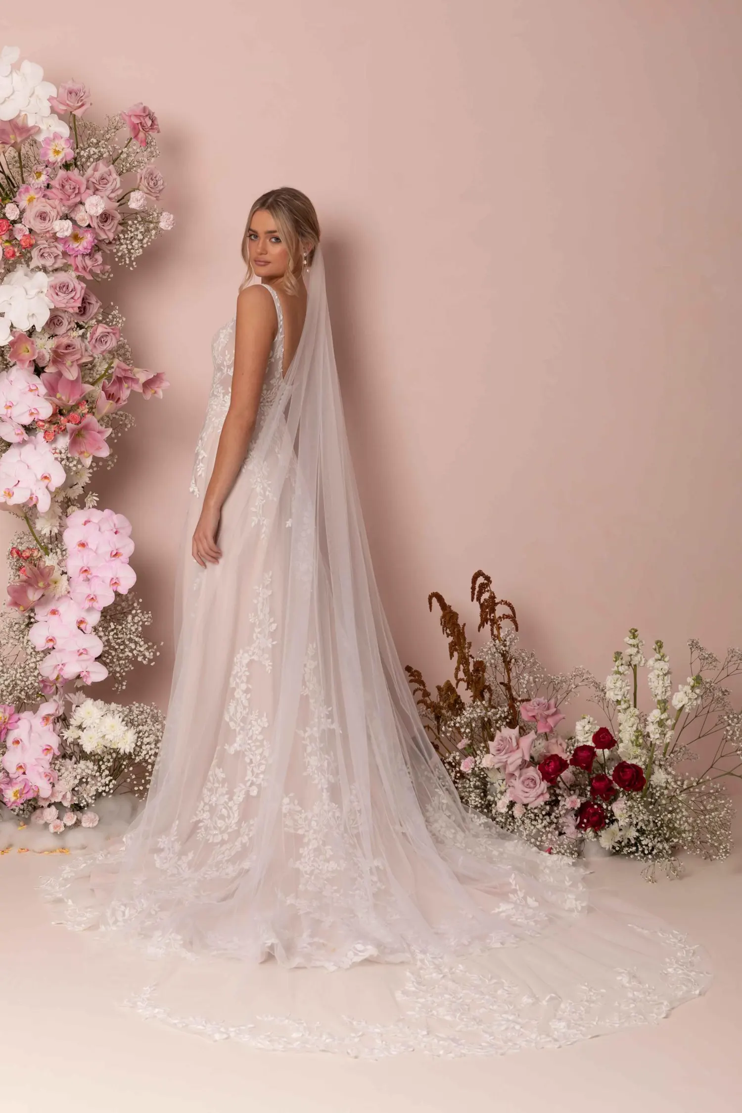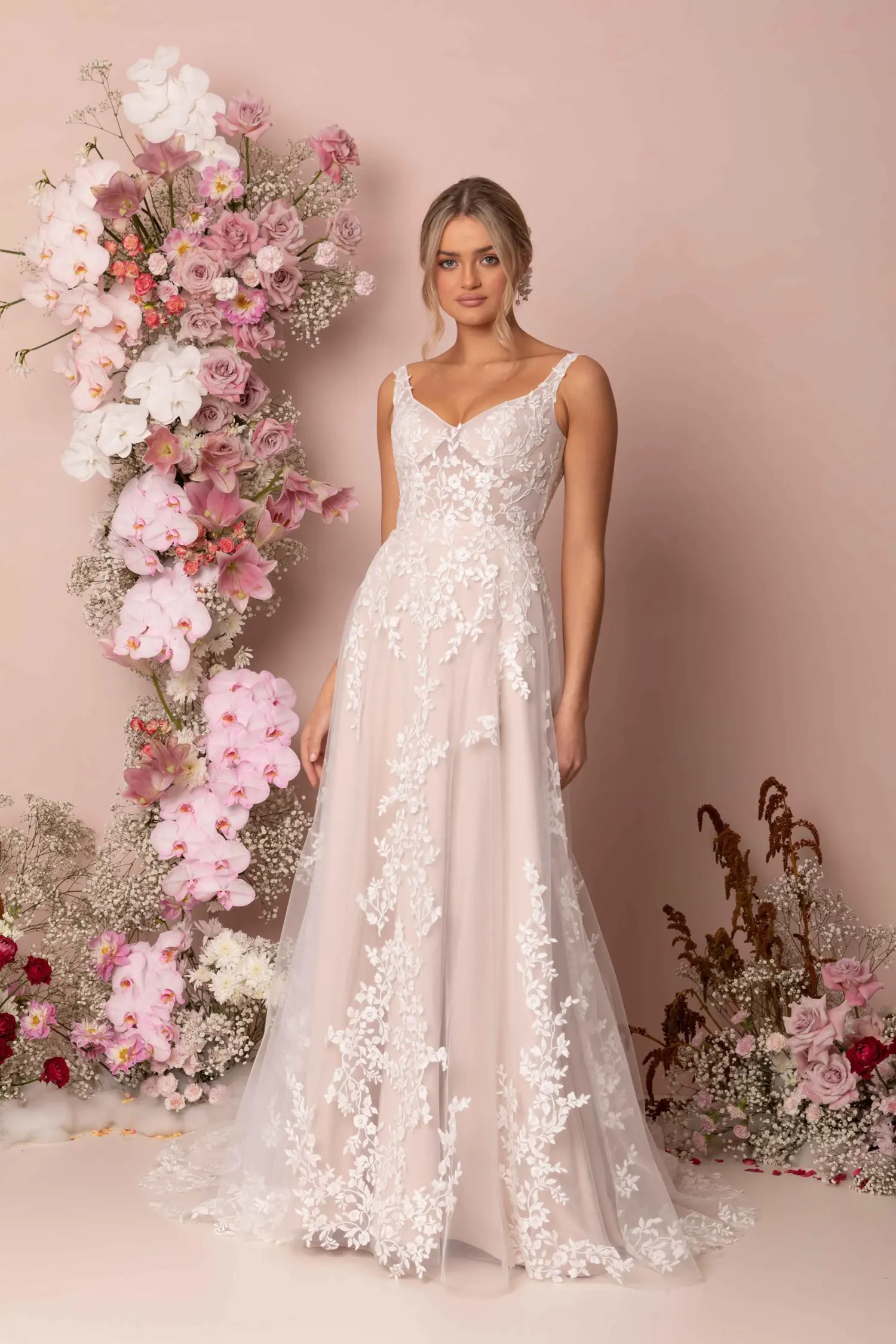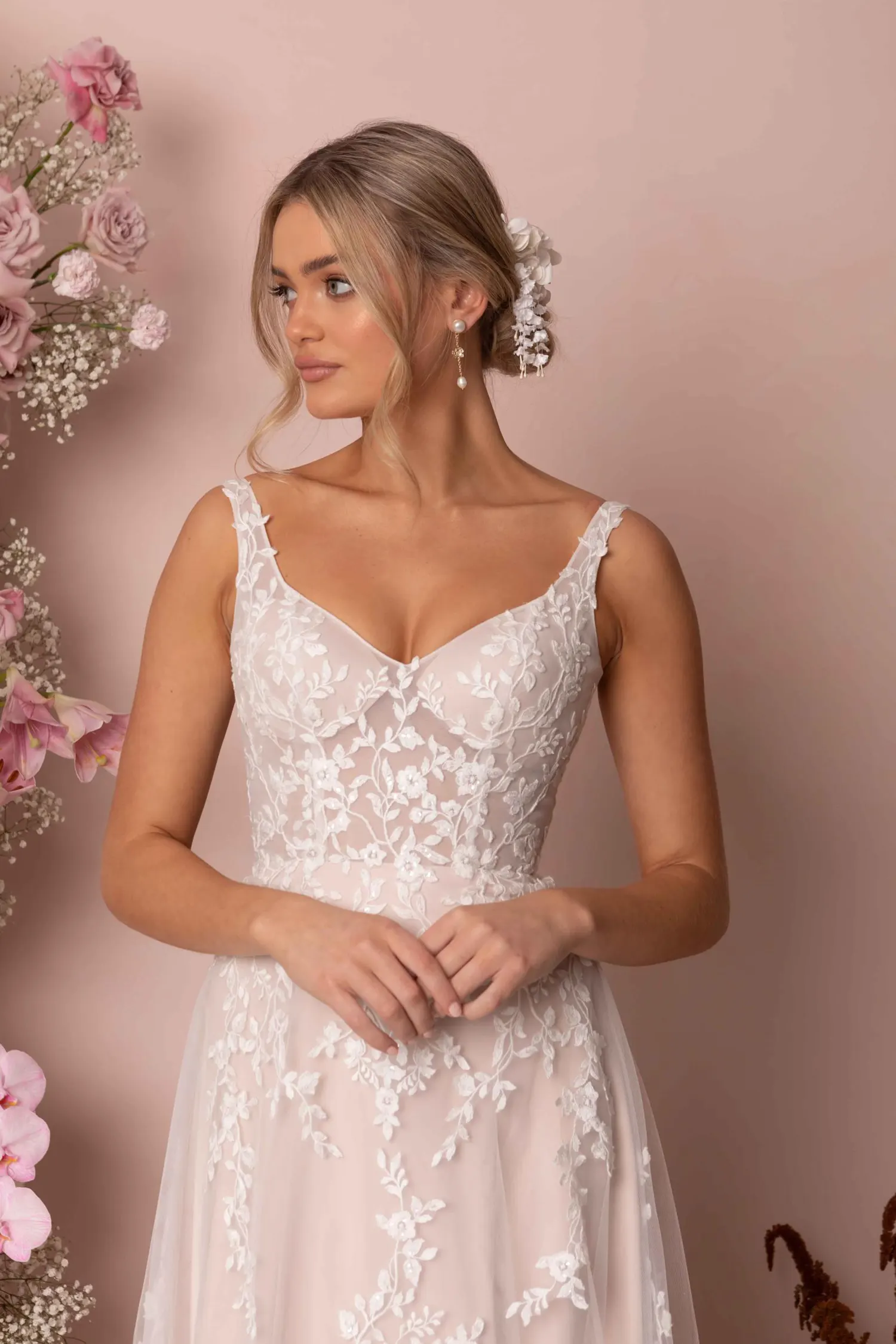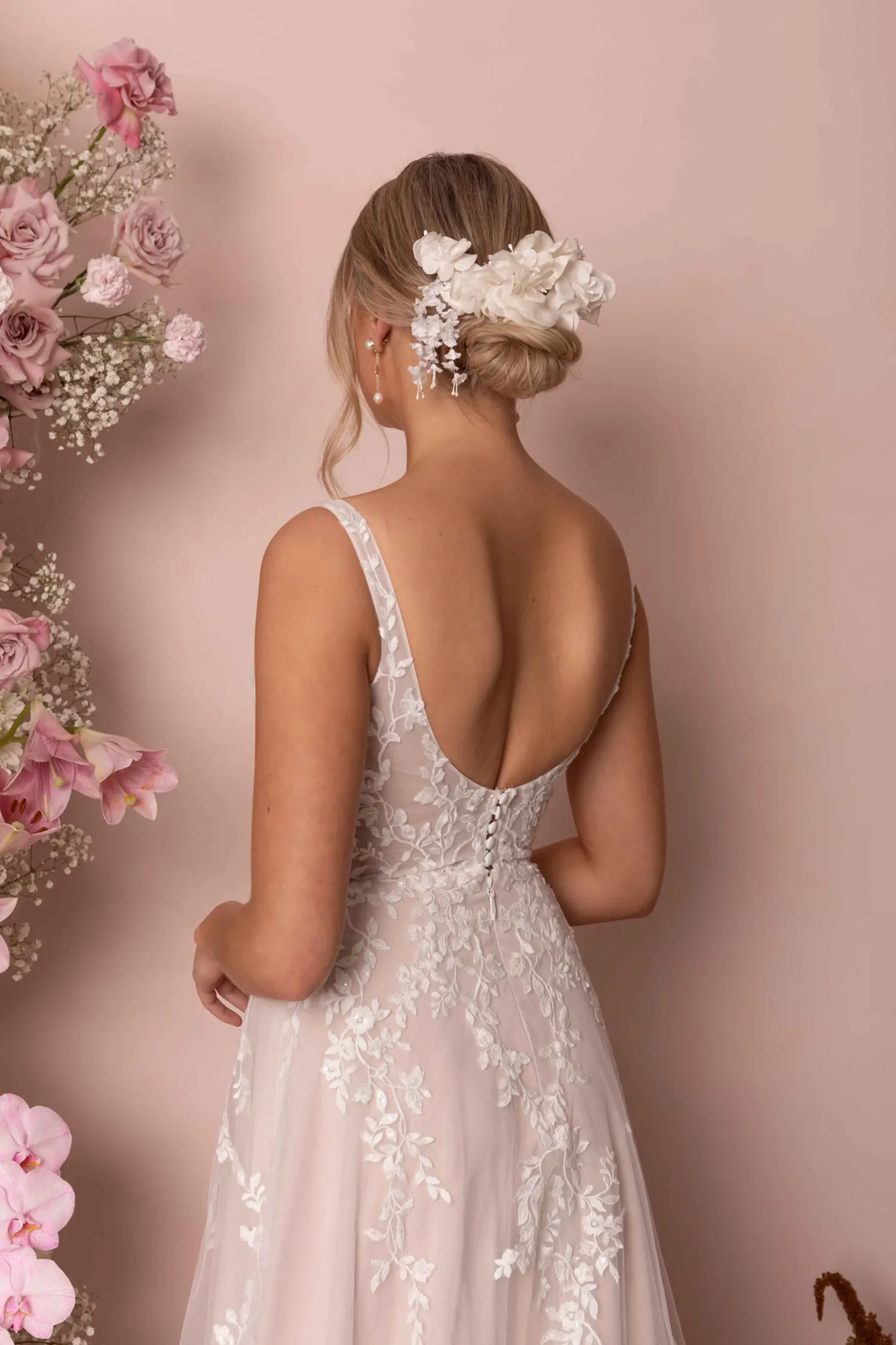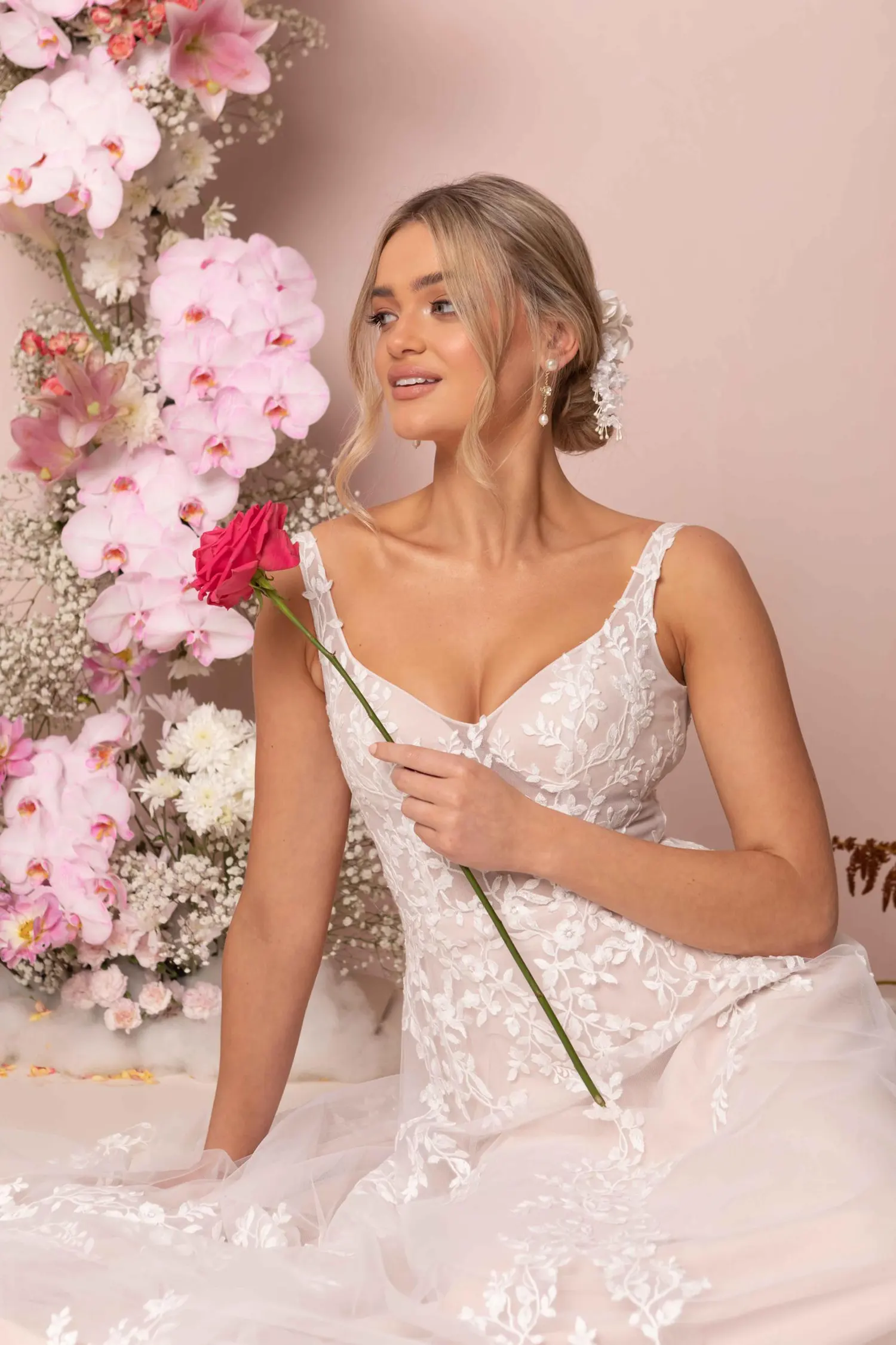 Das Brautkleid Kalara von Madi Lane präsentiert sich mit zeitloser Silhouette und modern gestaltetem Oberteil. Paillettenbestickte Blütenspitze verläuft vom transparenten Top in vertikalen Ranken über den mit Charmeuse gefütterten Rock bis zum Saum der abgerundeten Schleppe. Die formschönen Ausschnitte bilden einen schlichten Kontrast zur romantischen Gestaltung des Kleids. An der Rückseite befindet sich eine kurze Knopfleiste.