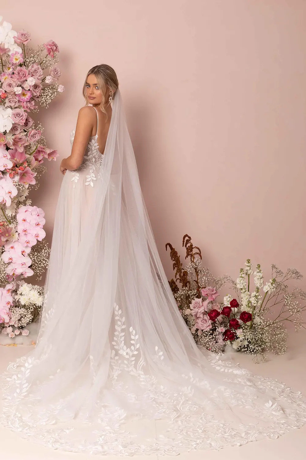 Das Brautkleid Keegan von Madi Lane wirkt durch seine zeitlose Silhouette und moderne Spitzenstickereien charmant und unaufgeregt. Das tief ausgeschnittene, semitransparente Oberteil ist mit der paillettenverzierten Spitze in Blättermotiven bedeckt, die sich über die Taille hinaus in den langen Rock fortsetzt. Spaghettiträger und ein wunderschön schlichter, U-förmiger Rückenausschnitt verleihen einen leichten Ballerina-Look. Der nudefarben gefütterte Rock aus Glitzertüll geht über in eine ovale, transparente Schleppe.