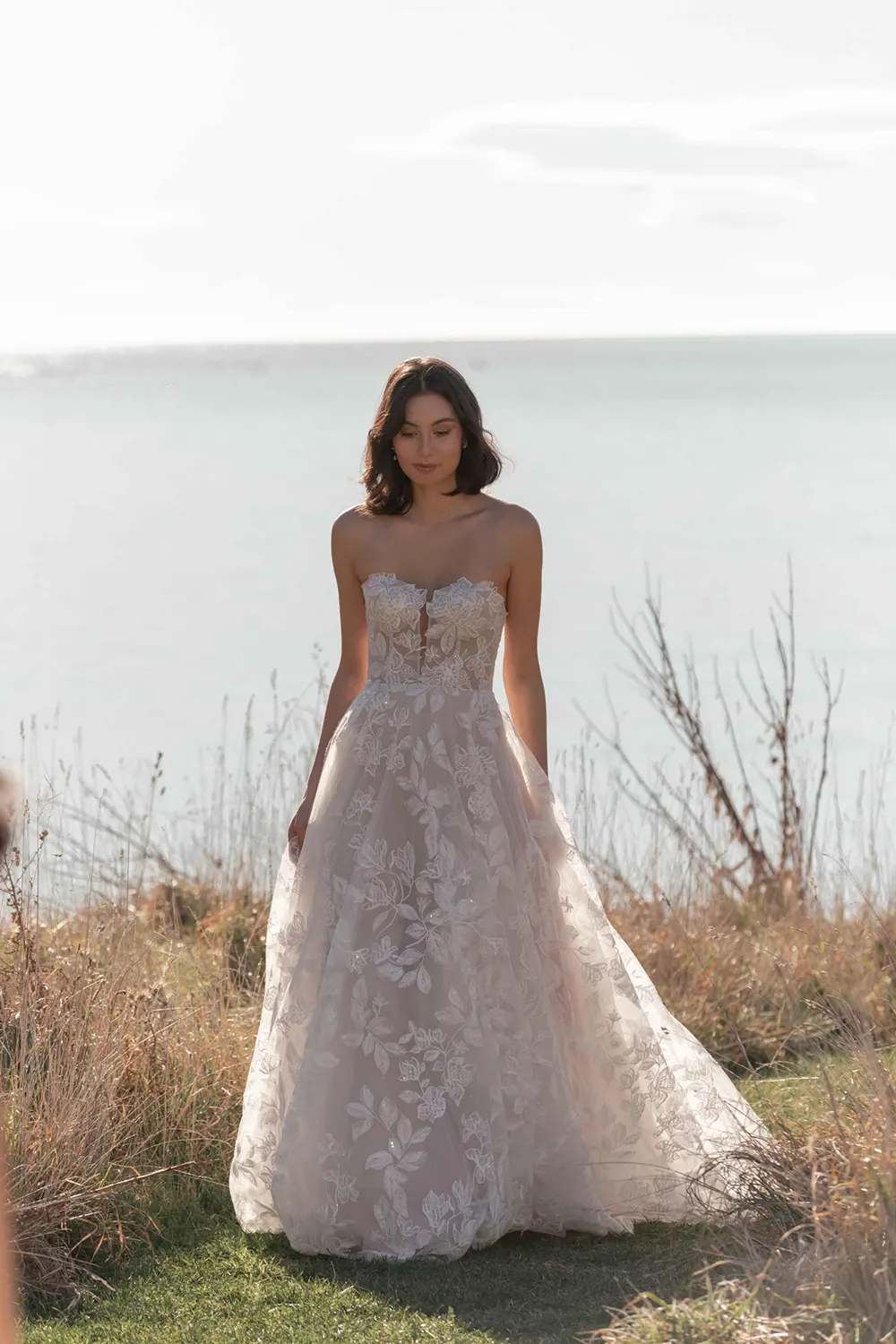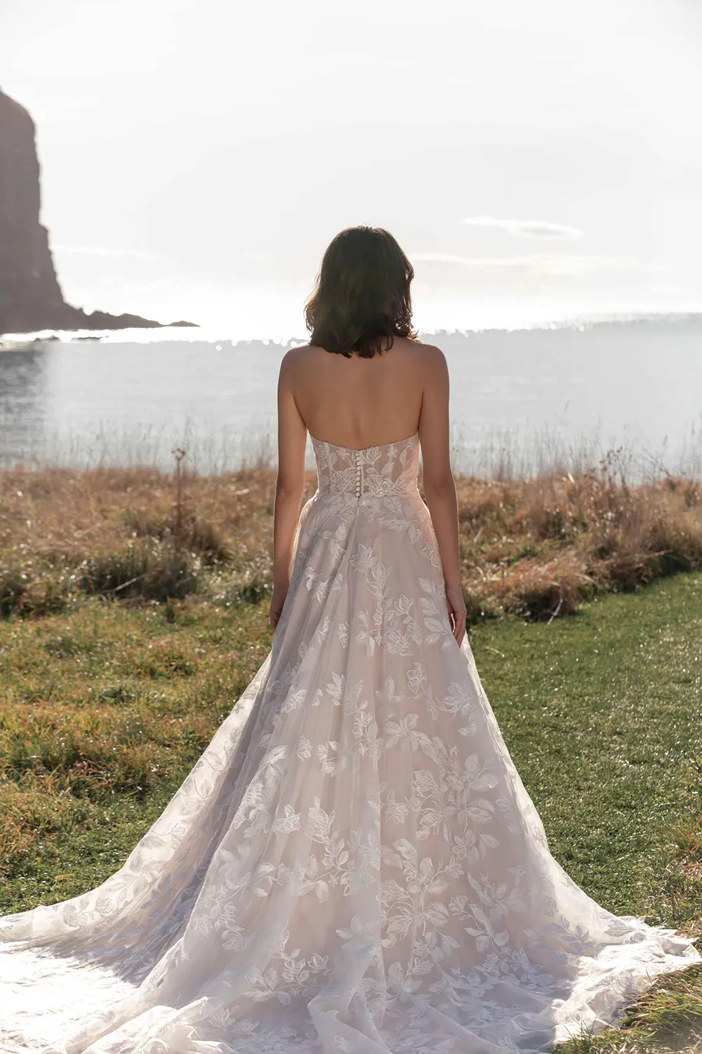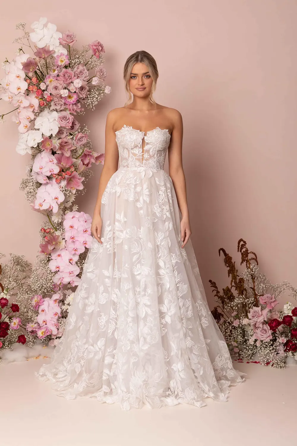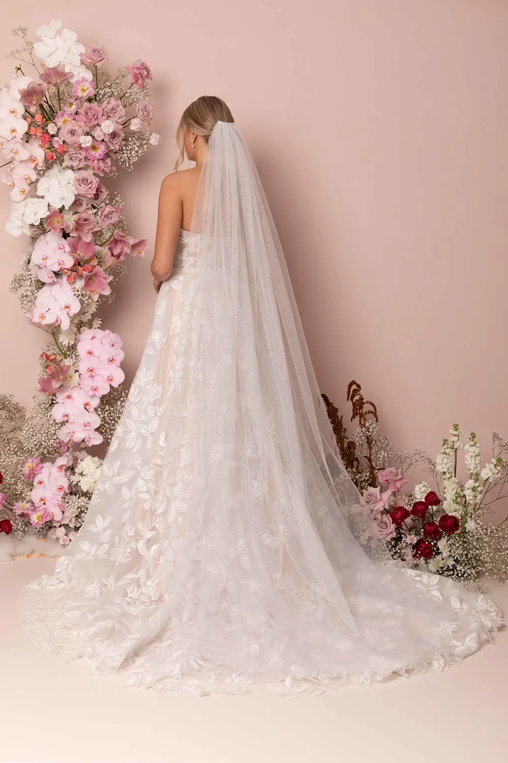 Spitze bedeckt das gesamte Brautkleid Kyann von Madi Lane und macht es dadurch zum ultimativen Boho-Traum. Das großformatige, florale Motiv ist zusätzlich mit Pailletten verziert. Der Entwurf funkelt außerdem durch den Einsatz von Glitzertüll. Am transparenten, trägerlosen Oberteil erzeugen sichtbar eingearbeitete Stäbchen einen Mieder-Look. Die Rückseite ist mit einer kurven Knopfleiste versehen. Darunter fächert sich die zartrosa gefütterte Rockpartie auf und schließt mit einer breiten Schleppe ab. Der zum Brautkleid passende Schleier ist separat erhältlich.