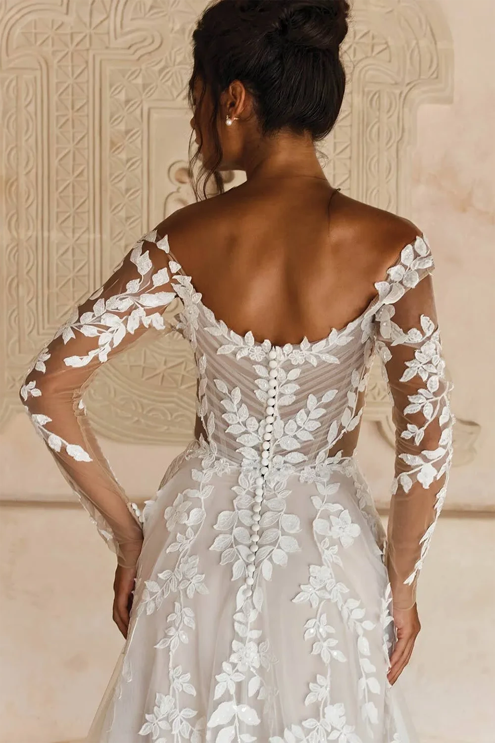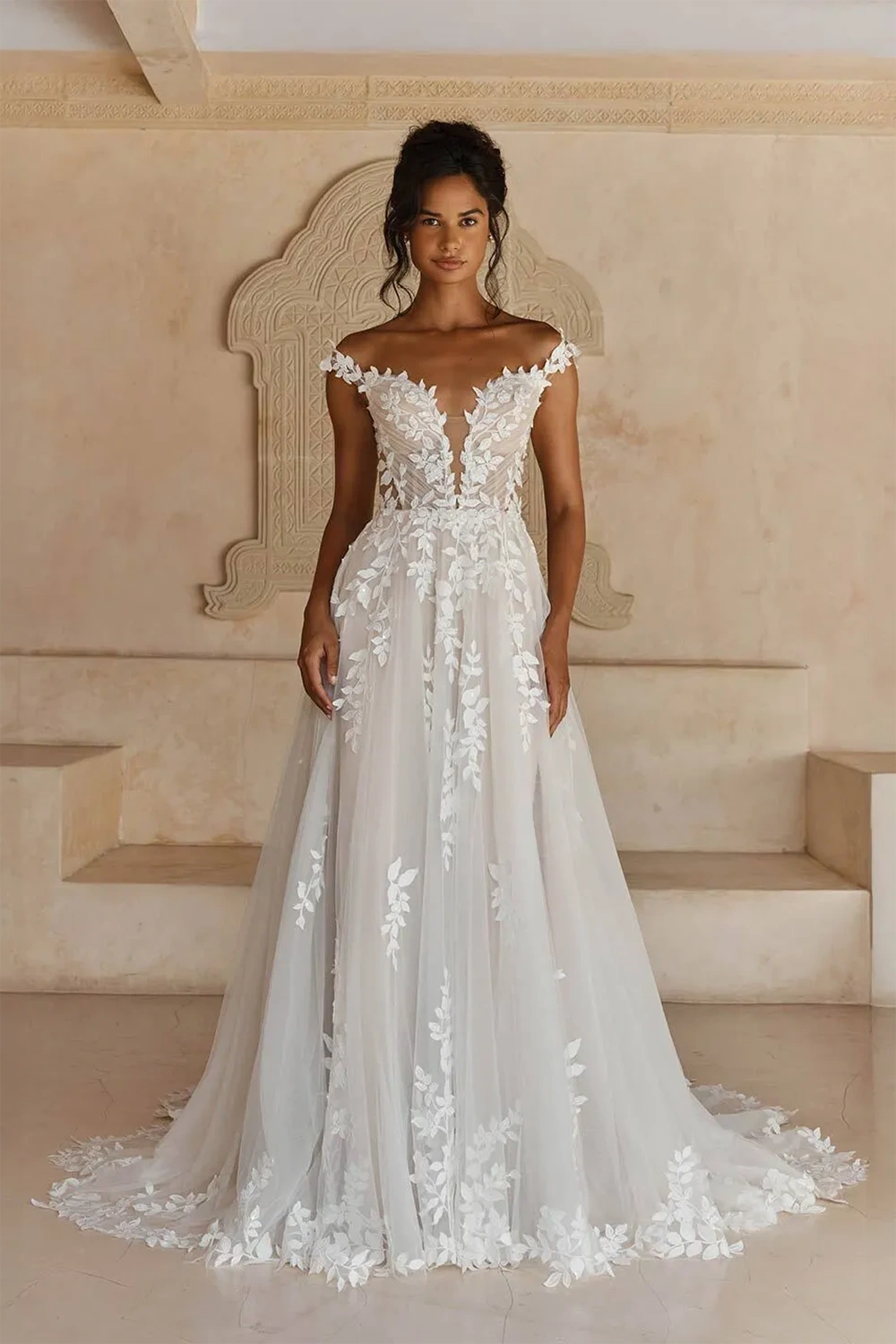Das Brautkleid Landon von Madi Lane ist ein romantisches A-Linien Brautkleid mit einem U-Boot Ausschnitt und floralen Spitzenapplikatione .