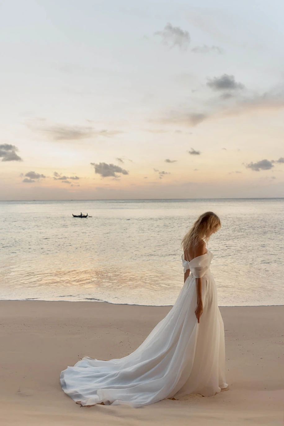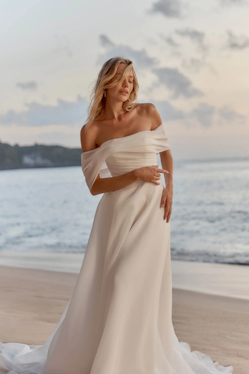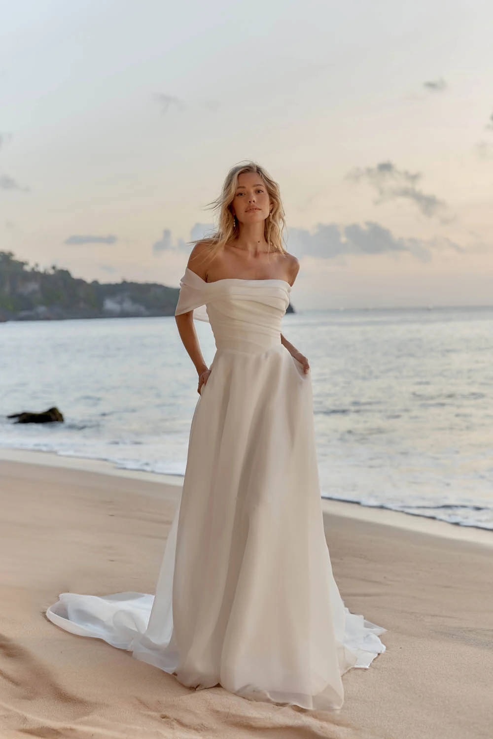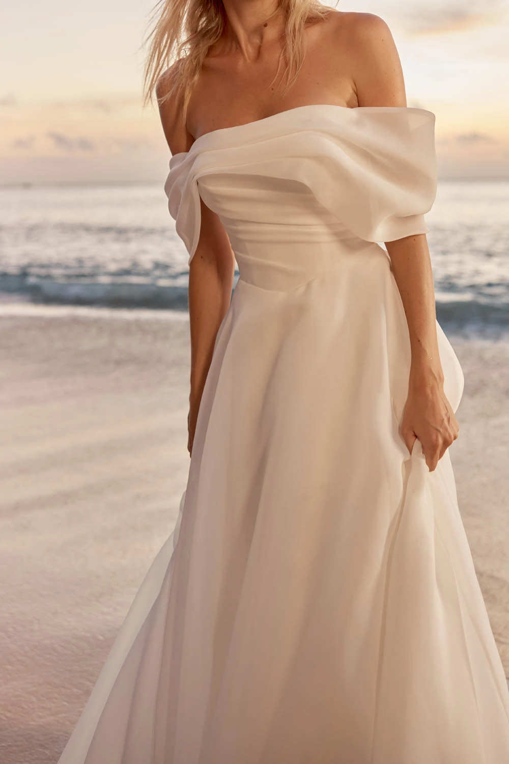 Das Modell Lissy von Madi Lane ist ein cleanes A-Linien Kleid aus einem feinem Organza, die breiten Carmenträger werden hier zum Blickfang des Oberteils.