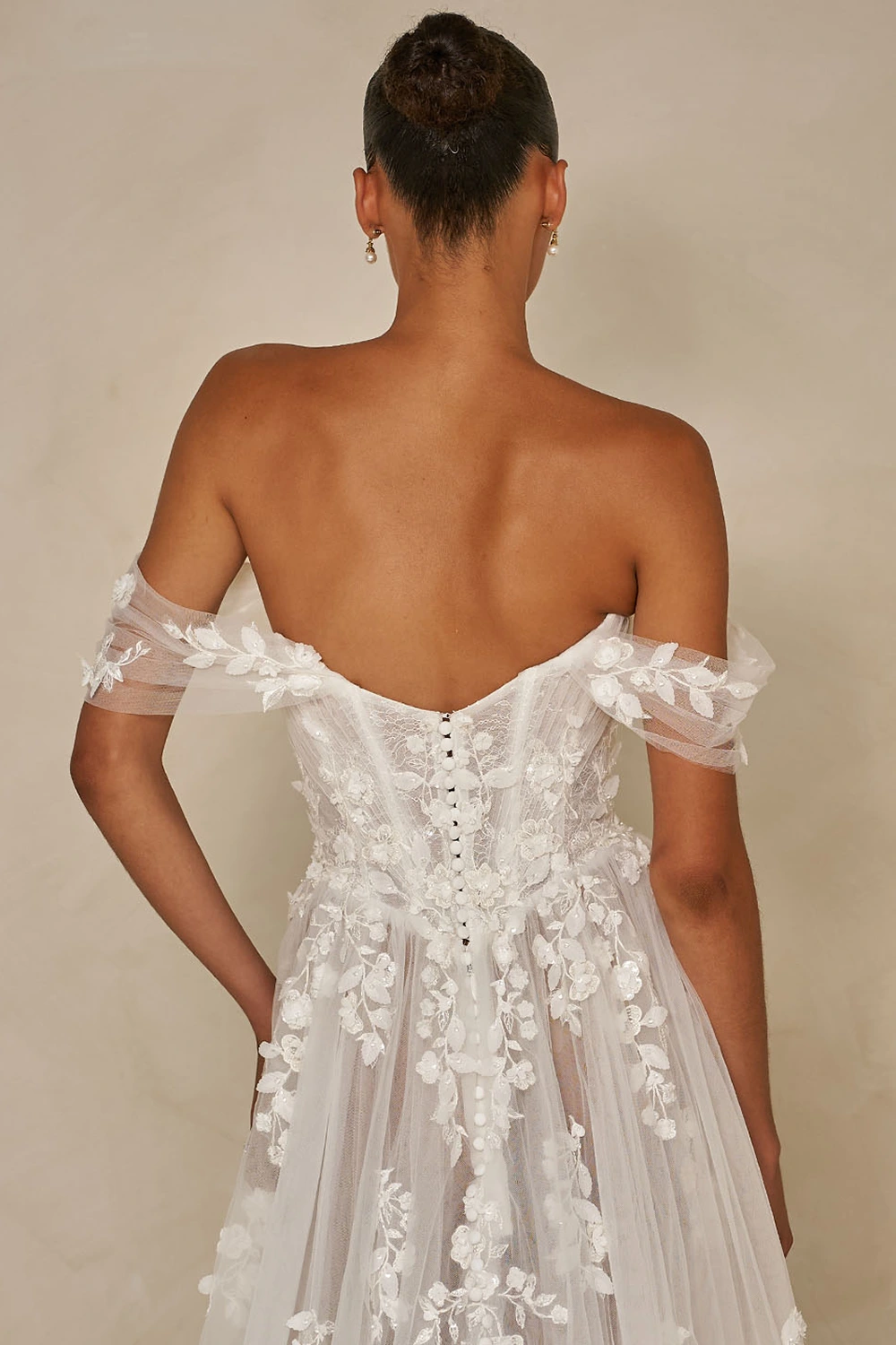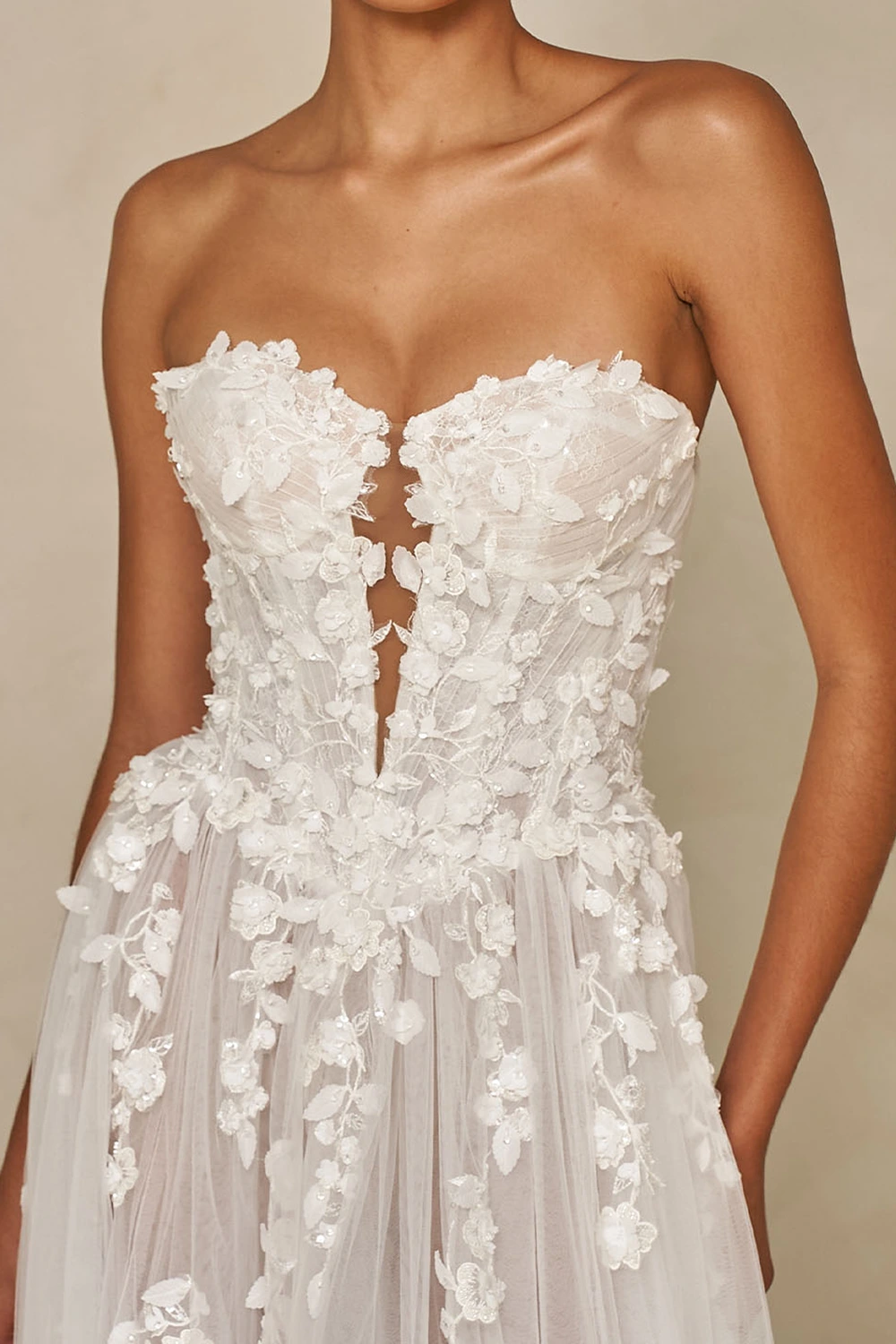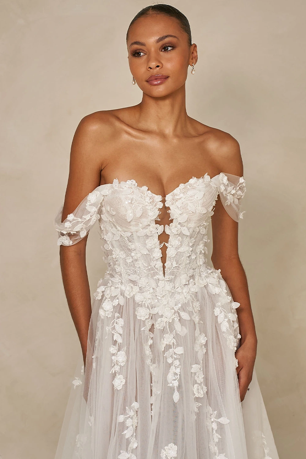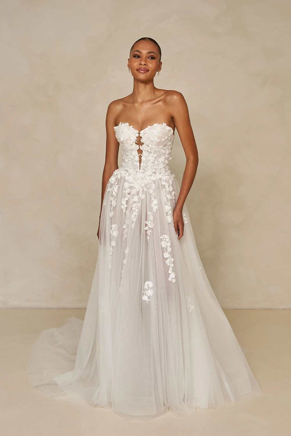 Das Modell Watkins von Madi Lane ist ein romantisches A-Linien Brautkleid mit 3D-Blüten Applikationen und tiefen Ausschnitt.