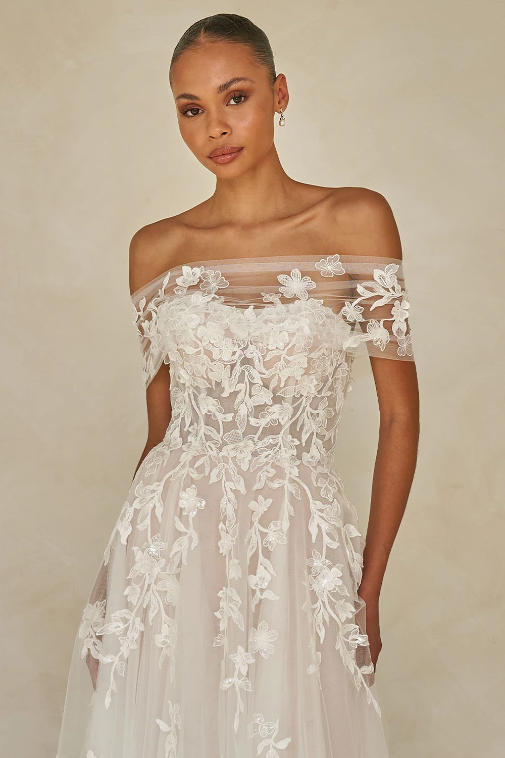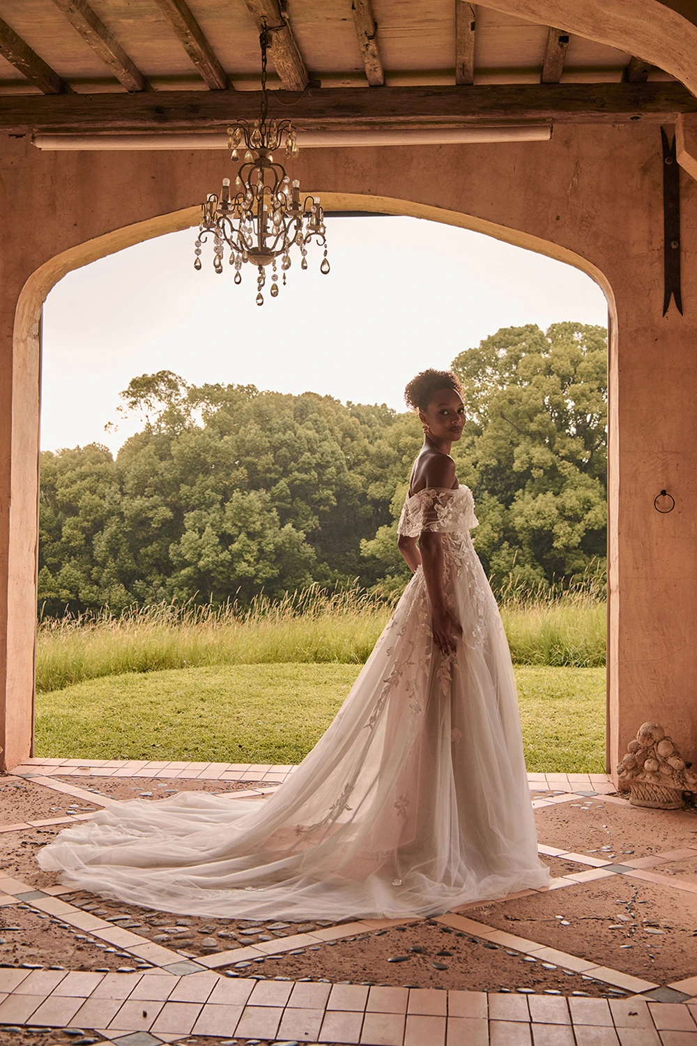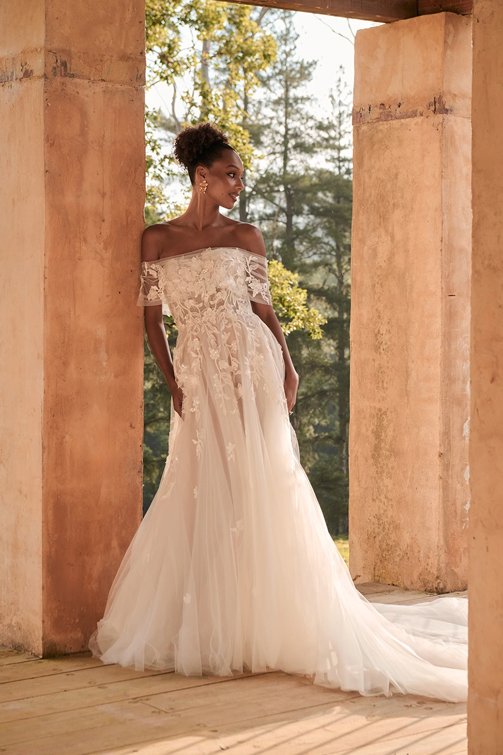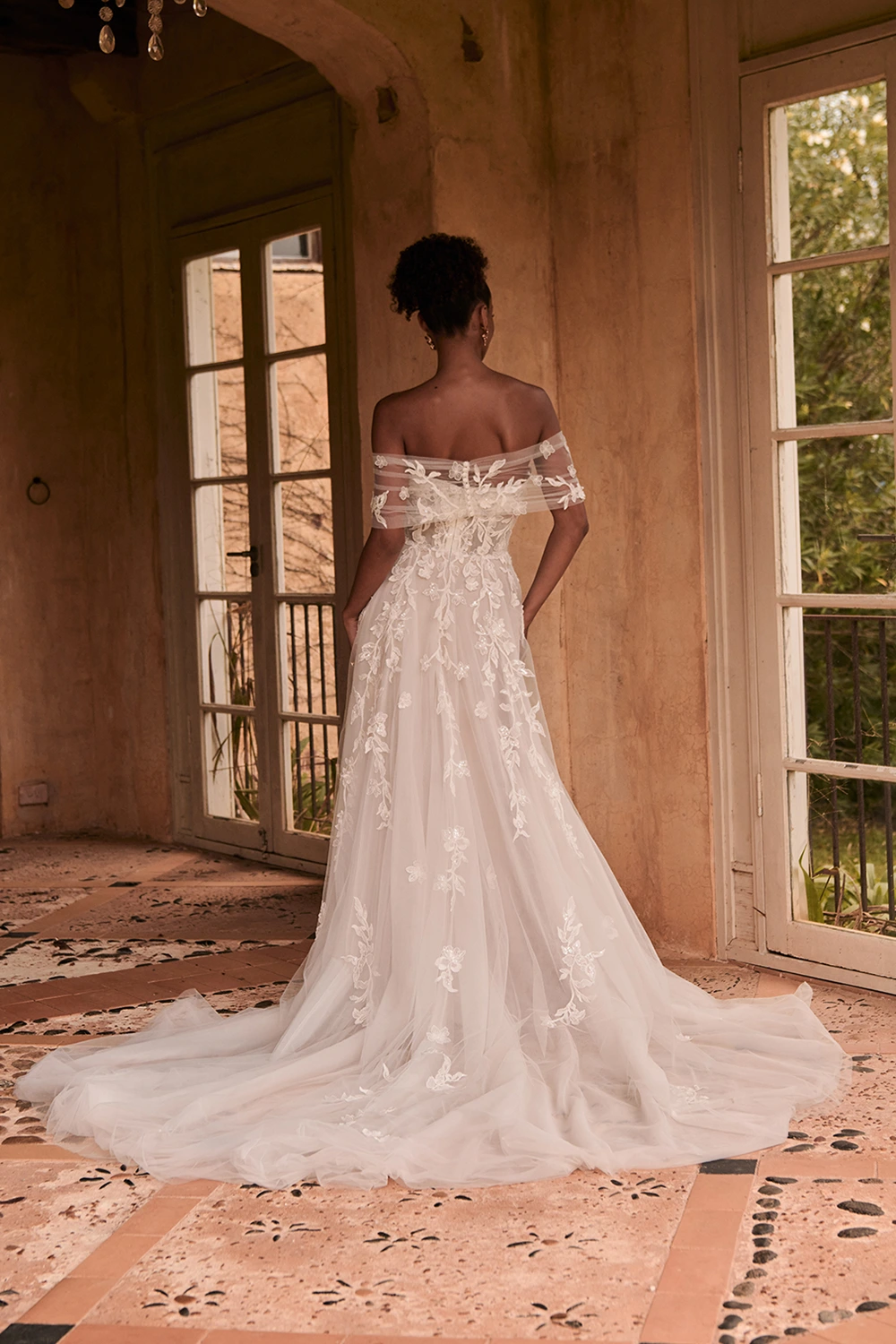 Das Modell Willa von Madi Lane ist ein verträumtes A-Linien Brautkleid mit floralen Applikationen die in den Rock fließen.