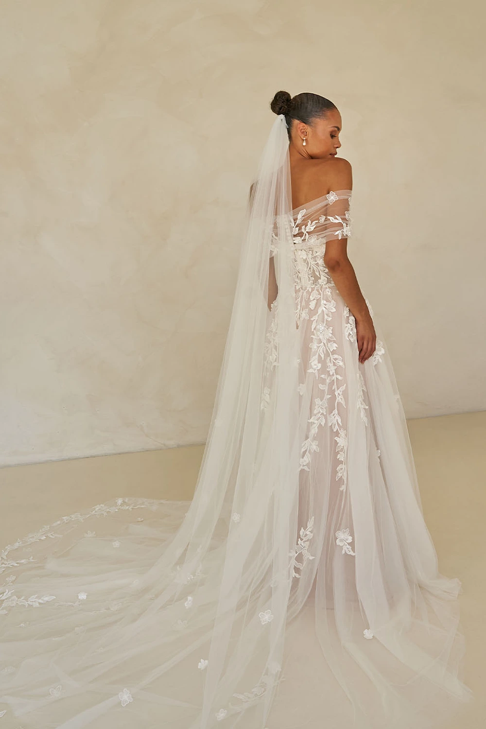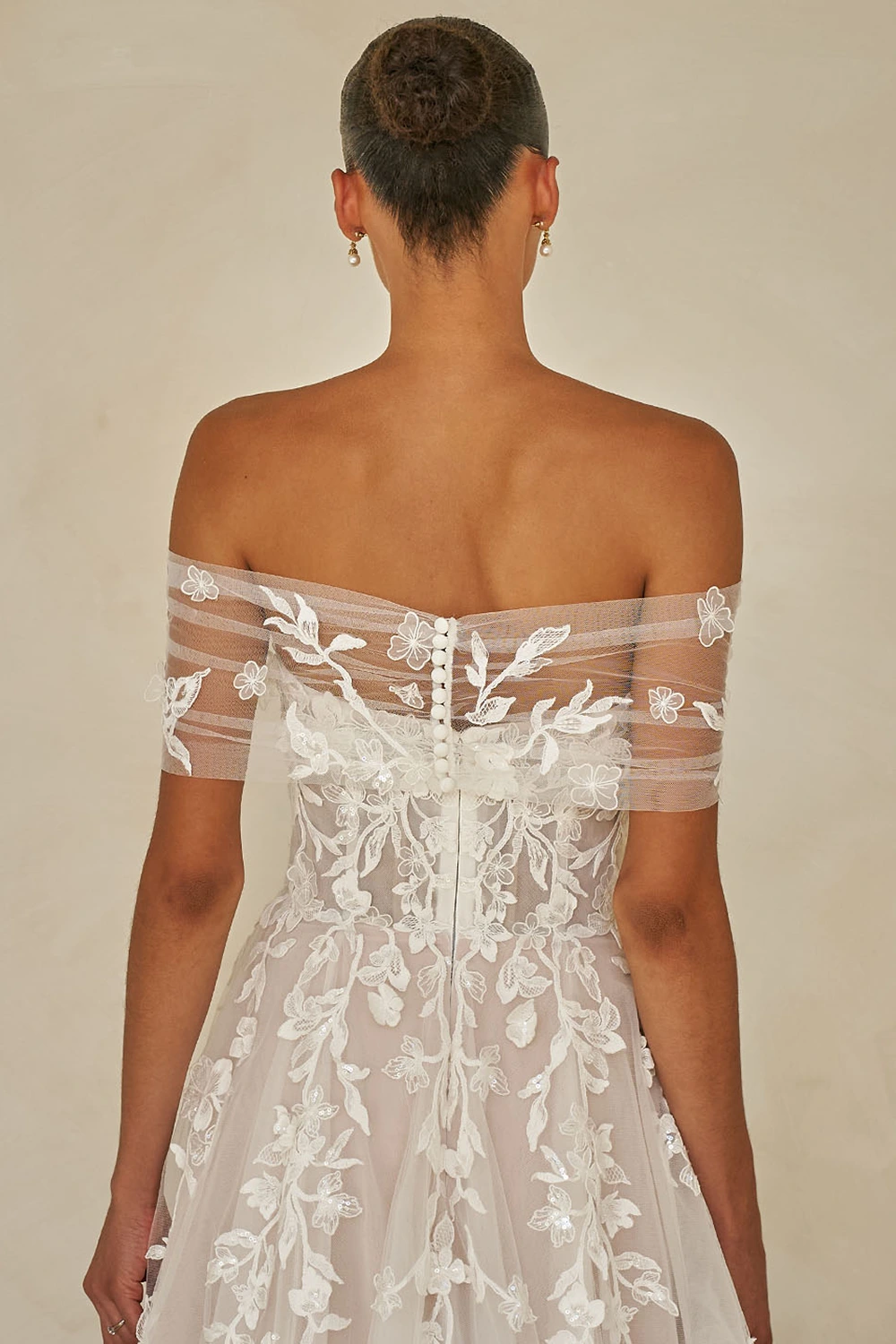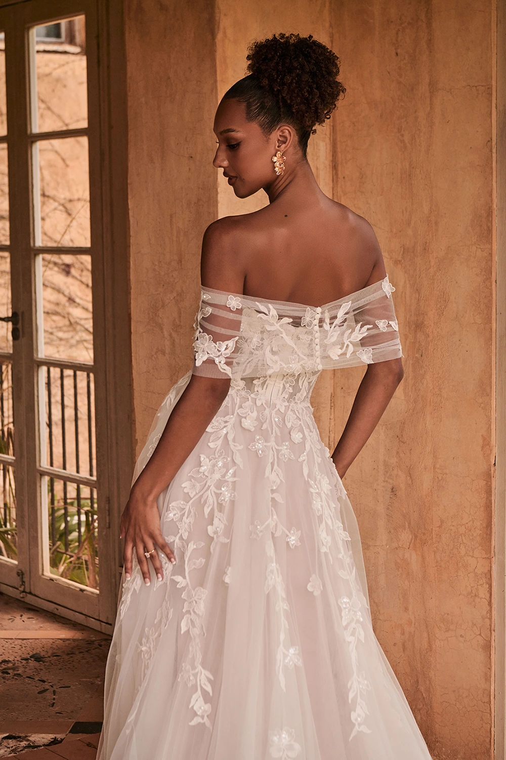 Das Modell Willa von Madi Lane ist ein verträumtes A-Linien Brautkleid mit floralen Applikationen die in den Rock fließen.