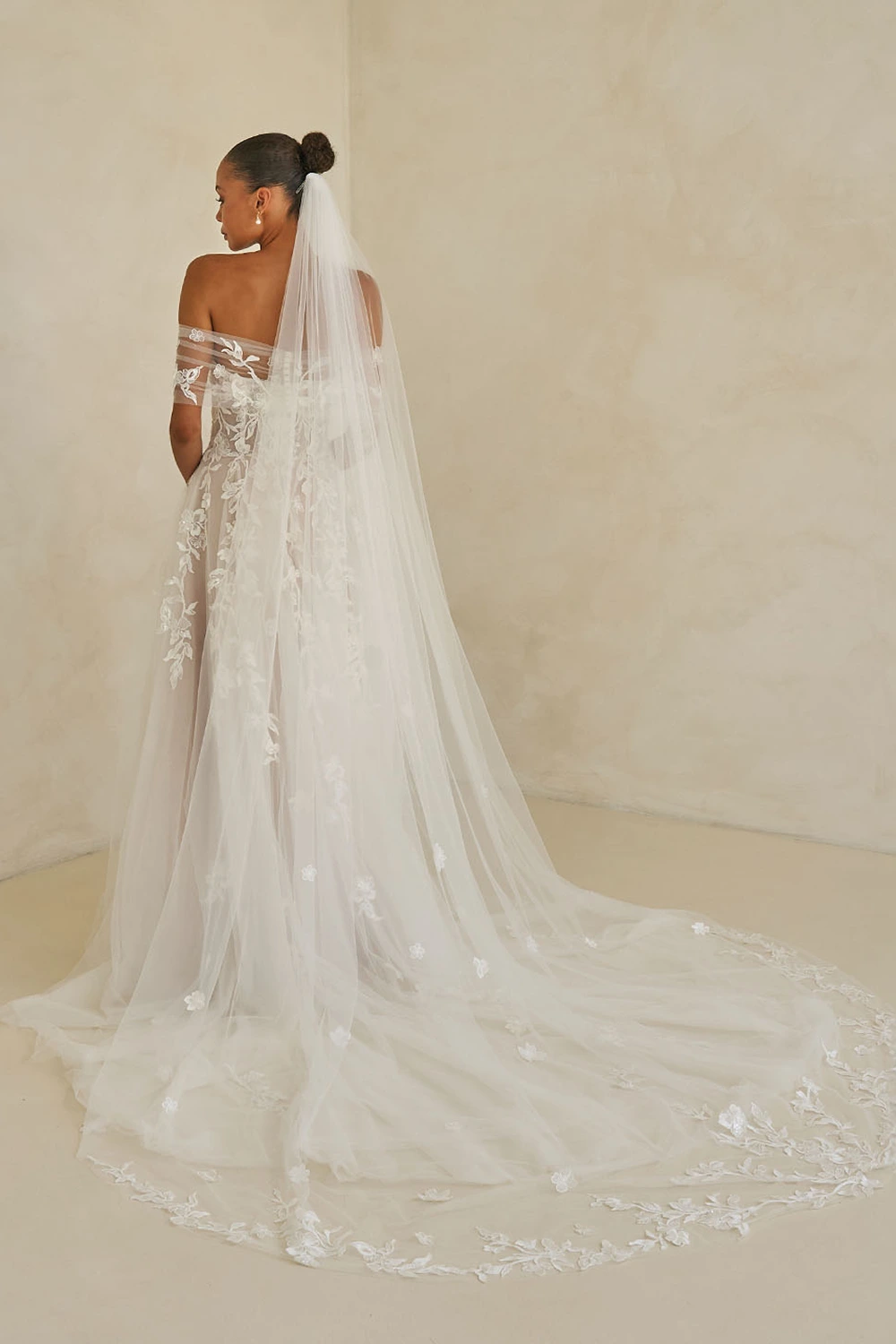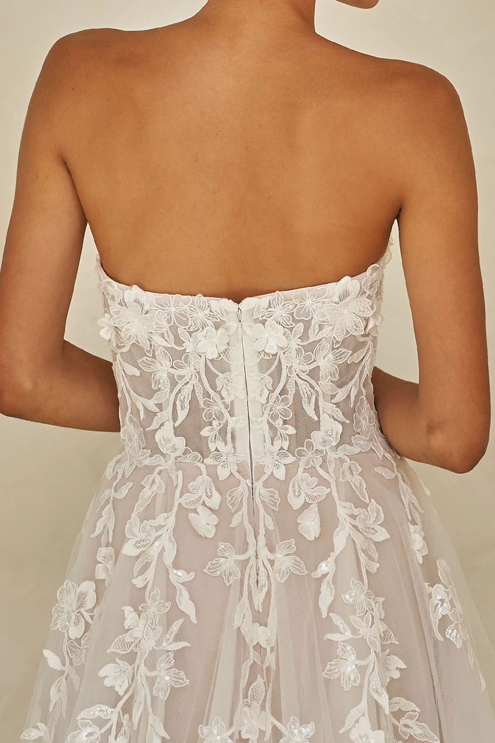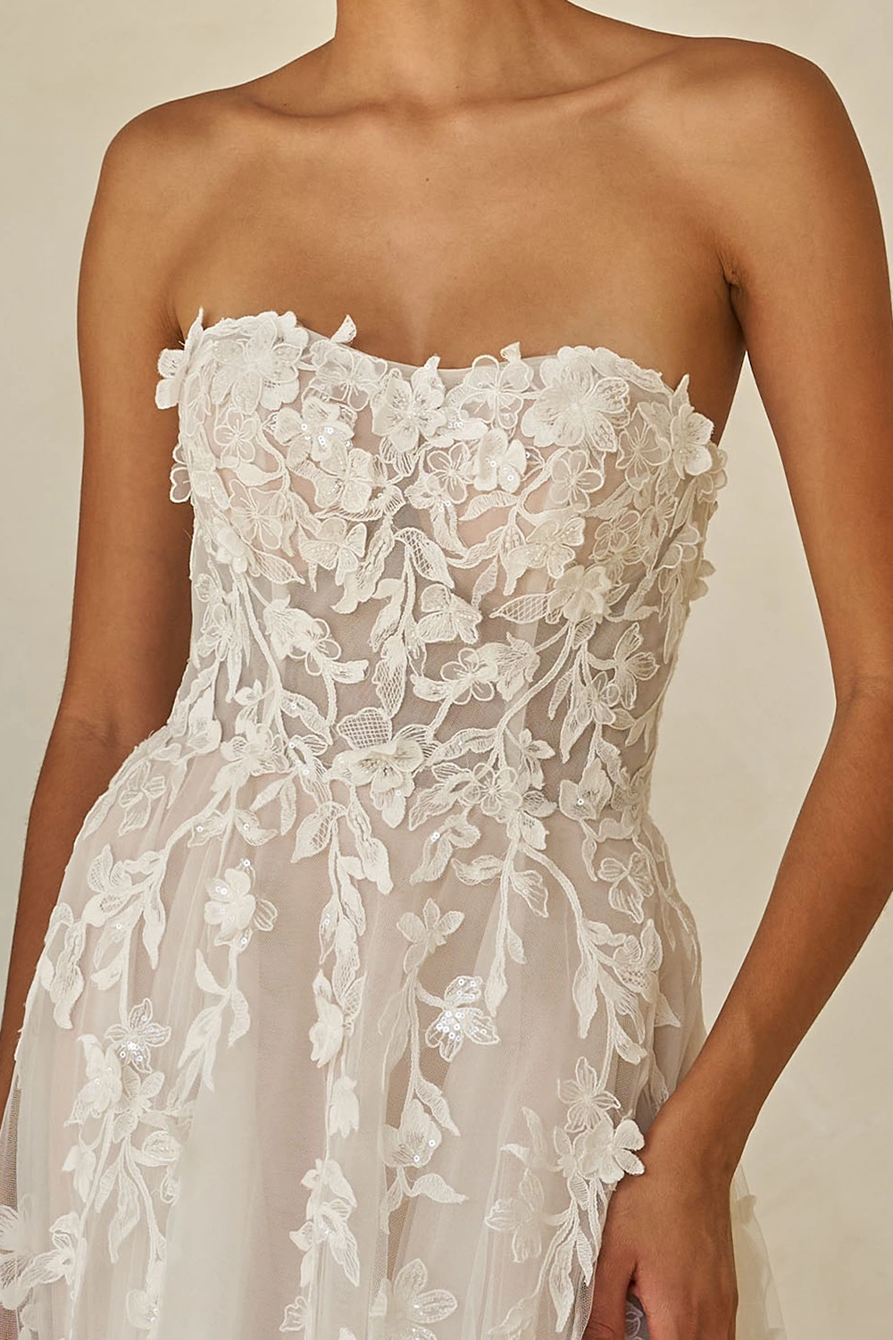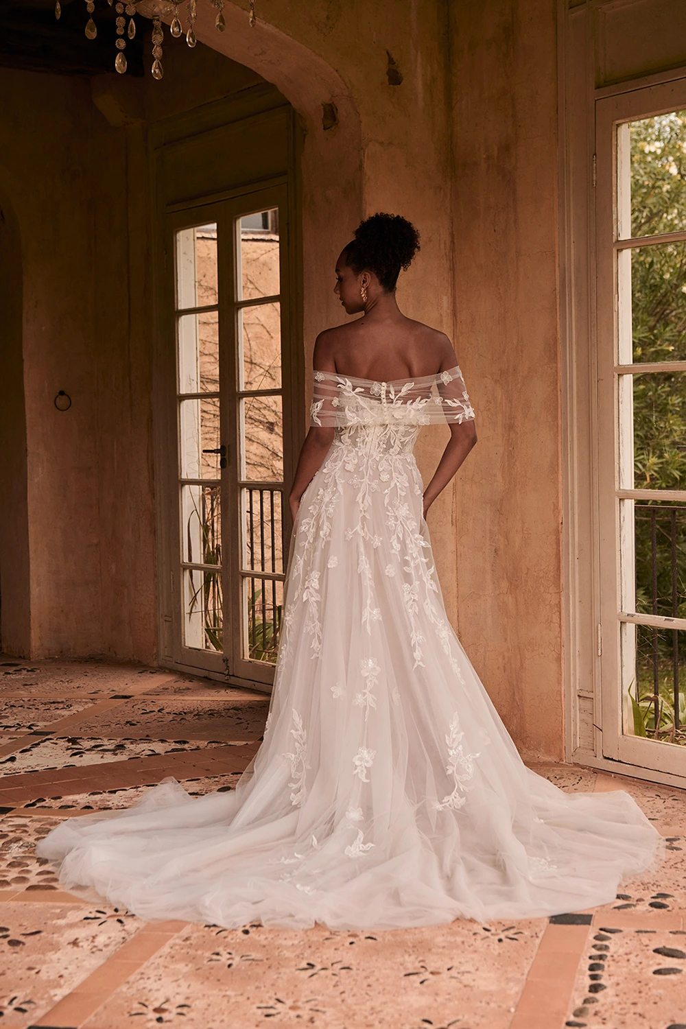 Das Modell Willa von Madi Lane ist ein verträumtes A-Linien Brautkleid mit floralen Applikationen die in den Rock fließen.