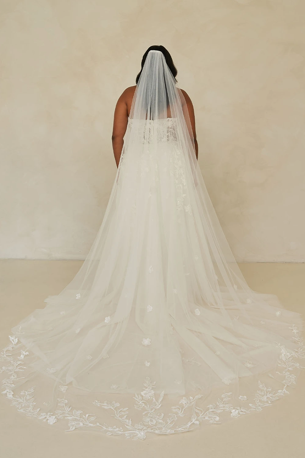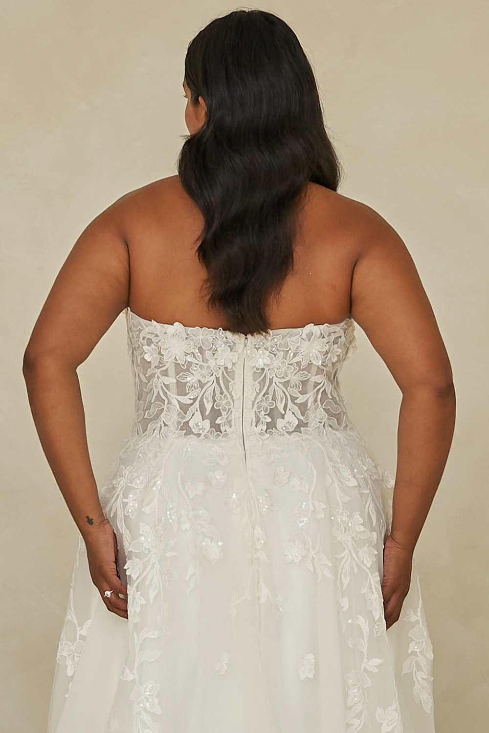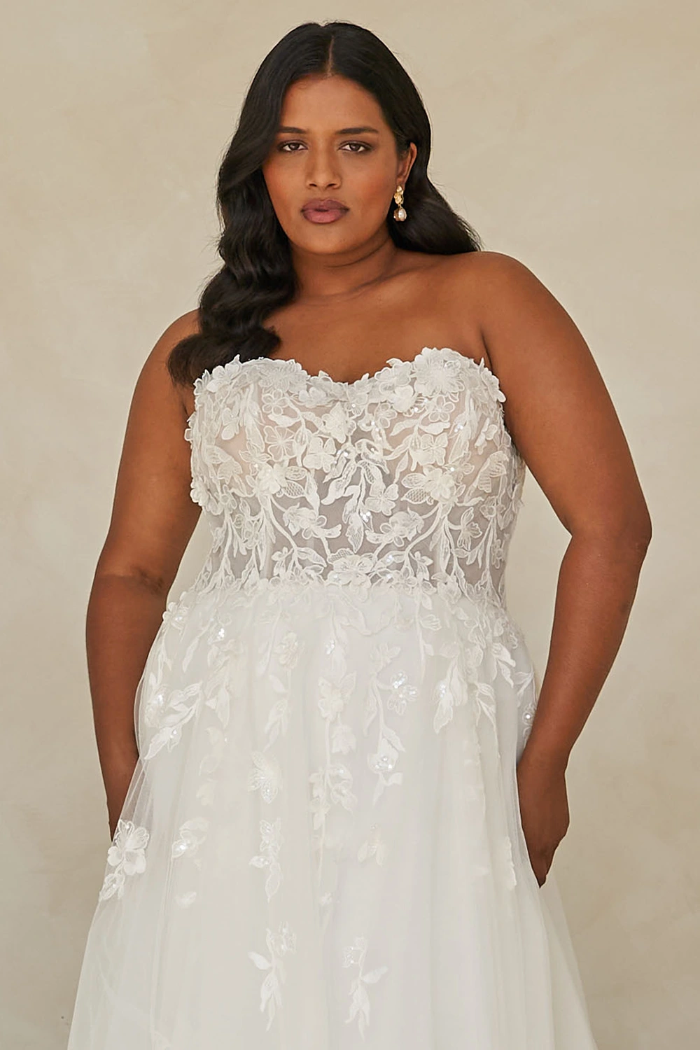 Das Modell Willa Curvy von Madi Lane ist ein verträumtes A-Linien Brautkleid mit floralen Applikationen.