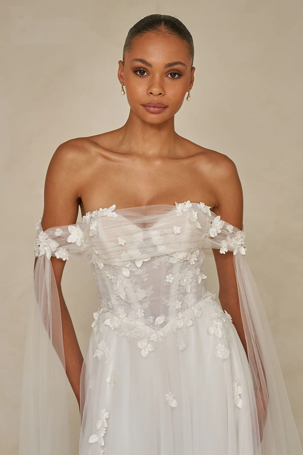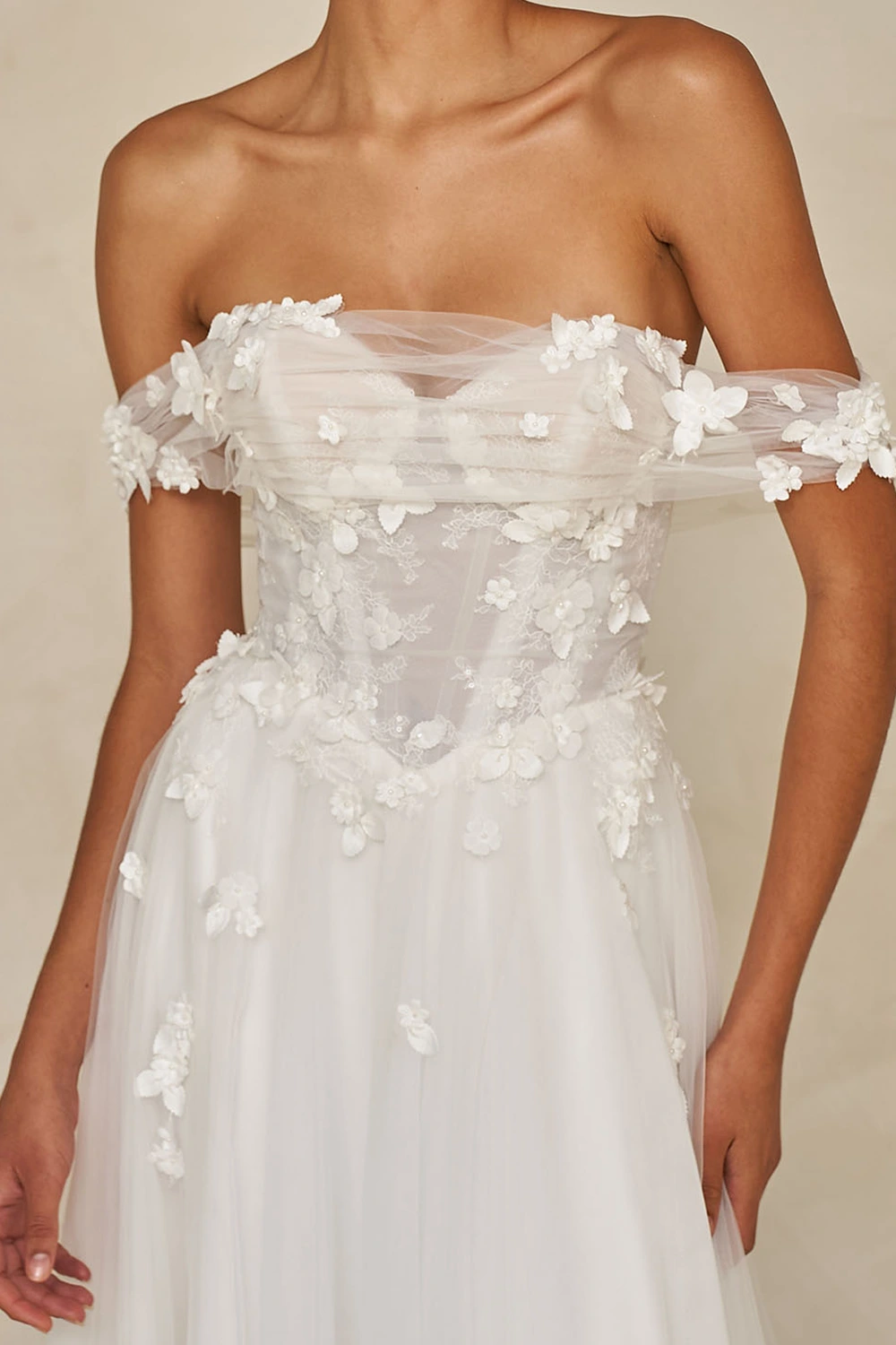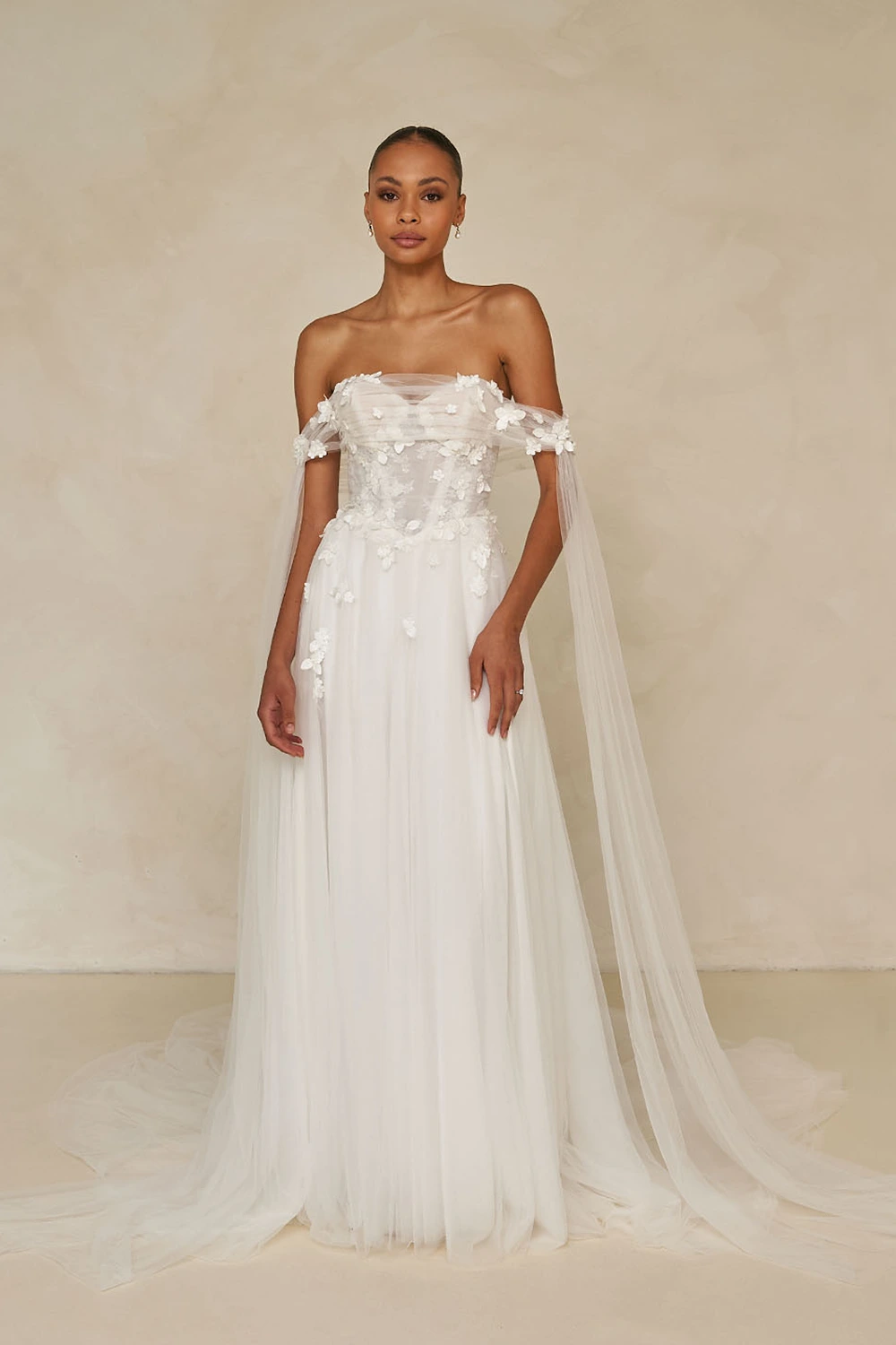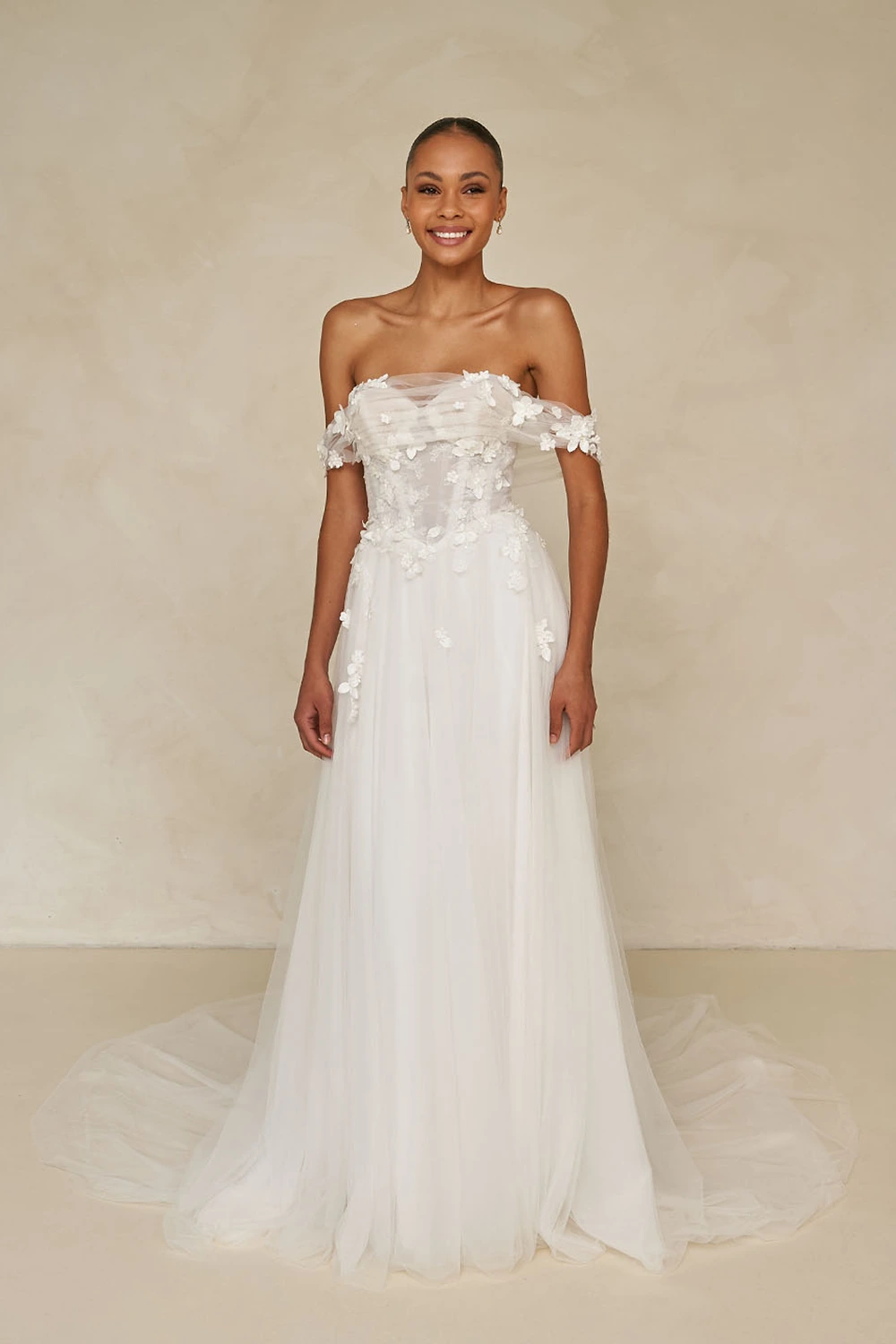Das Modell Wrenley von Madi Lane ist ein leichtes A-Linien Brautkleid aus zartem Softtüll und einer Corsage mit 3D Blüten.