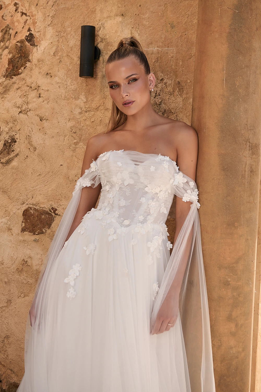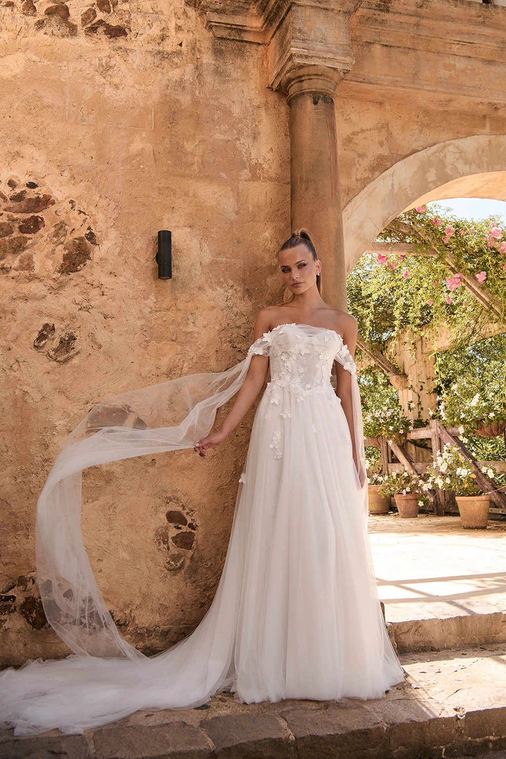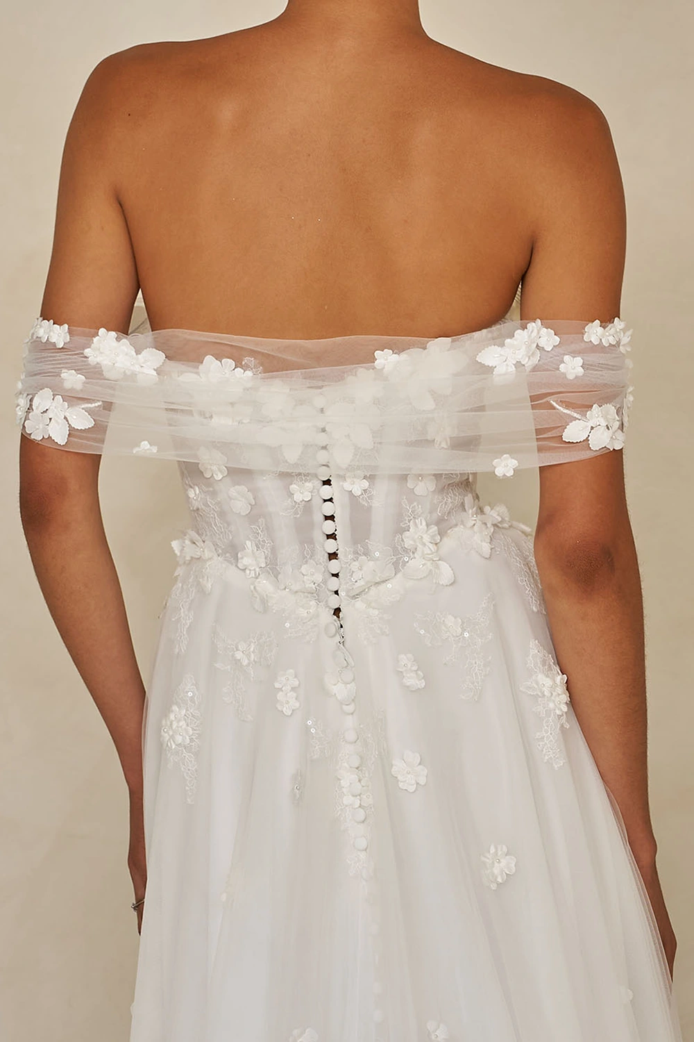 Das Modell Wrenley von Madi Lane ist ein leichtes A-Linien Brautkleid aus zartem Softtüll und einer Corsage mit 3D Blüten.