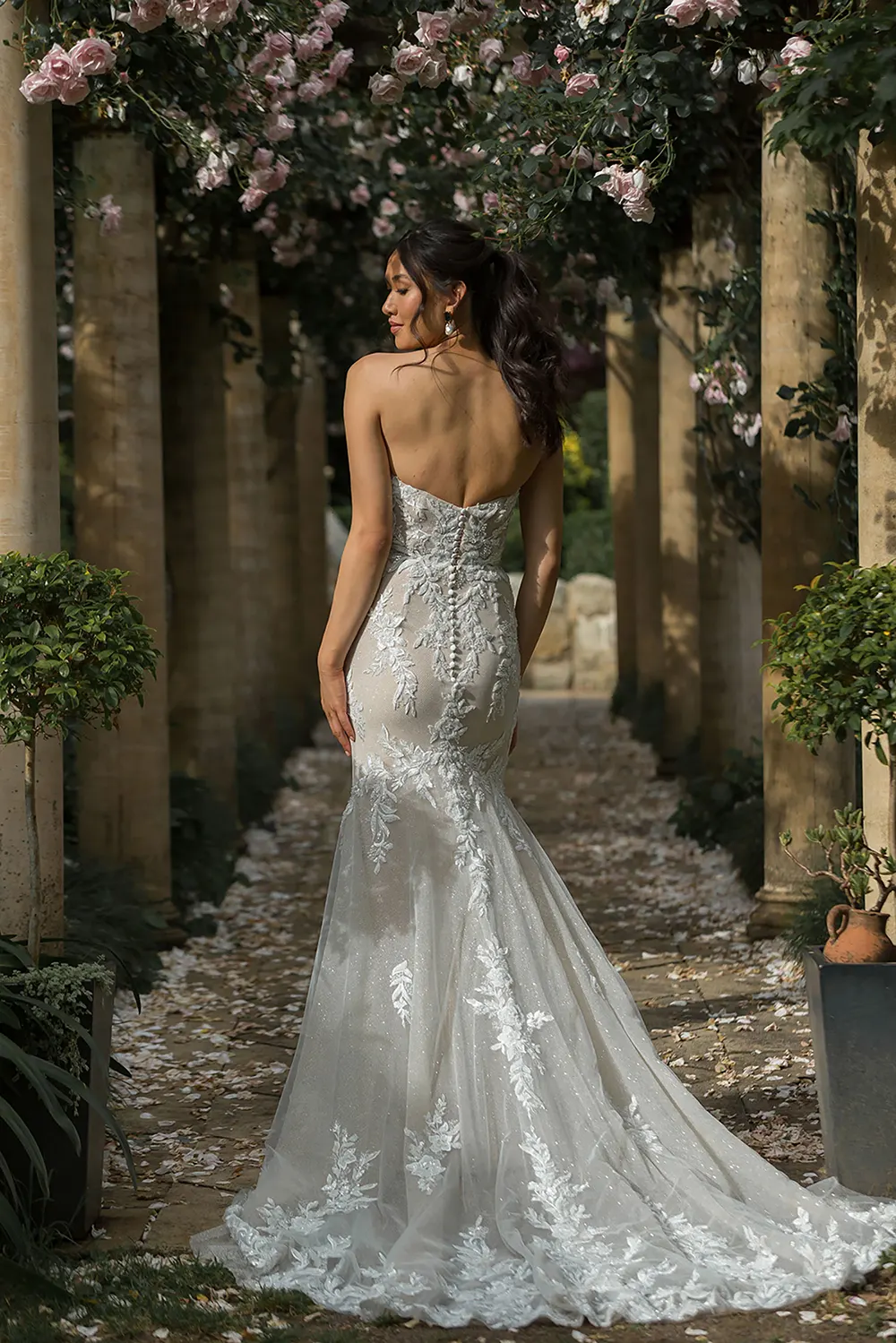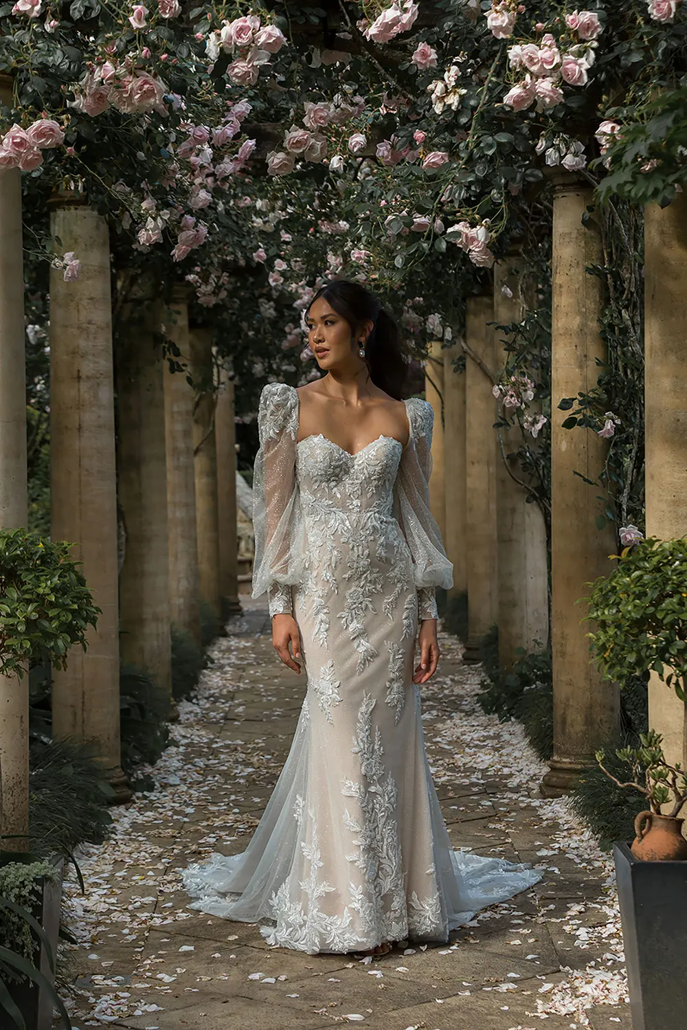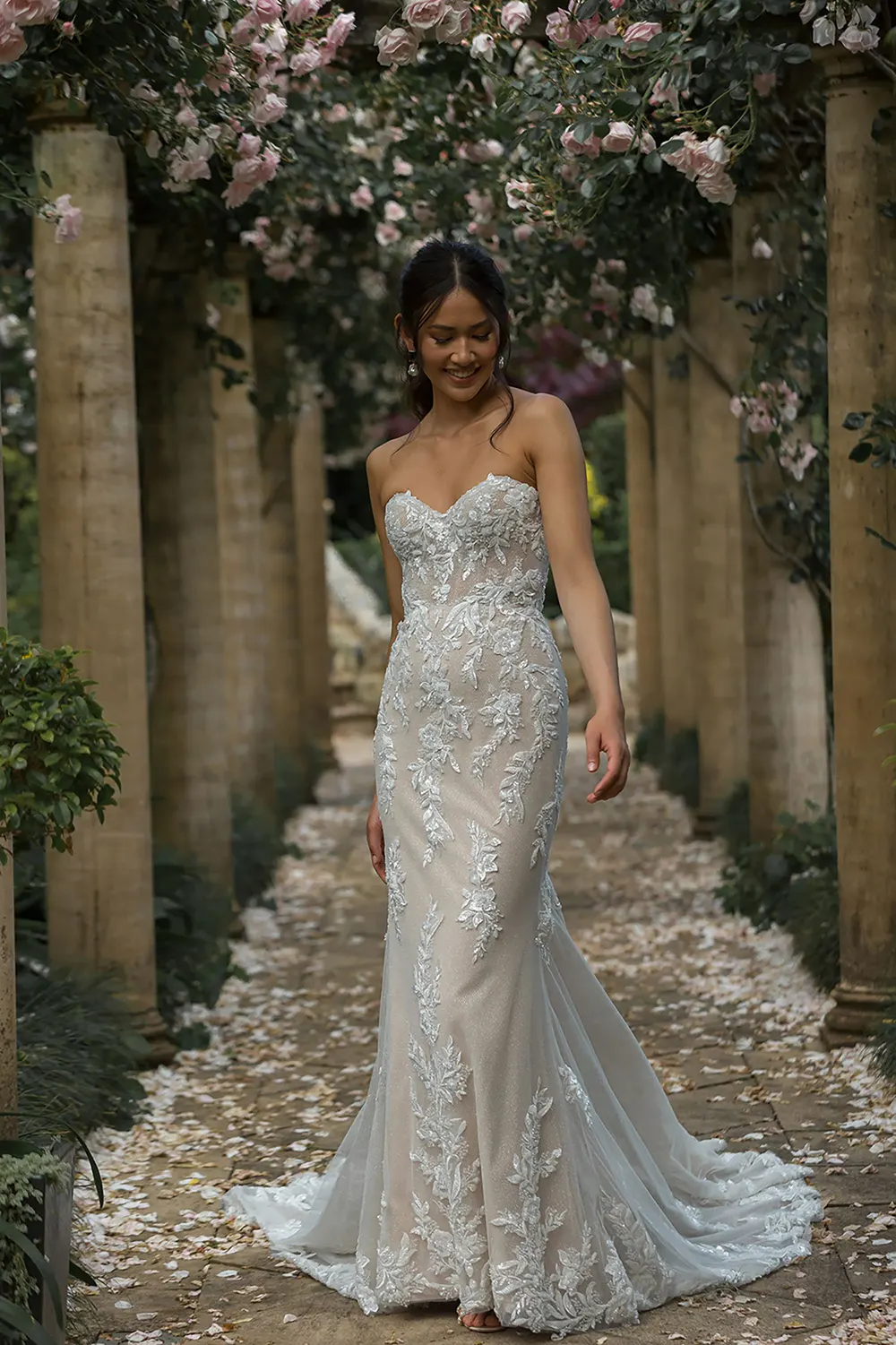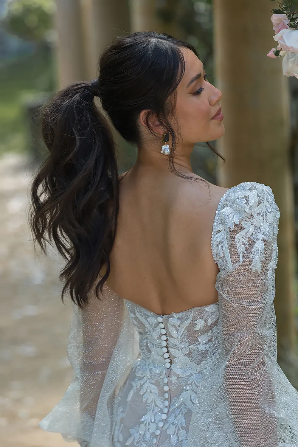 - botanisch inspirierte Spitze, kunstvoll platzierte Pailletten und Perlen