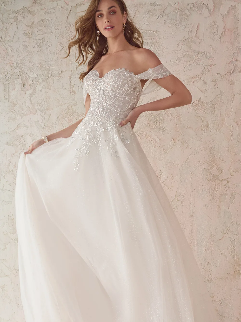 Das Brautkleid Artemis von Maggie Sottero verströmt eleganten Glamour. Seine klassische Silhouette bekommt durch die Fertigung aus Glitzertüll einen modernen Look. Das Mieder aus semitransparentem Organza ist mit einem Mix aus floraler und barocker Spitze bedeckt. Das Muster ist zusätzlich über und über mit Perlen und Pailletten verziert. Das Modell kann trägerlos oder mit seitlichen Trägern im Carmen-Stil getragen werden. Am geraden Rückenausschnitt verläuft eine Knopfleiste mit Kristallknöpfen. Der gefütterte Rock aus Glitzertüll endet in einer charmant-schlichten Hofschleppe.