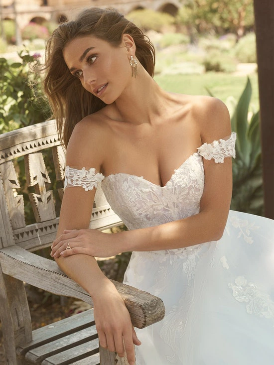 Harlem von Maggie Sottero ist das perfekte Prinzessin-Brautkleid für moderne Bräute. Sein semitransparentes Oberteil aus Organza besitzt Stickereien aus moderner floraler Spitze und Pailletten sowie seitliche Träger im Carmen-Stil, deren Elastizität Bewegungsfreiheit bietet. Zudem sind die Stäbchen des Mieders trendgemäß sichtbar eingearbeitet. Am tiefen Rückenausschnitt verdeckt eine Knopfleiste den darunter verlaufenden, praktischen Reißverschluss. Der mehrlagige Tüllrock fließt voluminös zu Boden und schließt mit einer Kapellenschleppe ab.