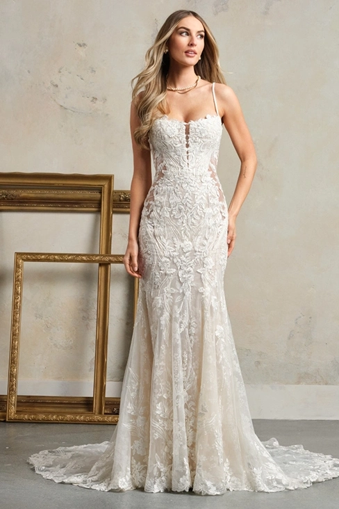 Das Brautkleid Admina von Maggie Sottero ist ein sehr raffiniertes und sexy Meerjungfrauen Brautkleid mit tiefen seitlichen Cut-Outs.
