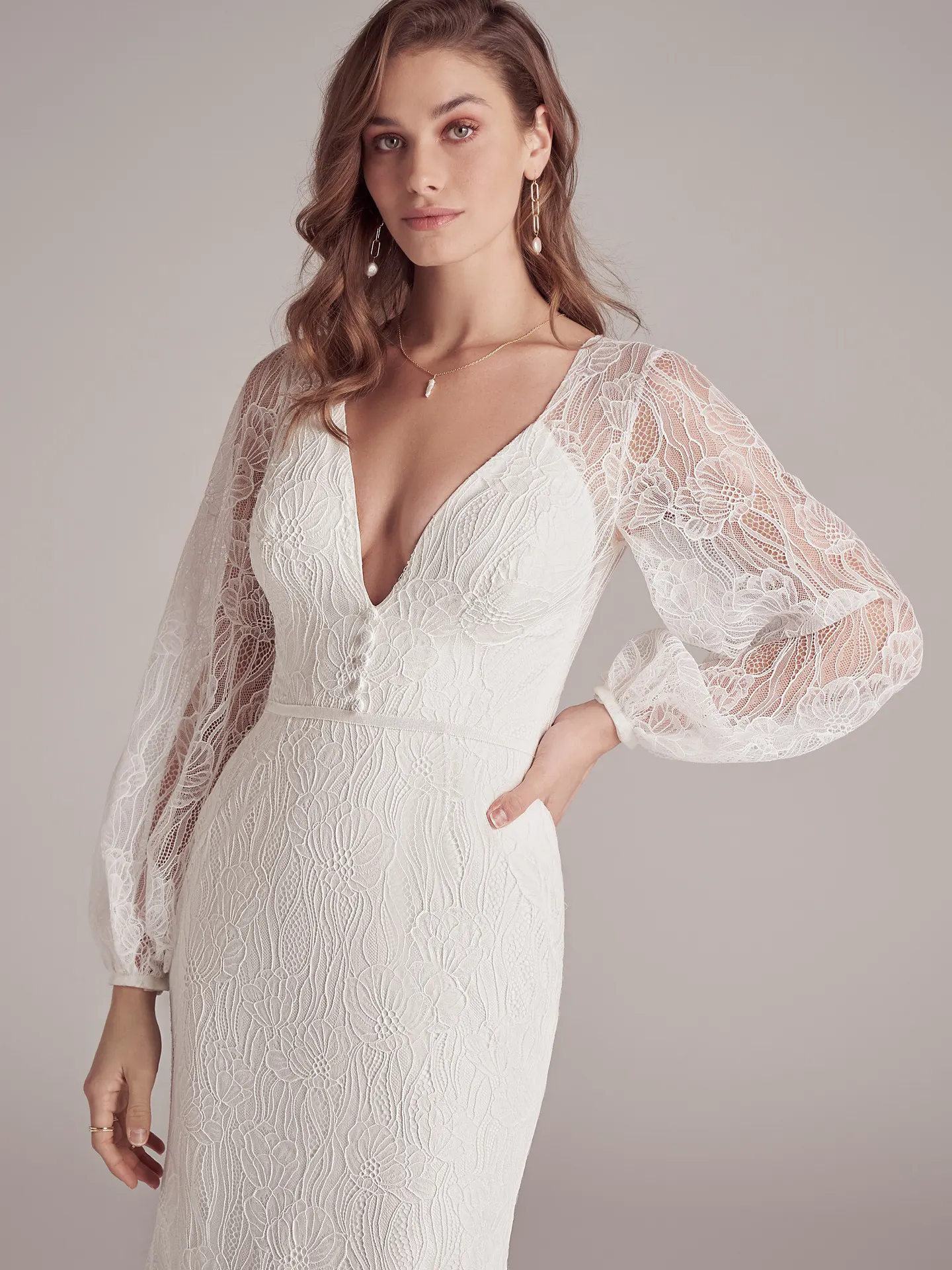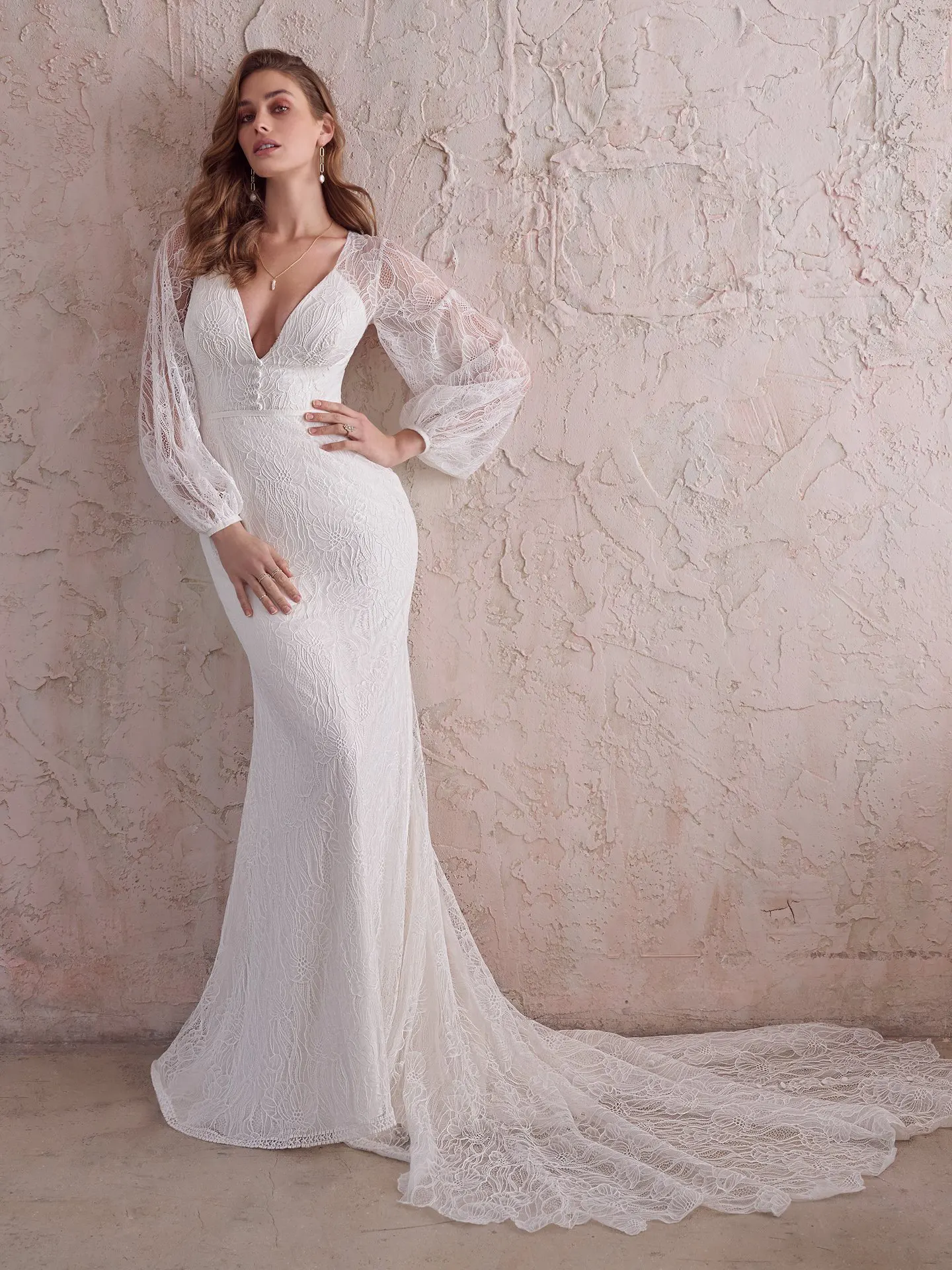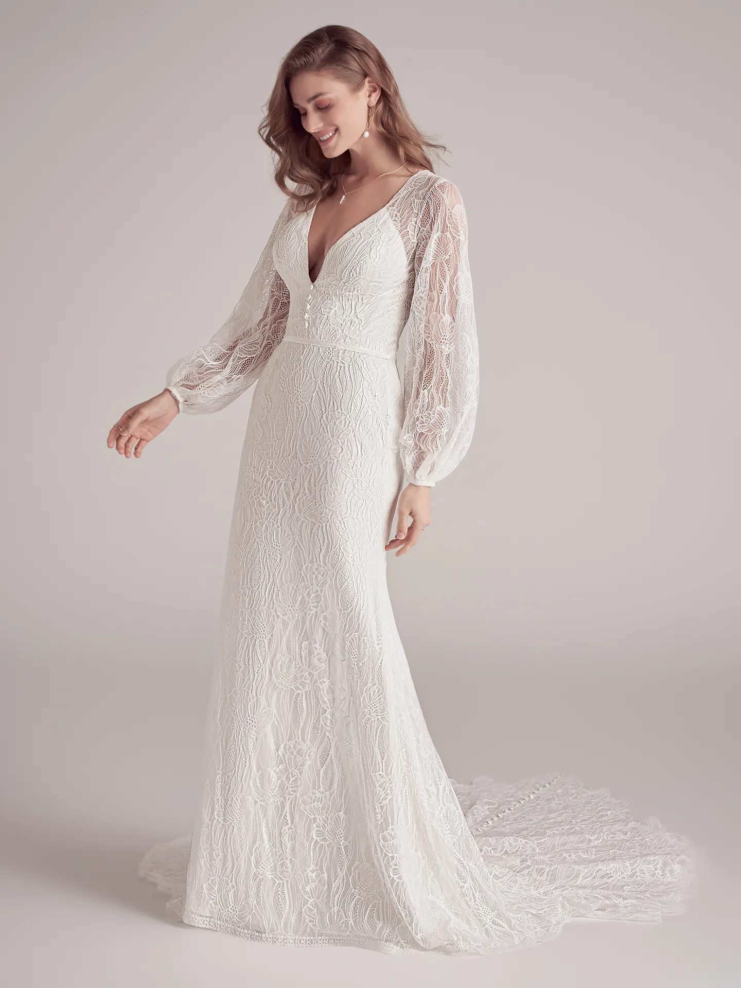 Maggie Sottero hat mit Jeanette ein modernes Brautkleid im Mix aus Vintage und Boho geschaffen. Der schmale Entwurf ist mit strahlend weißem Satin gefüttert und von moderner, großformatiger Blütenspitze bedeckt. Die Bischofsärmel geben einen leicht voluminösen Kontrast. Eine kurze Knopfleiste ist vorne am Kummerbund platziert; eine lange Knopfleiste reicht von der transparenten Rückenpartie bis zum Saum der spitz zulaufenden Schleppe.
