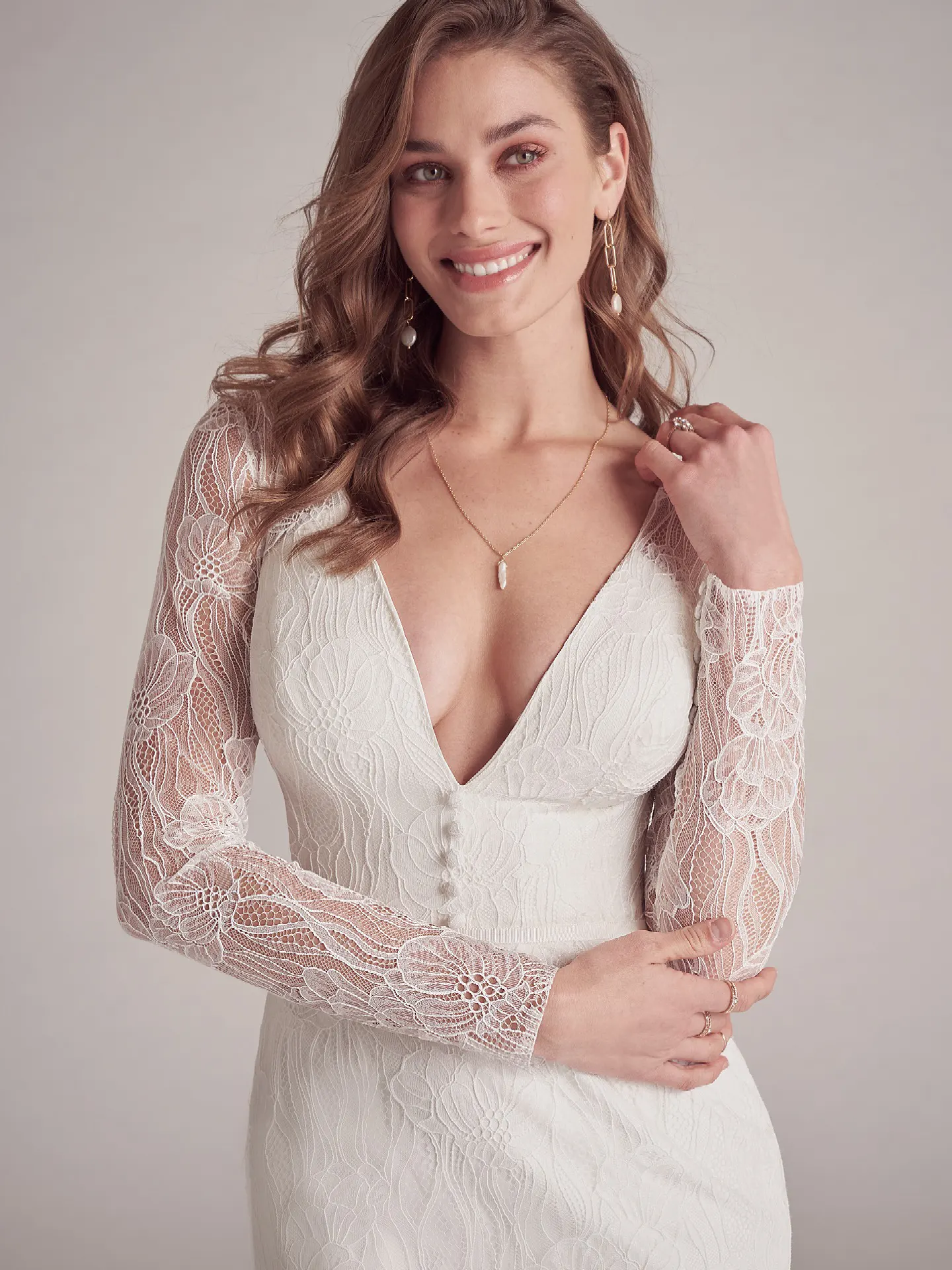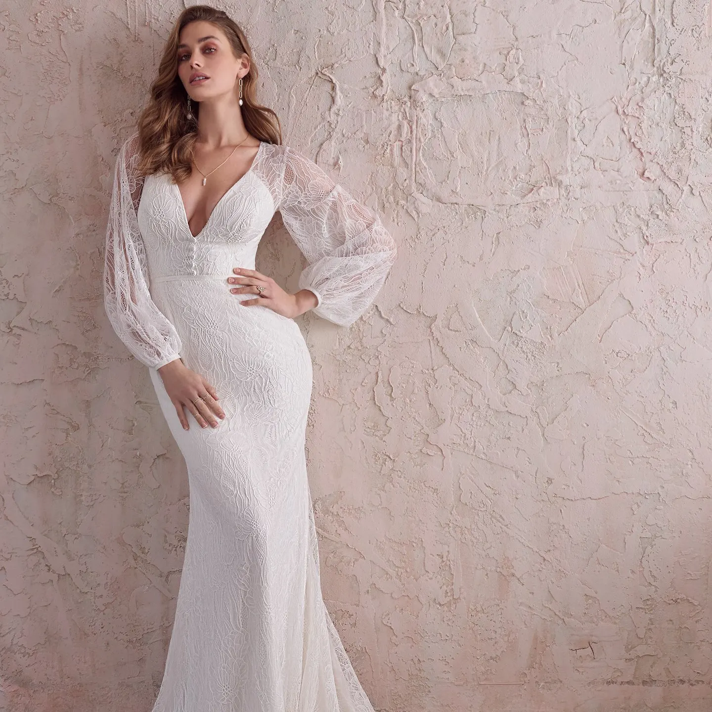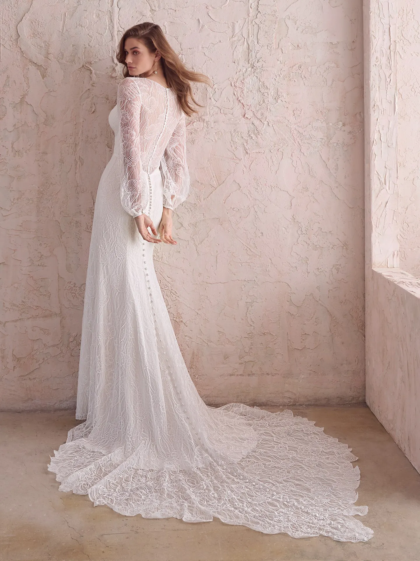 Maggie Sottero hat mit Jeanette ein modernes Brautkleid im Mix aus Vintage und Boho geschaffen. Der schmale Entwurf ist mit strahlend weißem Satin gefüttert und von moderner, großformatiger Blütenspitze bedeckt. Die Bischofsärmel geben einen leicht voluminösen Kontrast. Eine kurze Knopfleiste ist vorne am Kummerbund platziert; eine lange Knopfleiste reicht von der transparenten Rückenpartie bis zum Saum der spitz zulaufenden Schleppe.