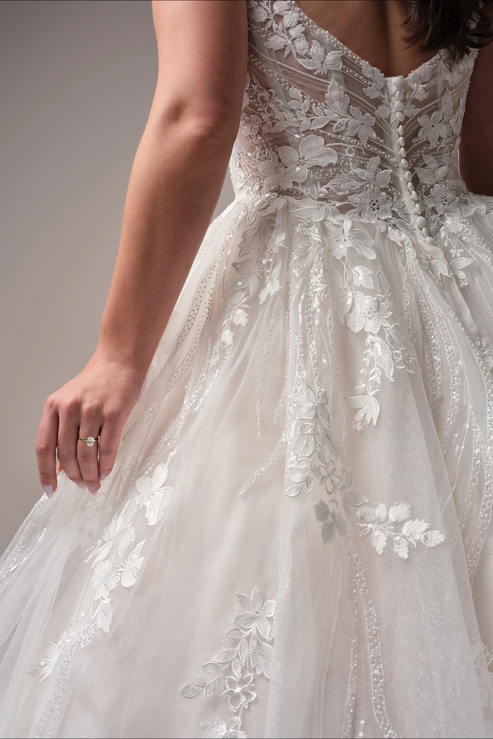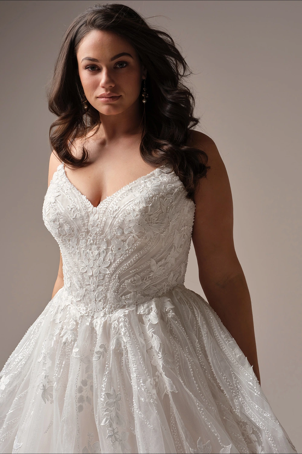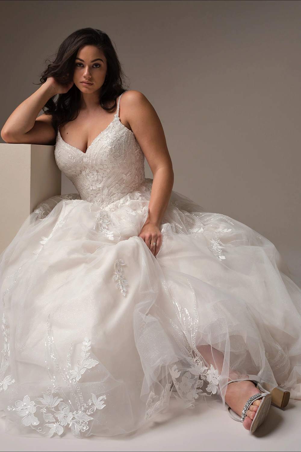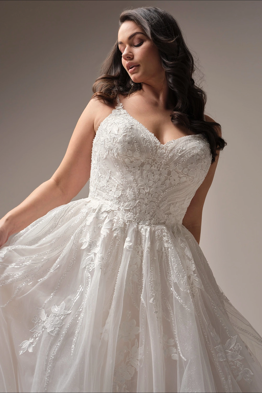 Das Modell Liberty Curvy von Maggie Sottero ist ein klassisches, weit ausgestelltes A-Linien Brautkleid mit Perlenbesatz, dass deine Vorzüge perfekt betont.