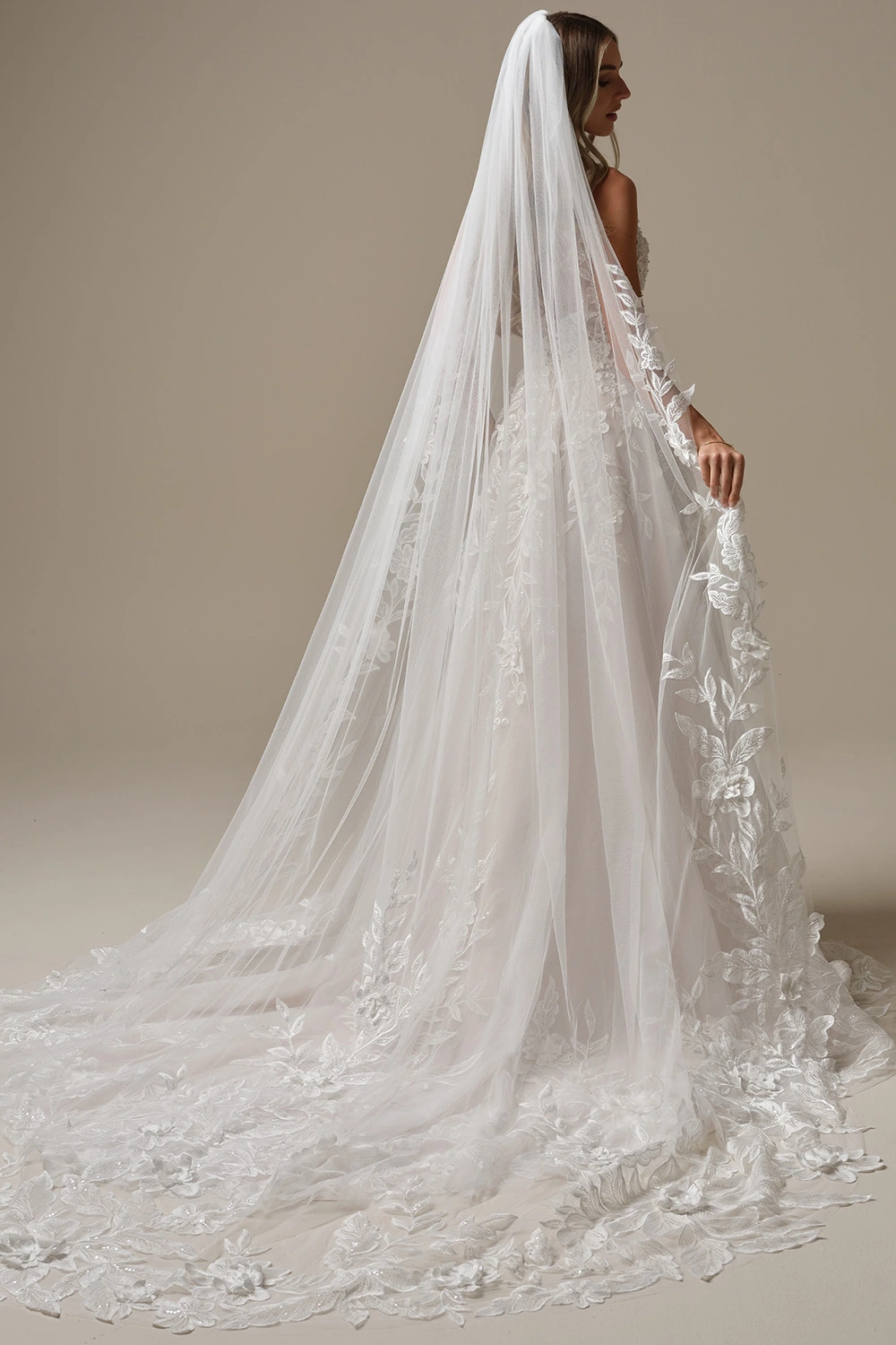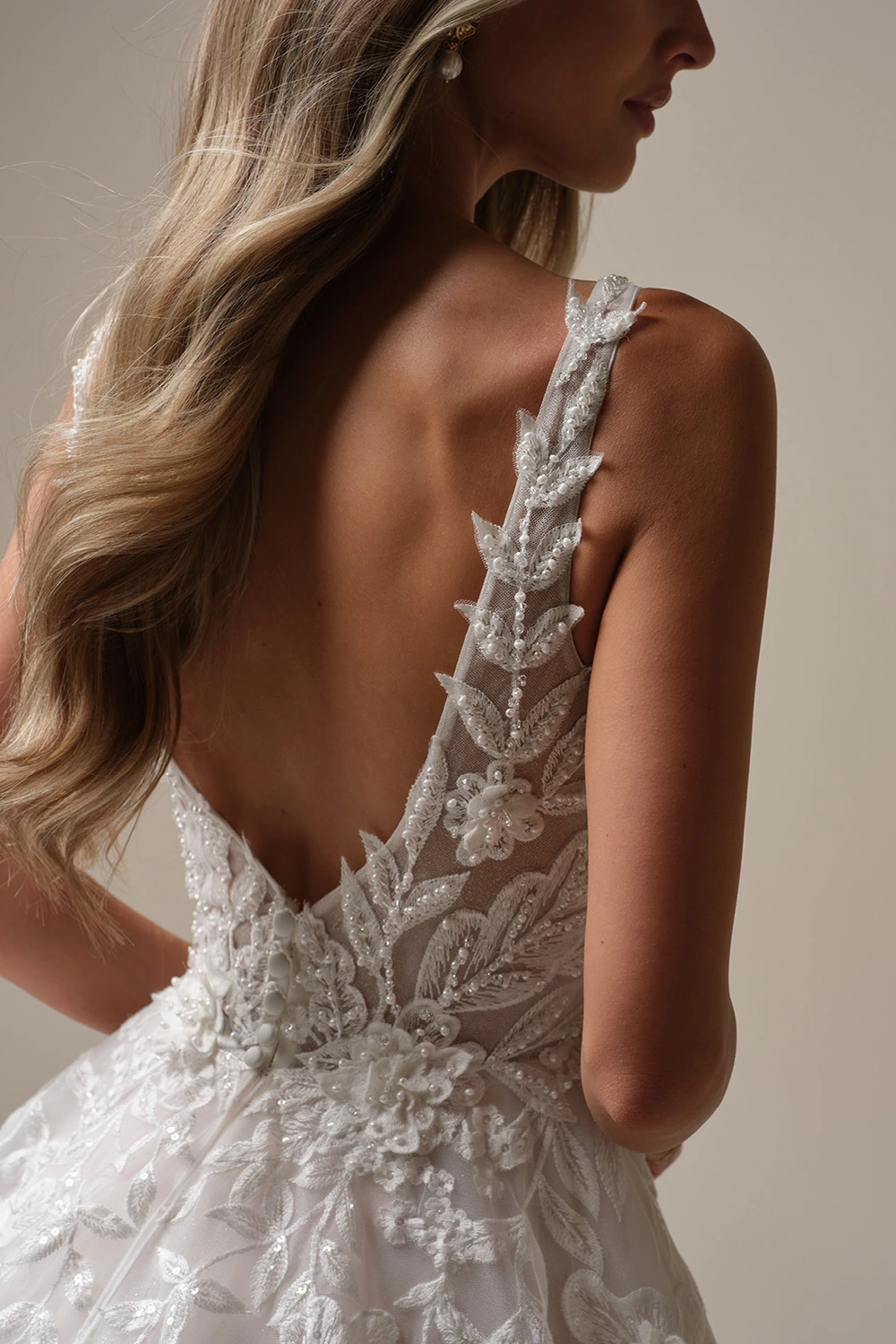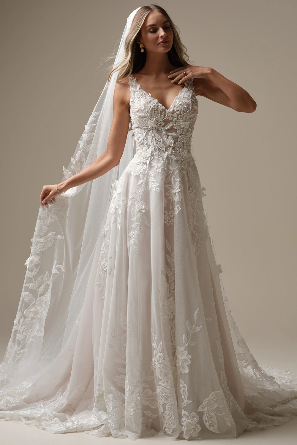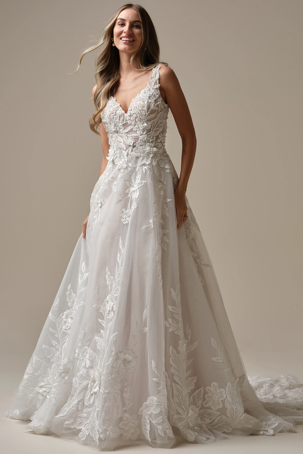 Das Brautkleid Magnolia von Maggie Sottero ist ein funkelndes A-Linien Brautkleid mir floralen Applikationen.