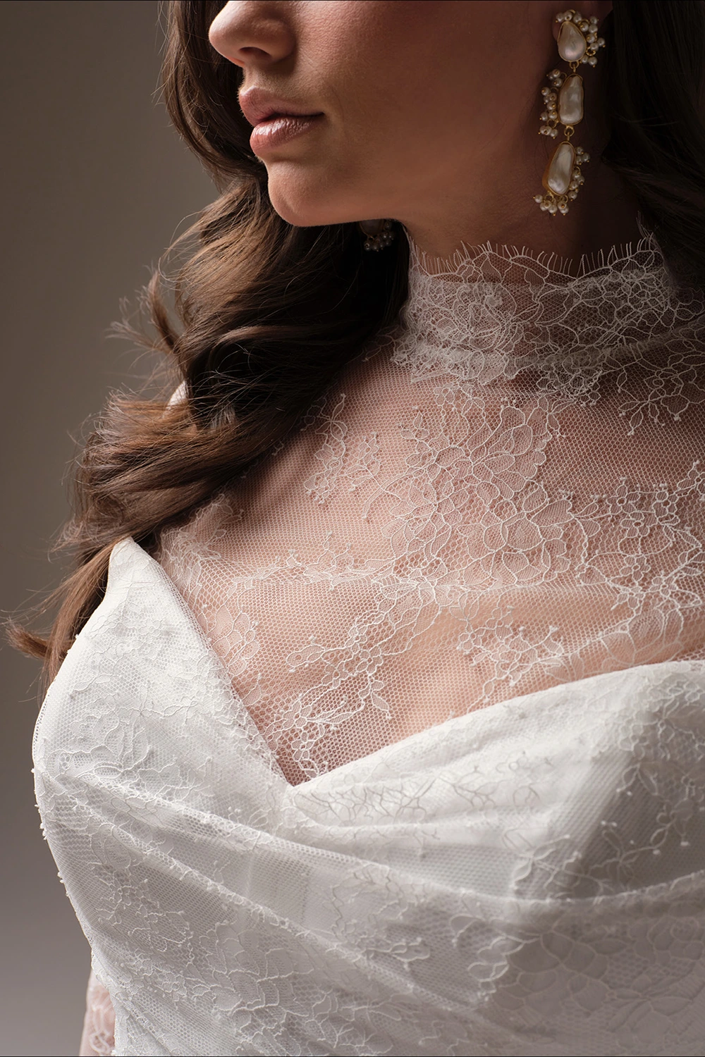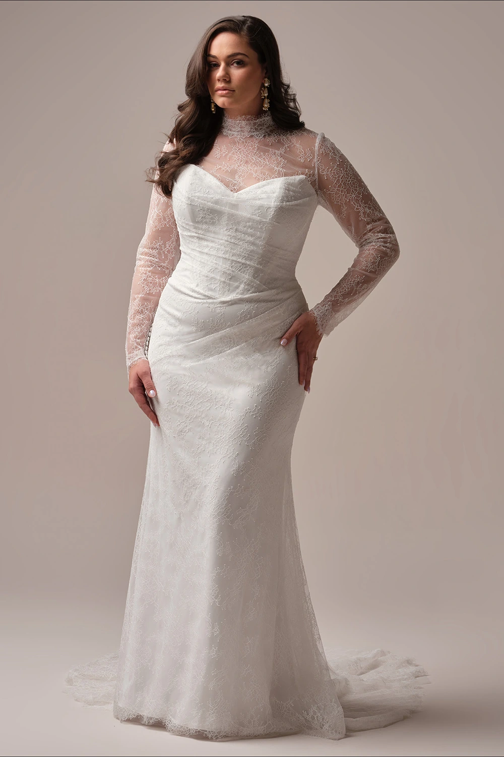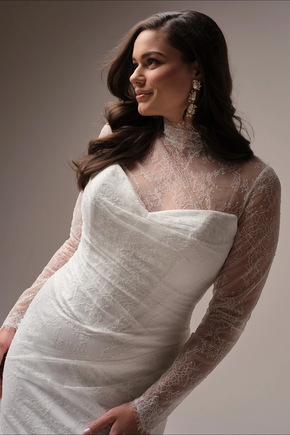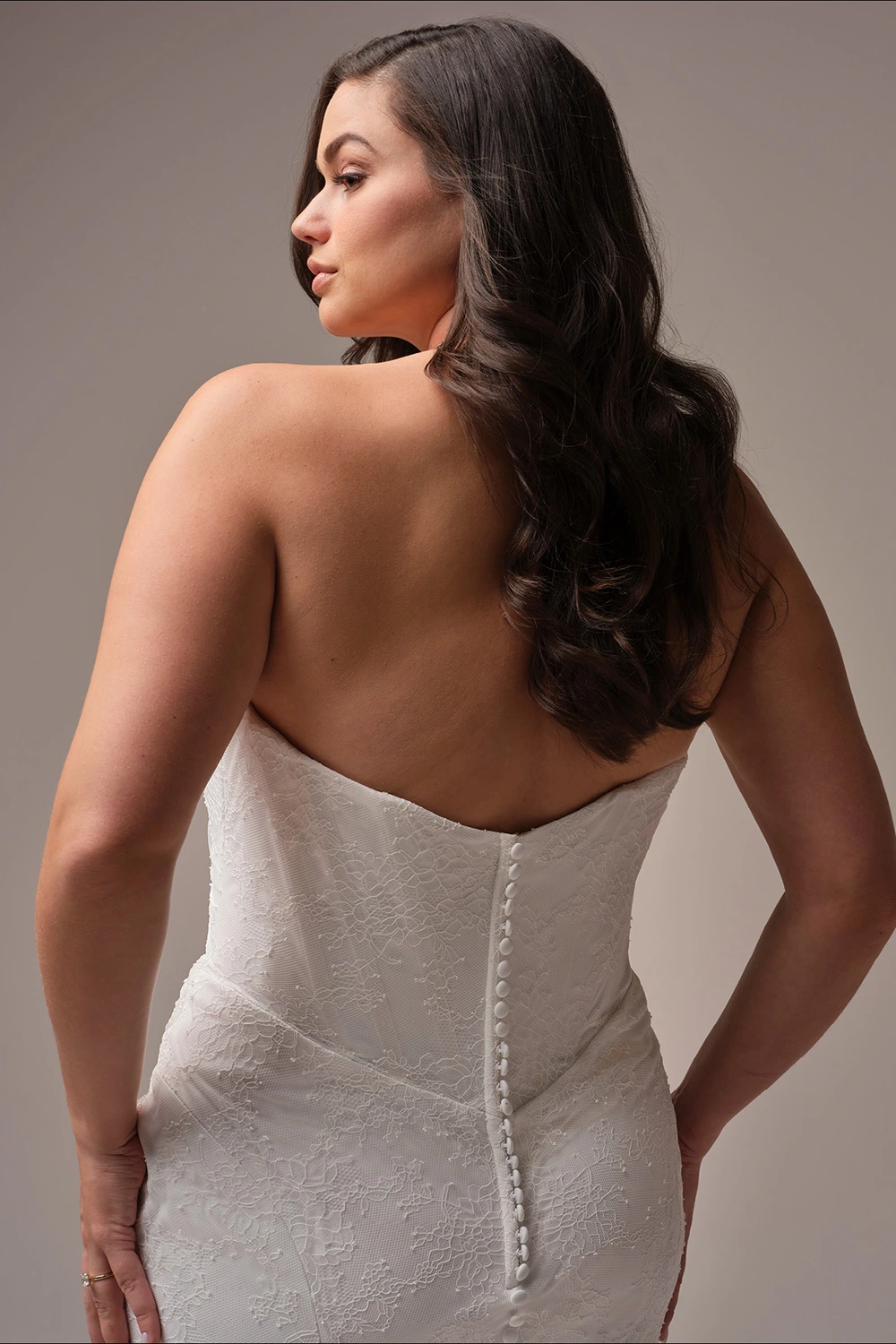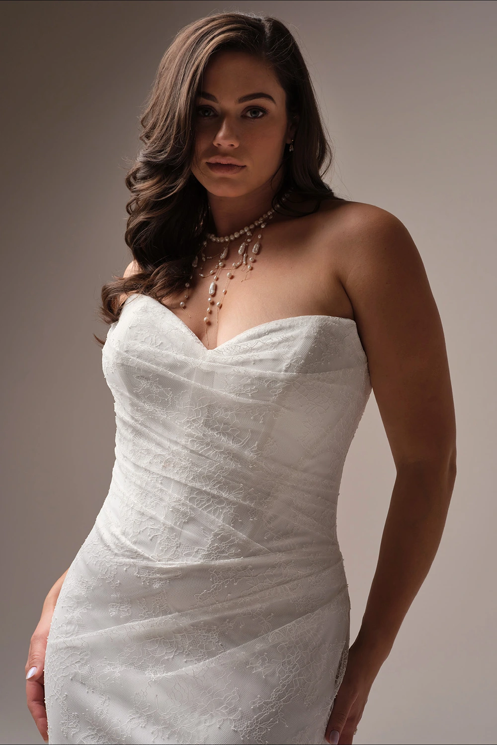 Das Modell Sasha Curvy von Maggie Sottero ist ein elegantes Meerjungfrauen / Fit-and-Flare Brautkleid mit moderner Chantilly-Spitze.