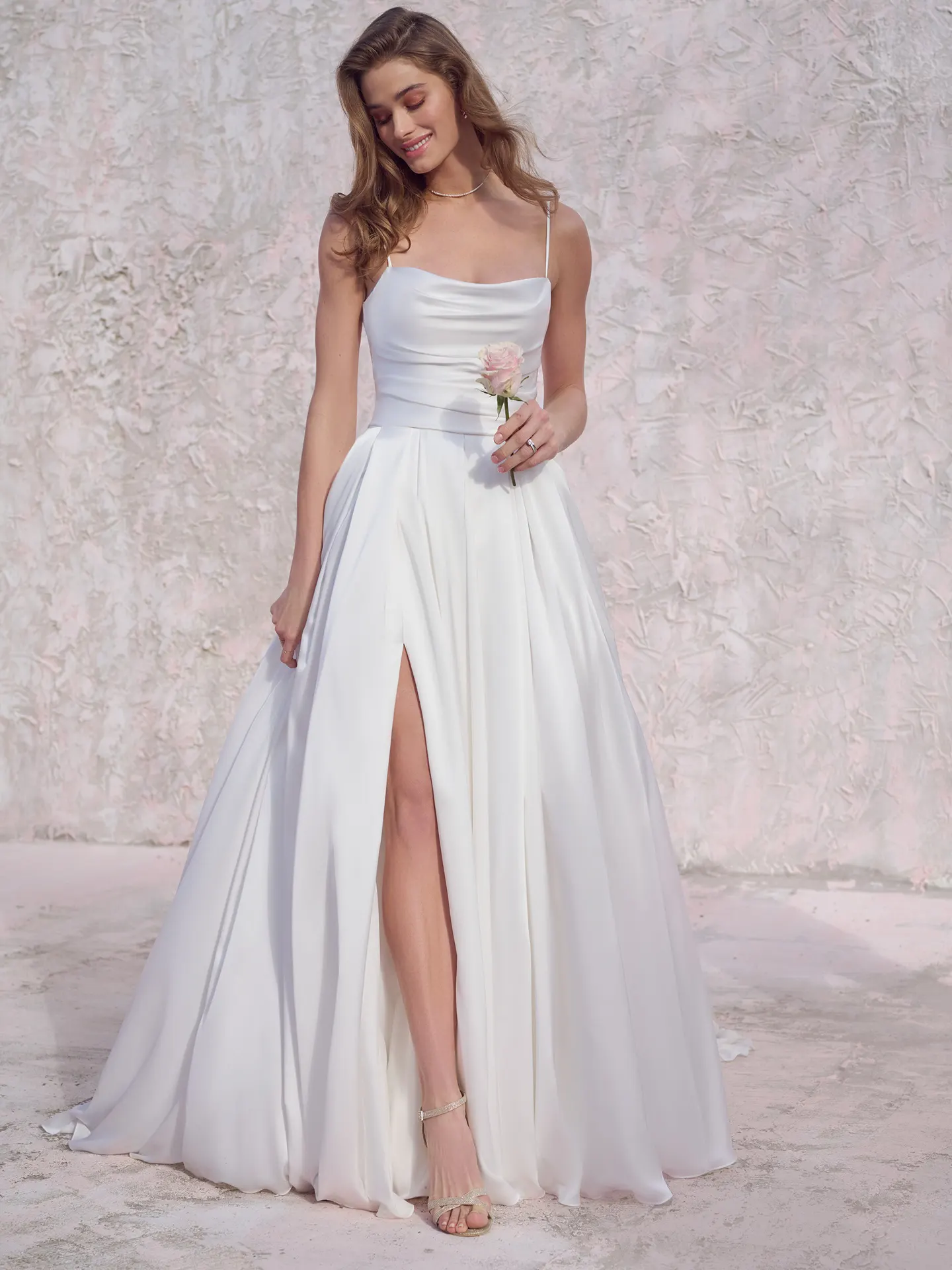 Scarlet von Maggie Sottero ist ein ebenso modernes wie edles Brautkleid aus dem Trend-Stoff Satin. Das kurze Oberteil mit geradem Ausschnitt besitzt an der Vorder- und Rückseite wunderschöne Raffungen. Filigrane Träger aus Stretch-Satin geben der Schulterlinie optisch viel Raum. Ab der Taille fließt der weit schwingende Rock voluminös zu Boden. Seitlich sind versteckte Taschen eingearbeitet. Vom Rückenausschnitt bis zum Saum der großflächigen Schleppe verläuft eine lange Knopfleiste. Ein Schlitz vorne rechts ermöglicht leichtes Bewegen und bietet die Gelegenheit, Brautschuhe in Szene zu setzen.