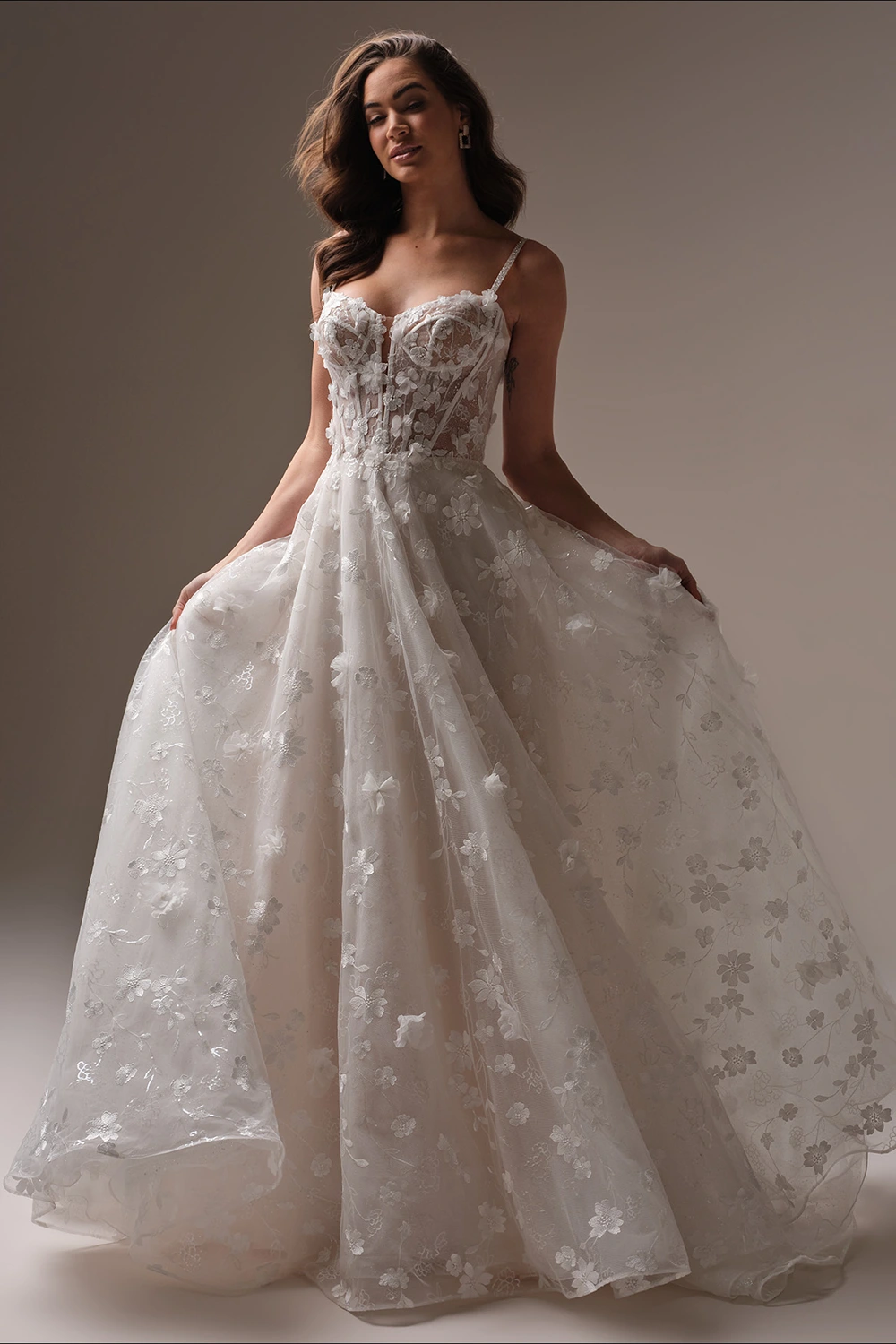 Das Modell Wallis von Maggie Sottero ist ein funkelndes A-Linien Brautkleid mit schönen 3D-Applikationen.