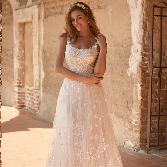 Mindel von Maggie Sottero ist die moderne Boho-Version des klassisch-romantischen Brautkleids. Spitze in moderne Blätteroptik und mit Paillettenverzierung rankt sich über das gesamte Kleid, zeigt sich aber besonders präsent am transparenten Oberteil aus Organza. Tiefe seitliche Schlitze ergänzen den eckigen Ausschnitt am Dekolleté. Unterhalb des tiefen V-Ausschnitts am Rücken verläuft eine Knopfleiste, die den darunter liegenden Reißverschluss verdeckt. Ab der Taille fließt ein lichtdurchlässiger Tüllrock sanft zu Boden und endet dort in einer ovalen Schleppe.