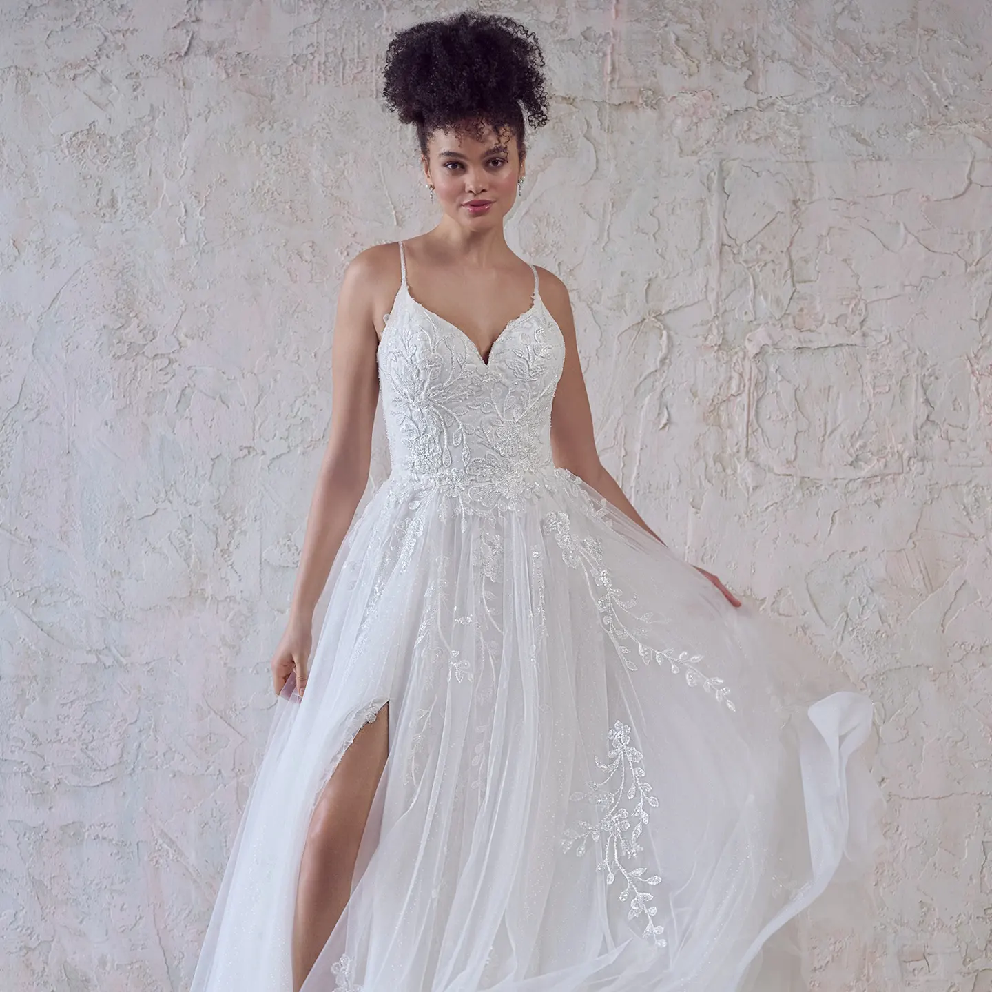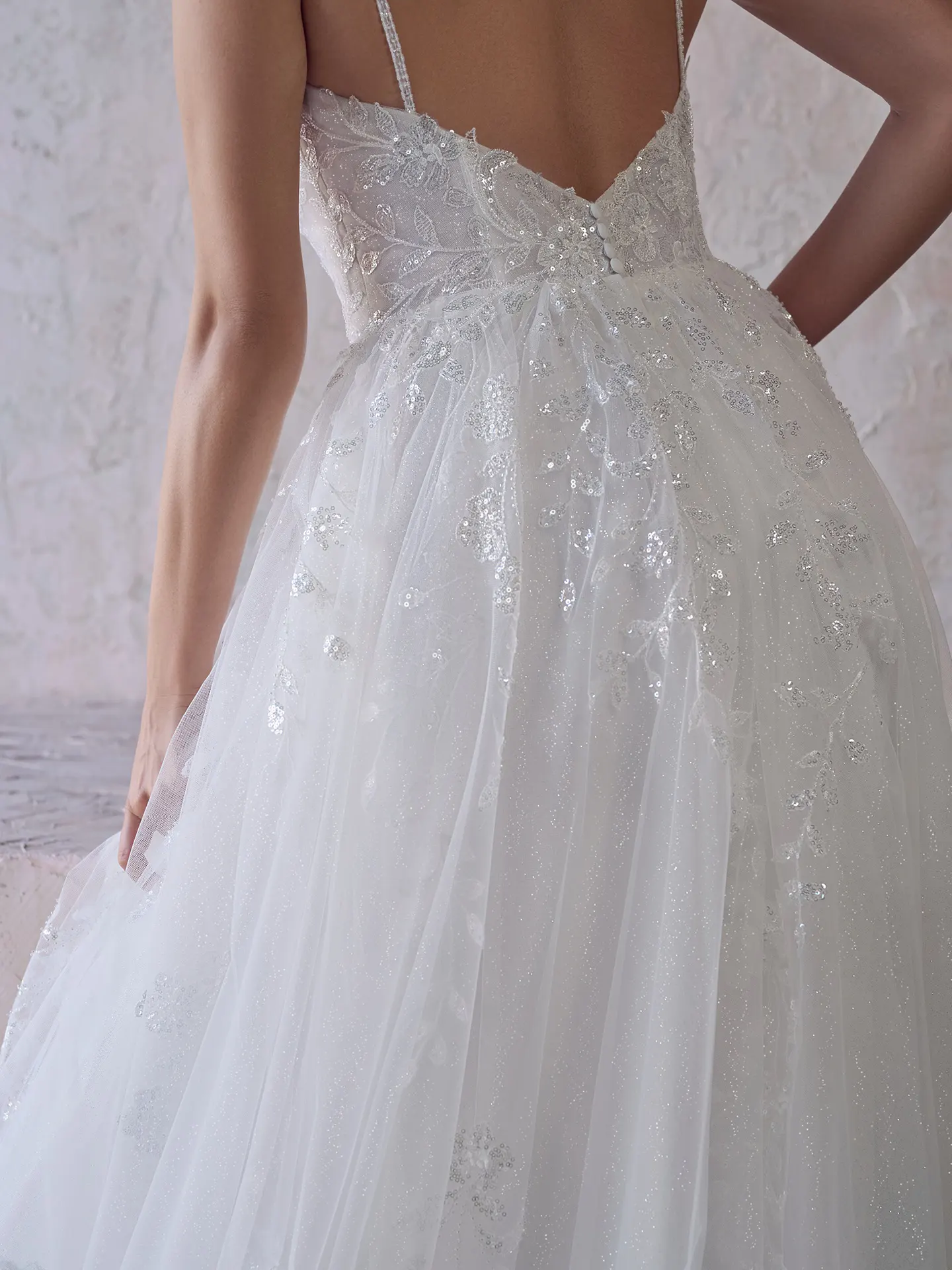 Das Brautkleid Sandrine von Maggie Sottero wirkt trotz vieler Lagen Tüll zart und leicht. Das schmale Oberteil ist mit floraler Spitze und zahlreichen Pailletten bestickt. Die glitzernden Spaghettiträger akzentuieren die Schulterlinie. Unterhalb des tiefen Rückenausschnitts befindet sich eine kurze Knopfleiste. Ein bauschiger Tüllrock schließt sich an und führt das Spitzenmuster des Oberteils fort. Der Schlitz an der Vorderseite verleiht Beinfreiheit.