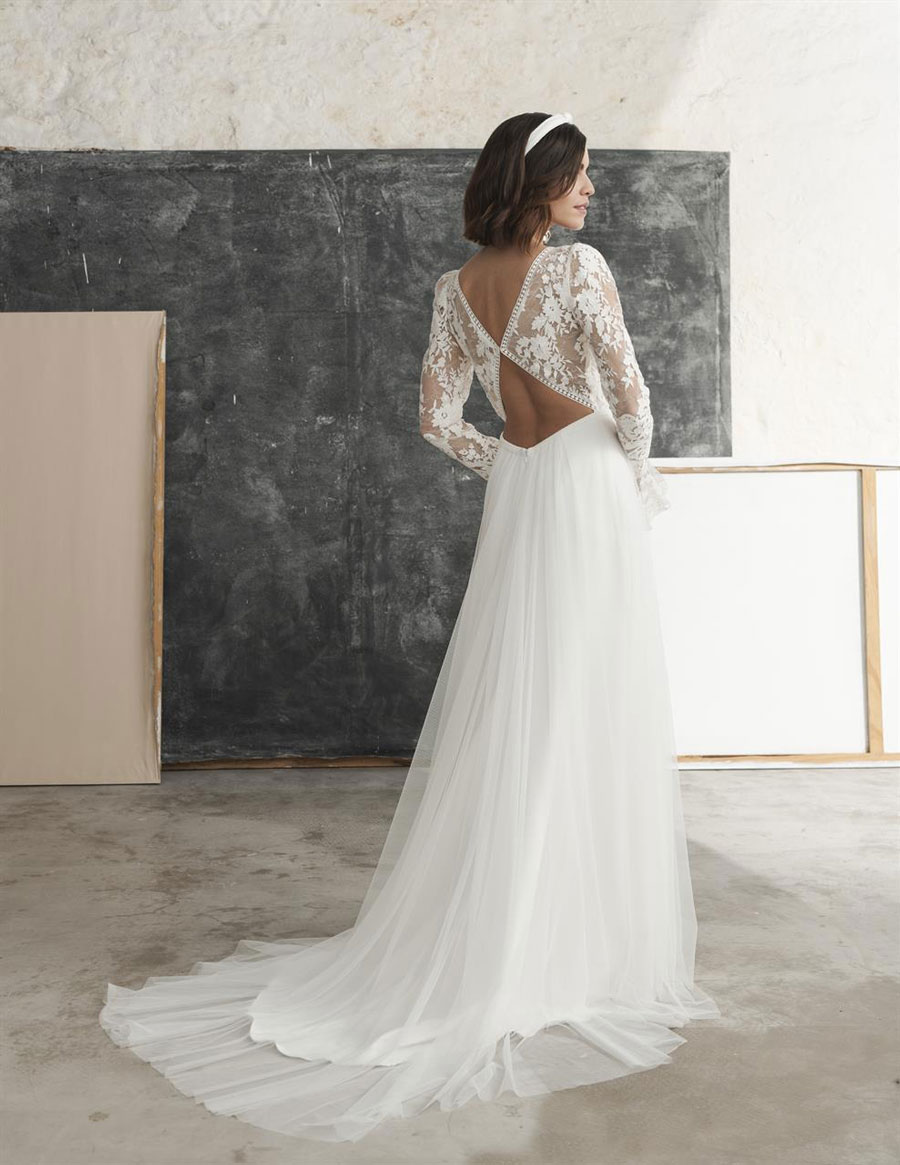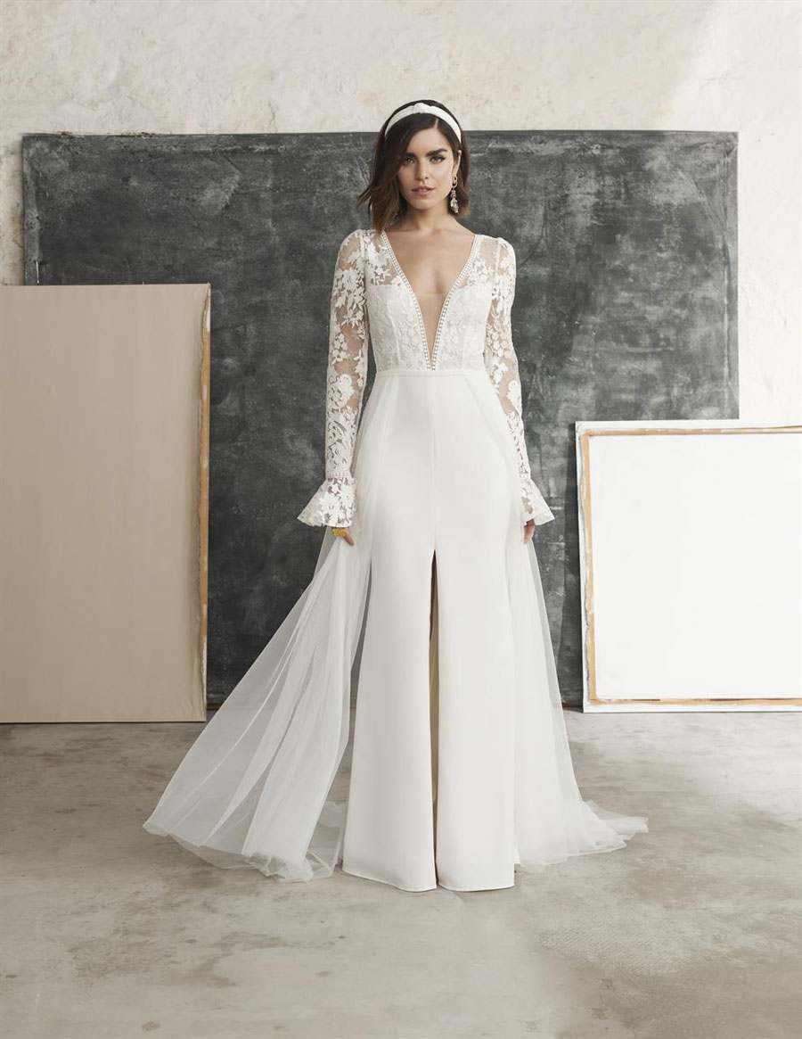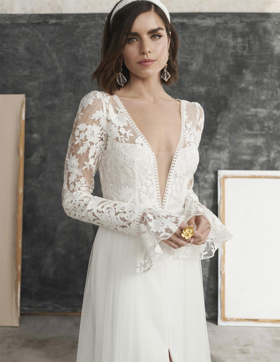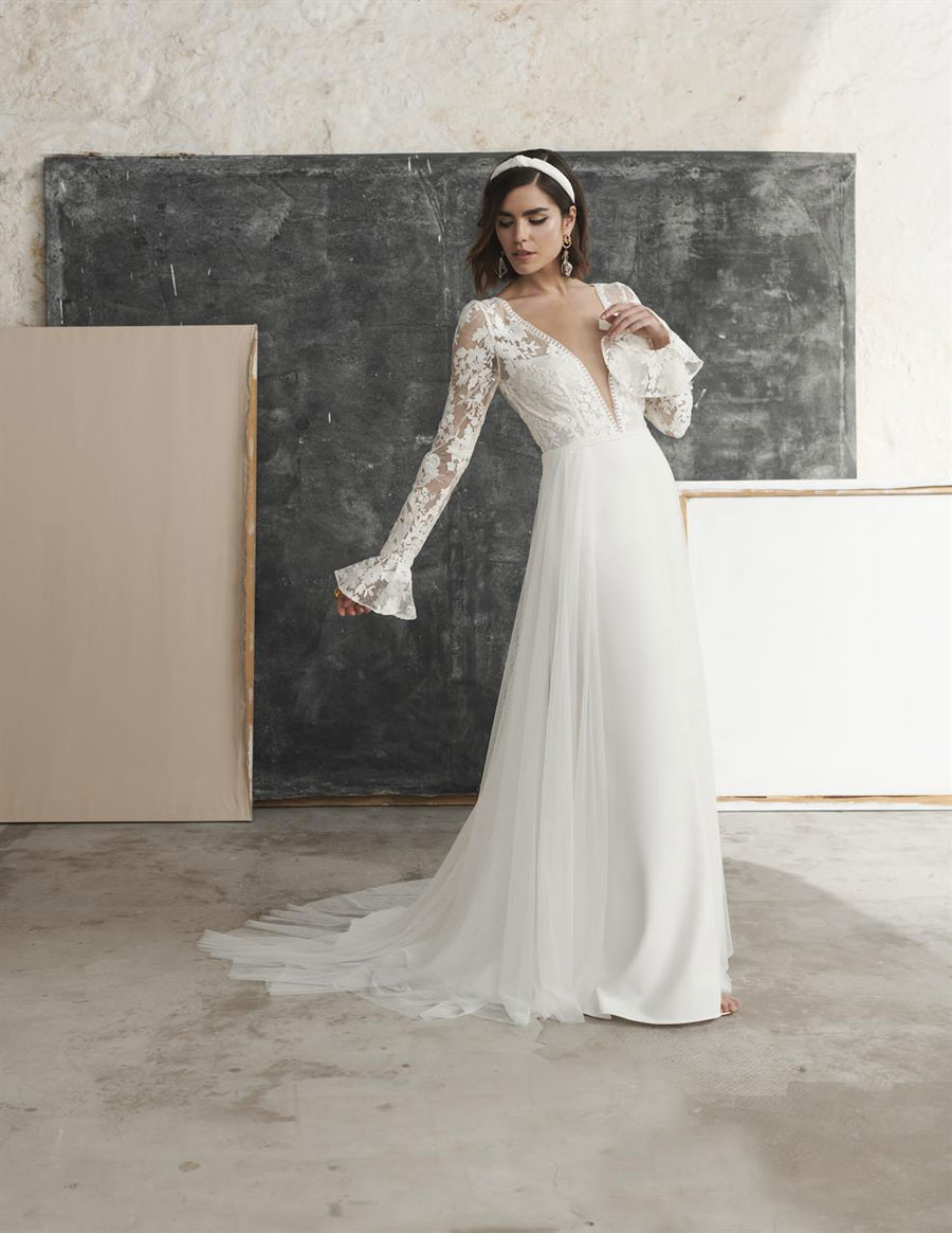 Joanne von Marylise ist ein modernes Brautkleid mit Elementen des Vintage- sowie des Boho-Stils. Das Oberteil ist tief geschlitzt. Am tiefen V-Ausschnitt sorgt ein Einsatz aus transparentem Netzstoff für Stabilität. Die langen Ärmel aus mit floraler Spitze besticktem Tüll besitzen außerdem Volants an den Bündchen. Der zweigeteilte, geknöpfte Rückenausschnitt setzt einen starken optischen Akzent an der Rückseite. Darunter beginnt ein aus Crêpe und Tüll geschichteter Rock, der vorne mittig geschlitzt.