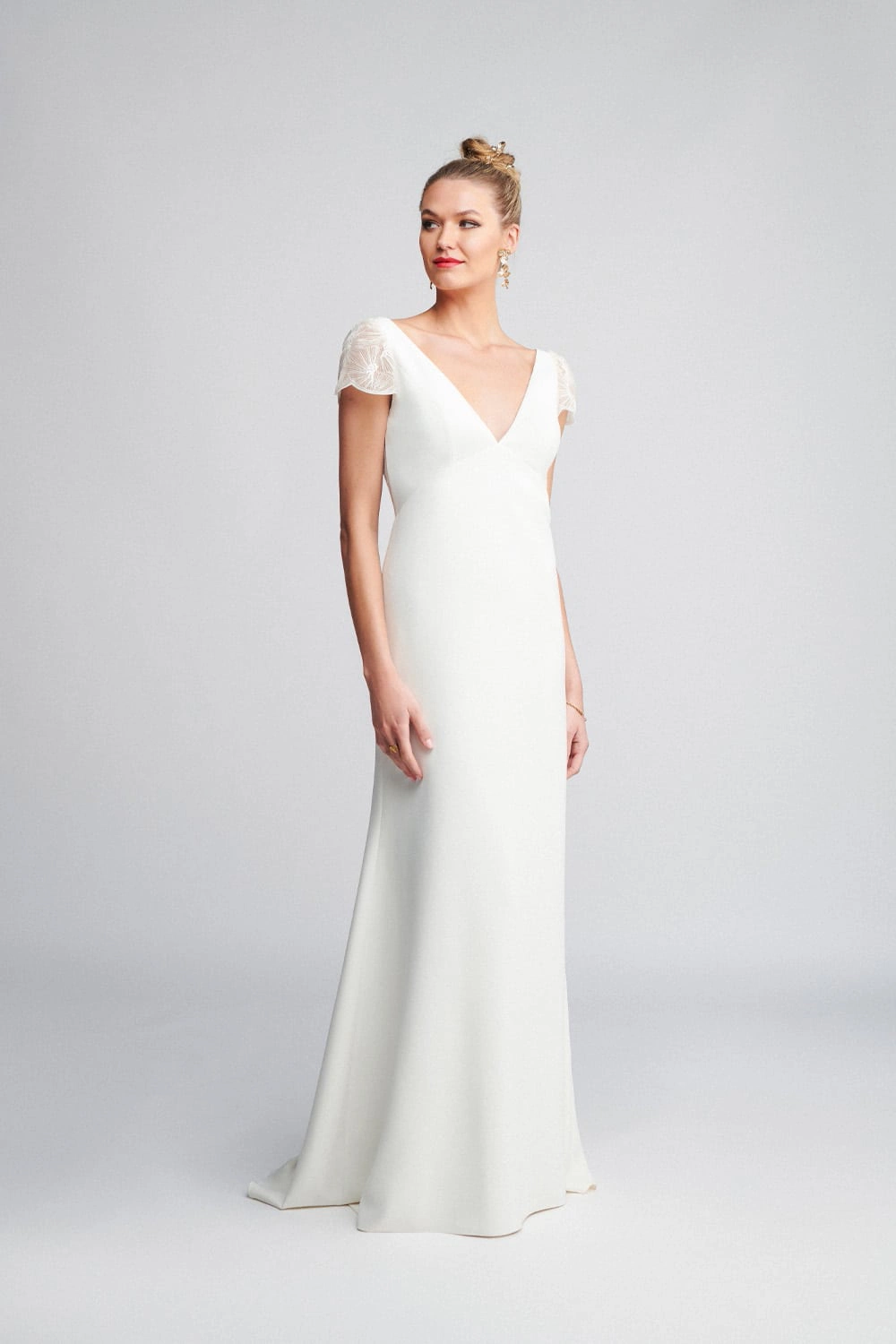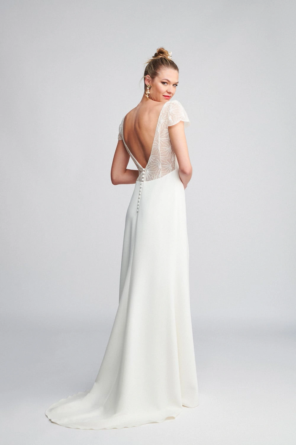 Das Brautkleid Brigitte 1 von Marylise vereint den Vintage-Stil mit modernen Elementen zu einer eleganten Kreation. Seine schlichte Vorderansicht aus Crêpe steht im Kontrast zur Rückansicht mit außergewöhnlichem Detail. Feine Blütenspitze ist hier auf transparenten Tüll gestickt, der den tiefen Ausschnitt rahmt und zudem die kurzen Ärmel formt. Eine Knopfleiste begleitet den Übergang in die Rockpartie. Der schlichte Crêpe fließt glatt zu Boden. Der Rock mündet in einer kleinen Schleppe.