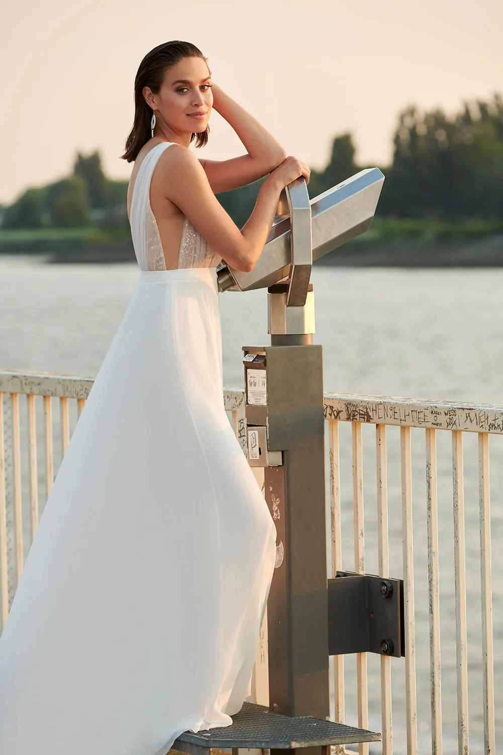 Das Brautkleid Caspar von Marylise ist ein Empire-Brautkleid mit einem leichten und fließenden Rock, sowie einem glamourösen Oberteil aus Pailletten und Tüll.