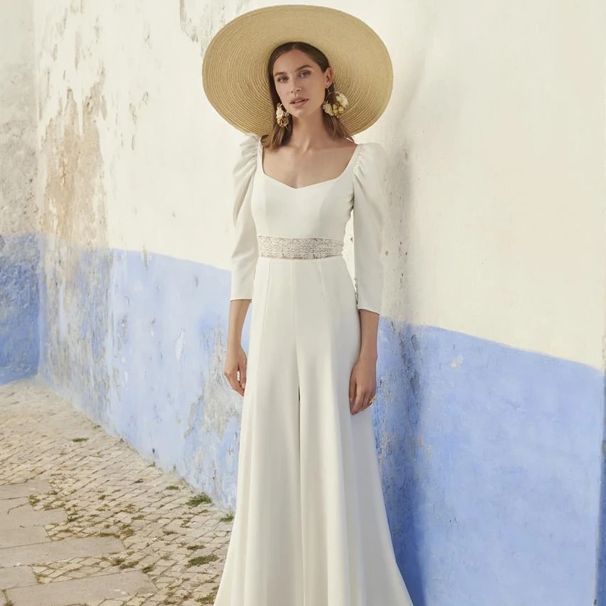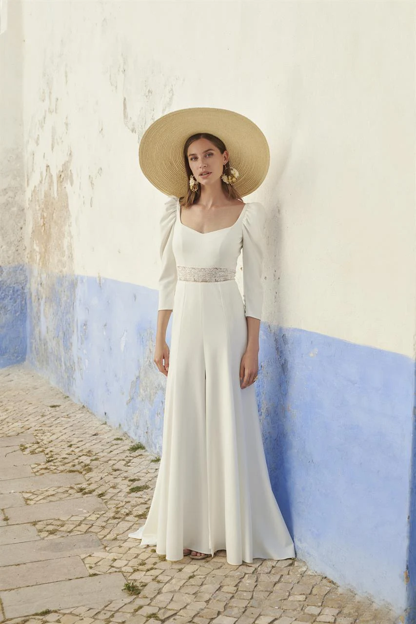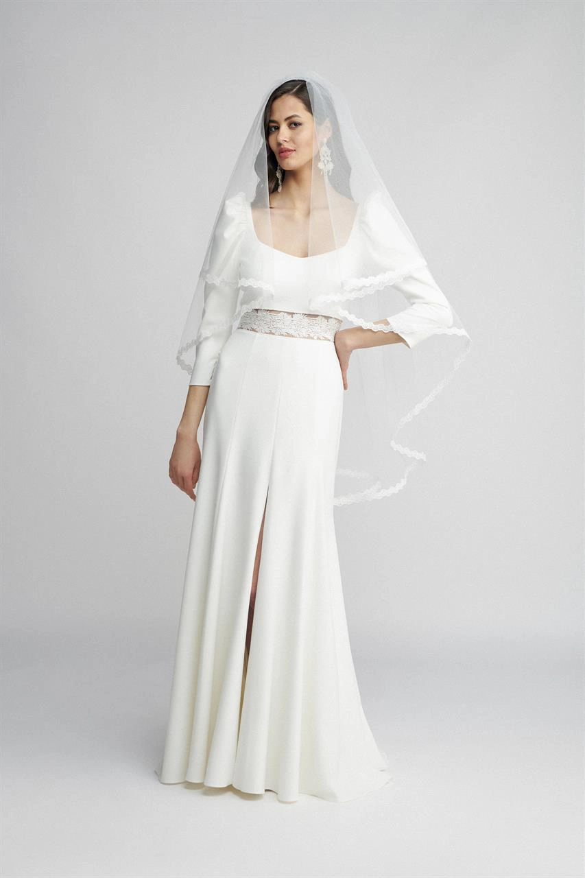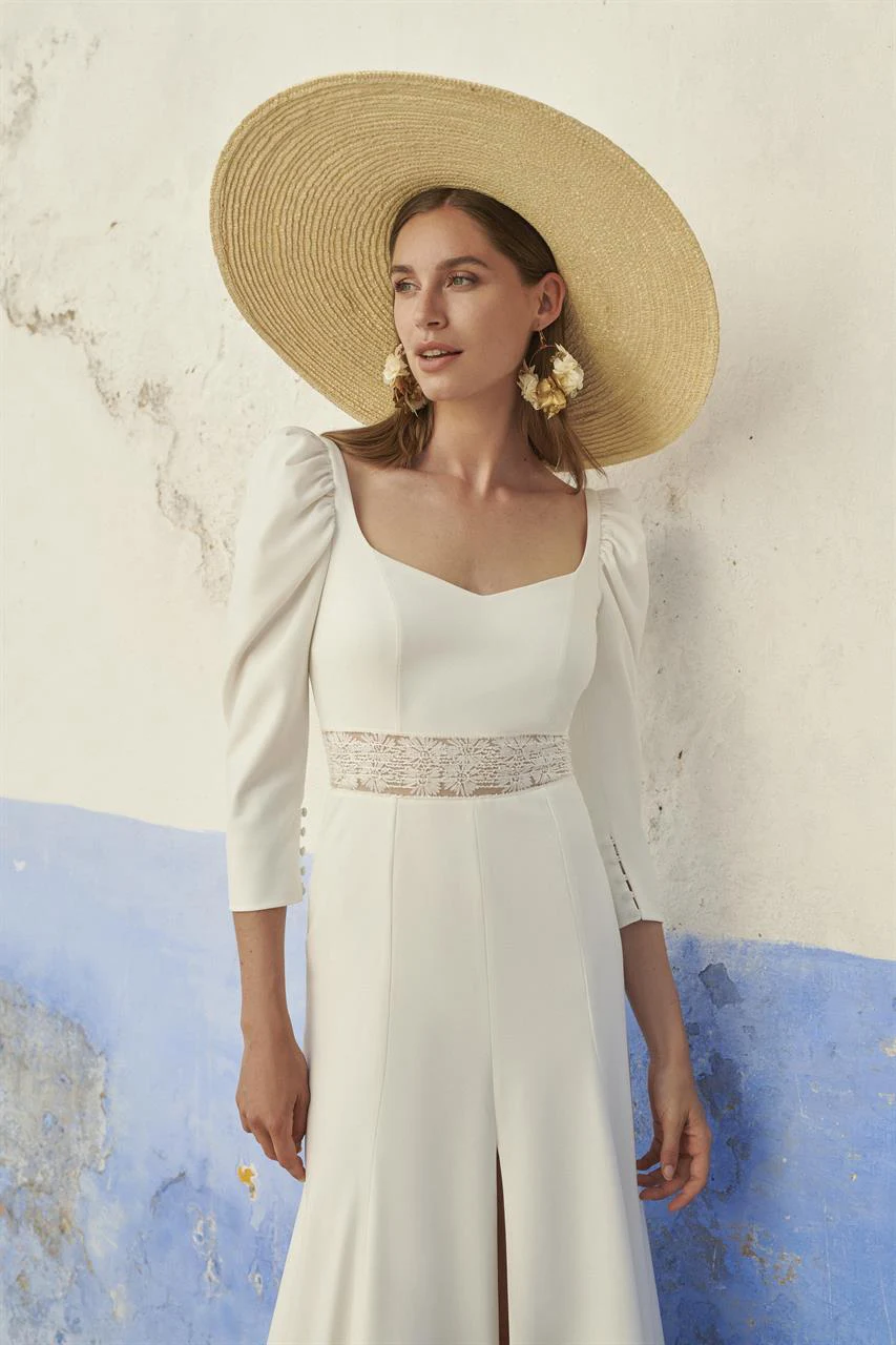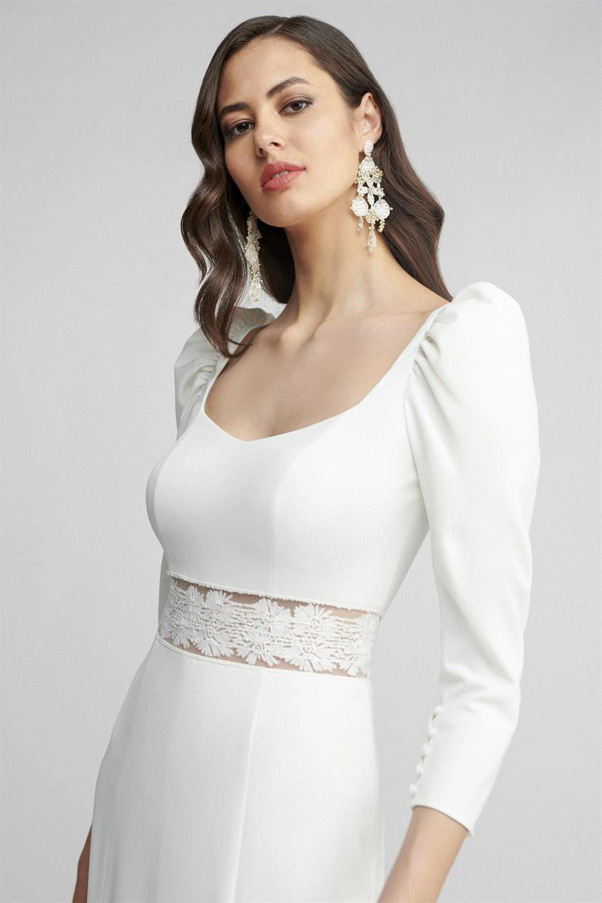 Das Brautkleid Joelle von Marylise kombiniert Klassik und Vintage zu einem schlichten Brautkleid. Der aus Crêpe gefertigte Entwurf besitzt eckige Ausschnitte und gepuffte ¾-Ärmel. Am Rücken sowie an den Ärmelabschlüssen verlaufen kurze Knopfleisten. Unter der transparenten Taillenpartie aus floral besticktem Tüll fließt der glatte Rock dezent ausgestellt zu Boden. Ein an der Vorderseite mittig platzierter Schlitz im sorgt für Bewegungsfreiheit.