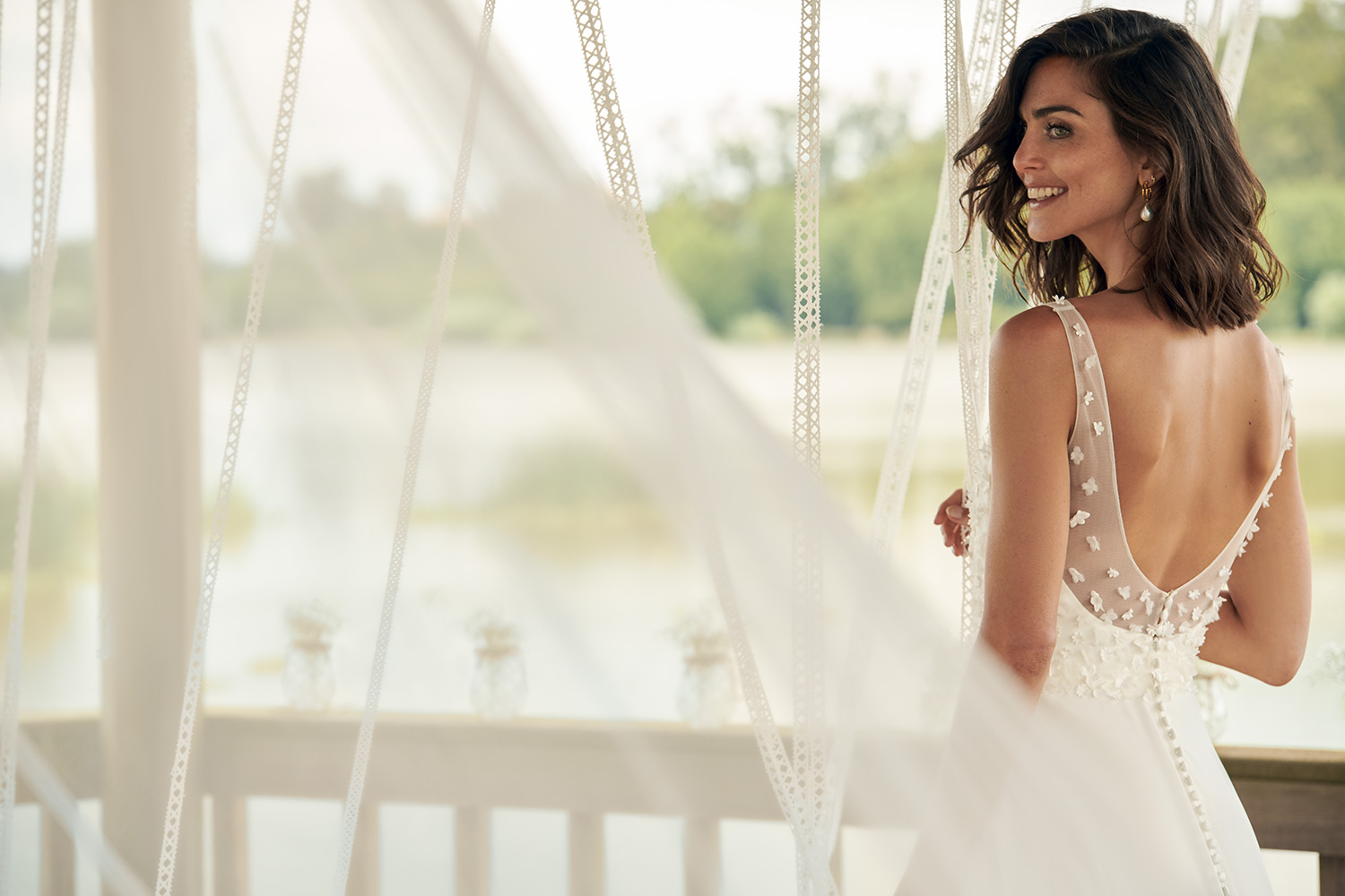 Der Blickfang des Brautkleids Wifey For Lifey sind seine 3D-Blütenstickereien und die transparenten Lagen Tüll an der Ausschnitt-, Träger- und Rückenpartie. Eine Knopfleiste setzt am unteren Rand des Rückenausschnitts an und schafft einen Übergang zum weich fallenden Rock.