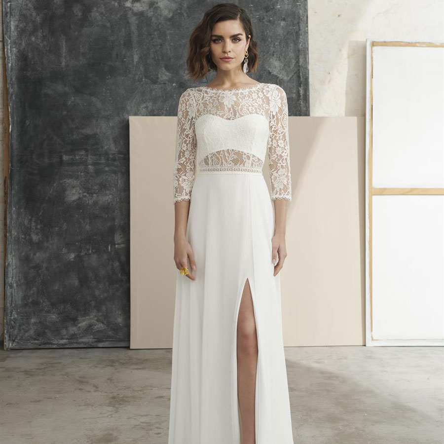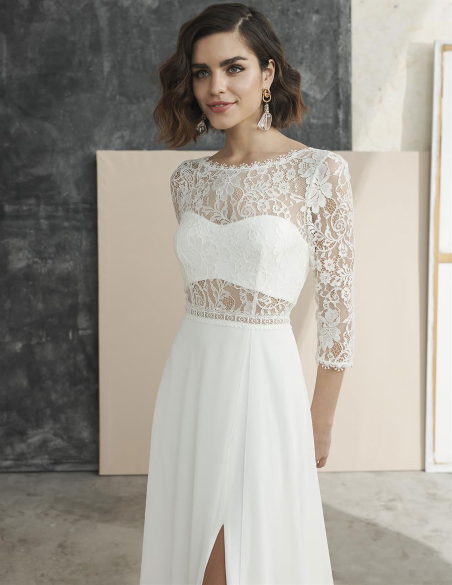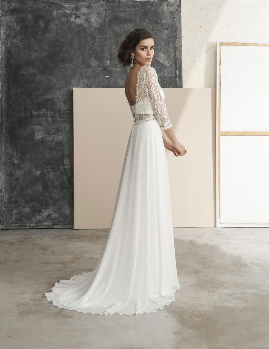 Das Brautkleid Mirthe von Marylise repräsentiert trotz sehr moderner Elemente erkennbar den Boho-Chic. Das Bandeau-Top des Oberteils ist hinten geknöpft. Darüber sorgt eine Lage transparente Spitze mit Blütenmuster für einen geschichteten Look. Die Spitze formt außerdem ¾-Ärmel und rahmt den großen Rückenausschnitt. Besondere Aufmerksamkeit verdient hier auch der filigran gearbeitete Saum. Unter einer zweiten, kurzen Knopfleiste beginnt der Rock, dessen fließender Chiffon schmal zu Boden fällt und eine kleine Schleppe bildet. Der Schlitz vorne reicht bis zum Oberschenkel und schenkt Bewegungsfreiheit.