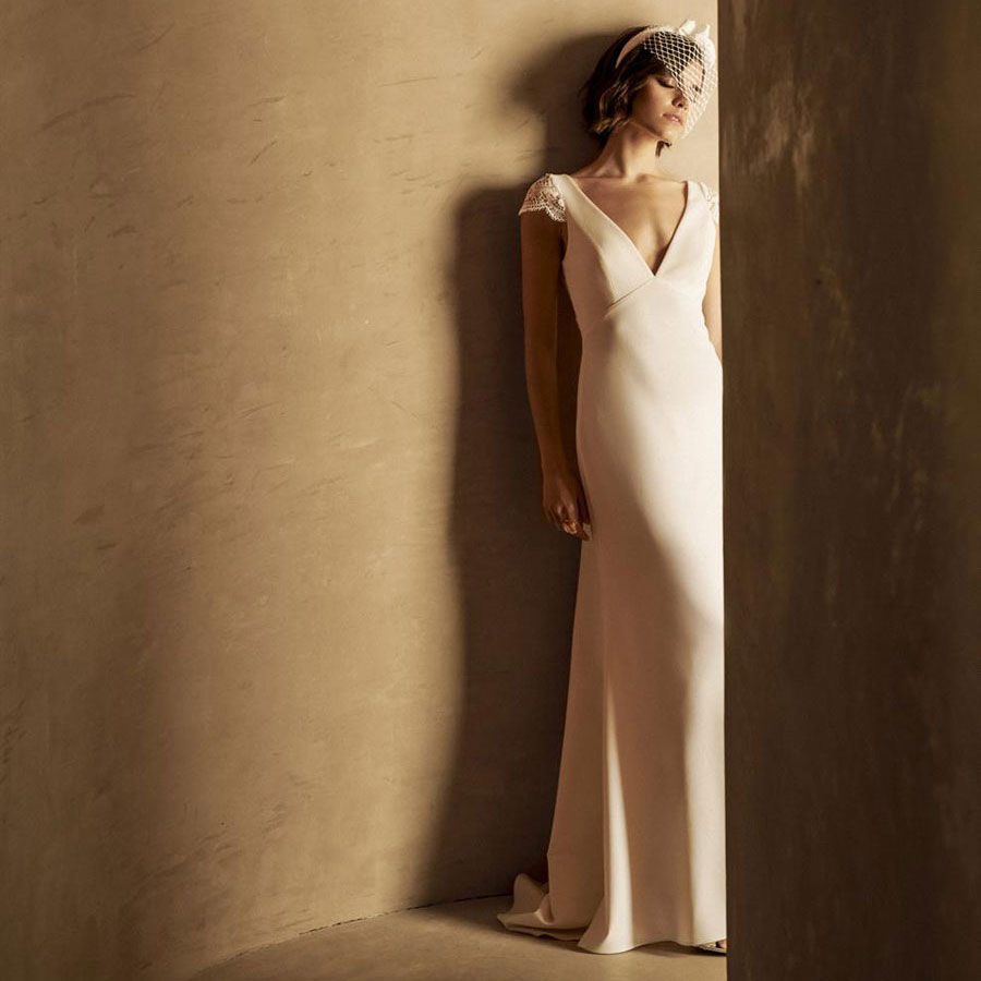 Das Brautkleid Yalena von Marylise verkörpert pure Vintage-Eleganz. Glatter Crêpe-Stoff ist die Basis dieses Entwurfs mit hoher Taille und schmaler Silhouette. Details aus Häkelspitze bilden die kleinen Ärmel und rahmen den großen Rückenausschnitt mit einem Muschelsaum. Unterhalb des Rückenausschnitts begleitet eine Knopfleiste den Übergang in den Rock. An der Rückseite greift außerdem eine ab der Kniehöhe eingenähte Partie aus Spitze das Muster des Oberteils auf und bildet die transparente Schleppe.