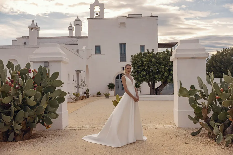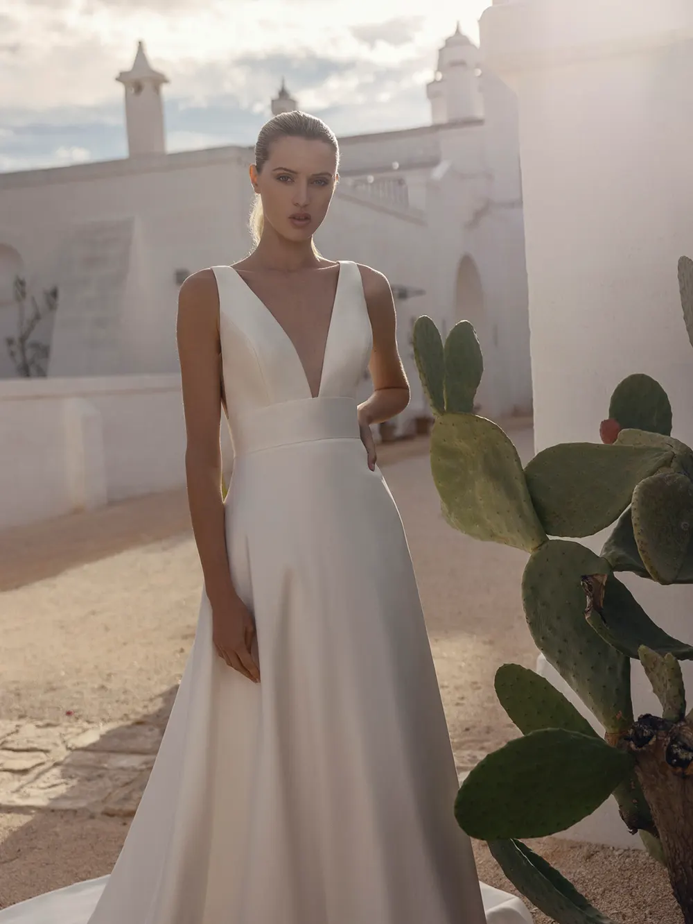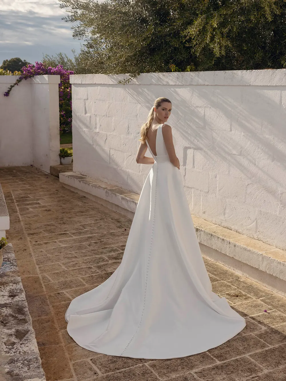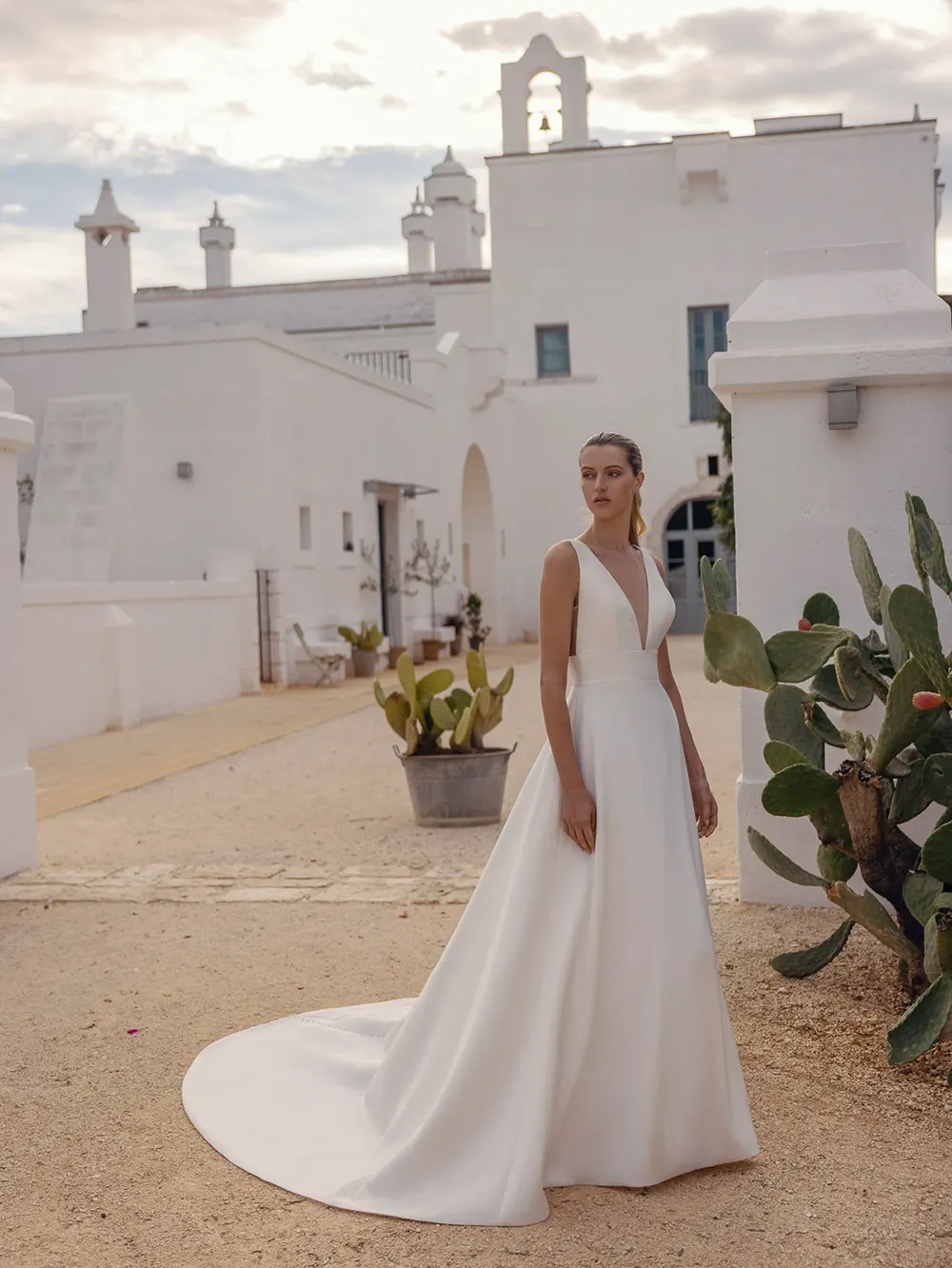 Das Brautkleid Abel von MODECA ist ein schlichtes, klassisches Prinzessinnen-Brautkleid aus Mikado.