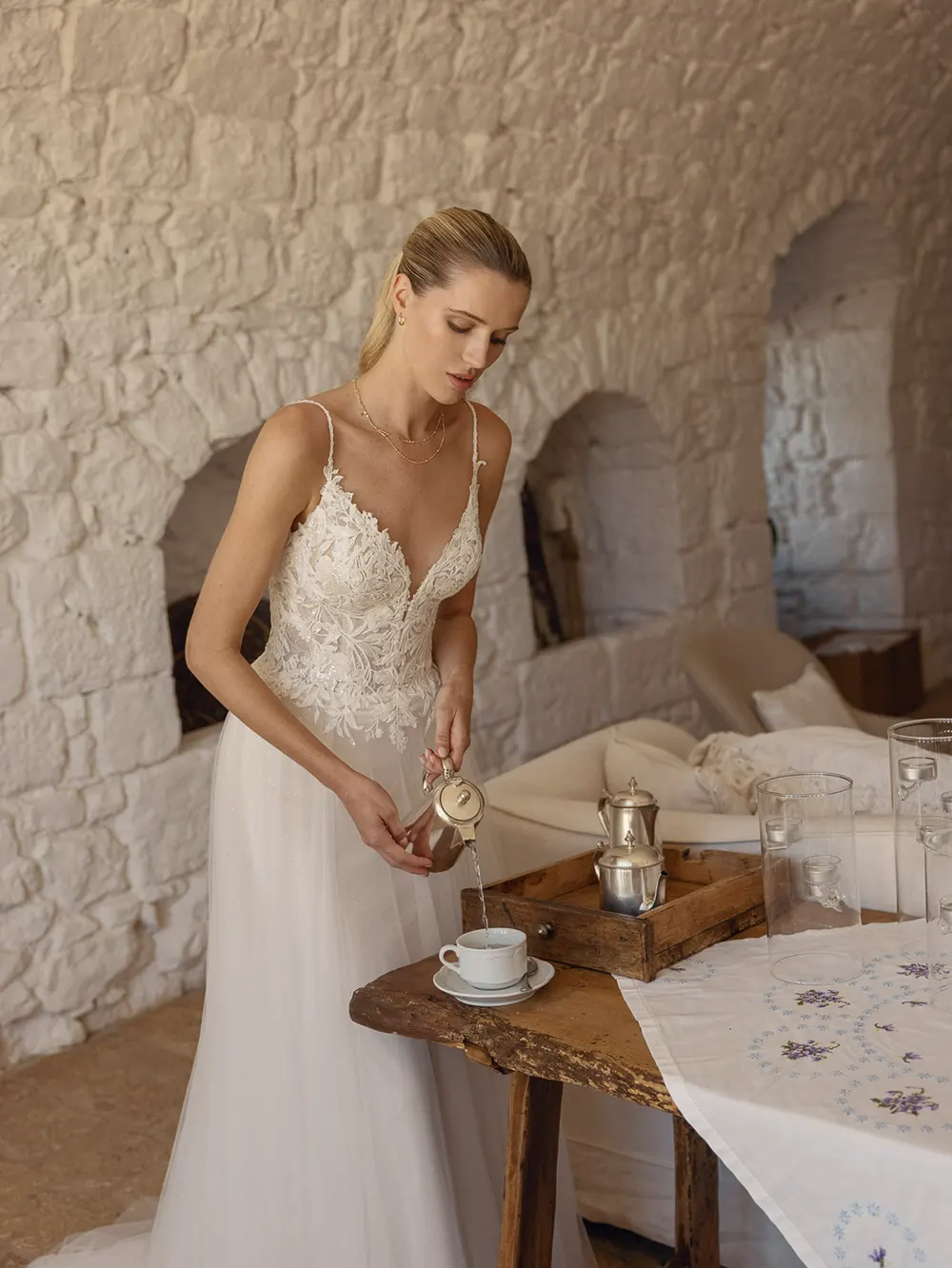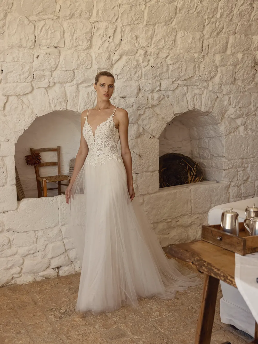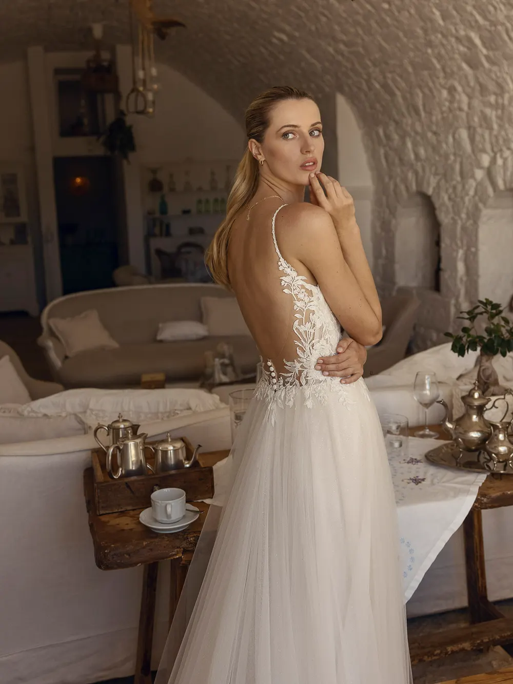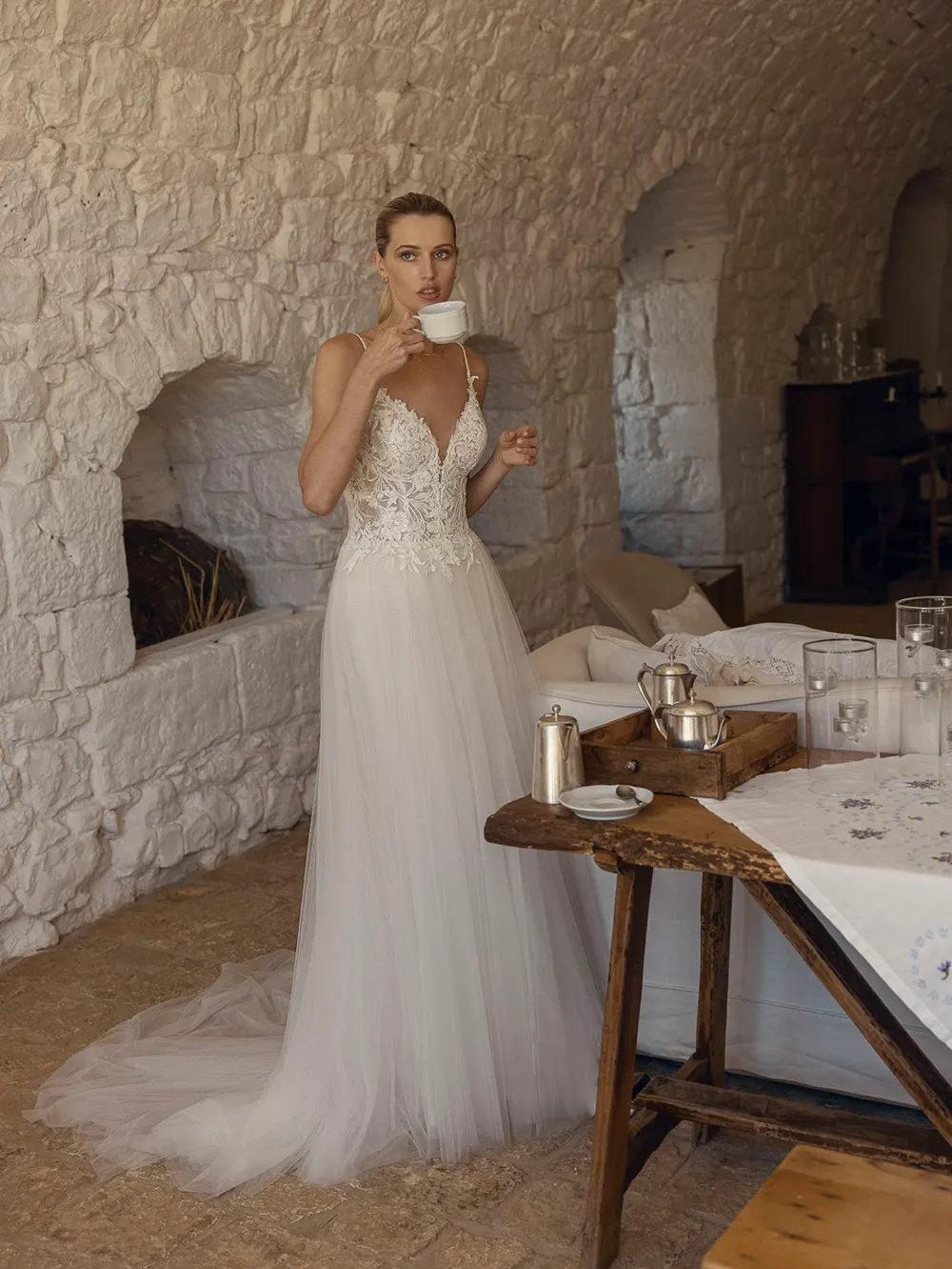 Das Brautkleid Alinde von MODECA ist ein A-Linien-Brautkleid mit romantischer Spitze im Oberteil und lockeren Tüllrock.