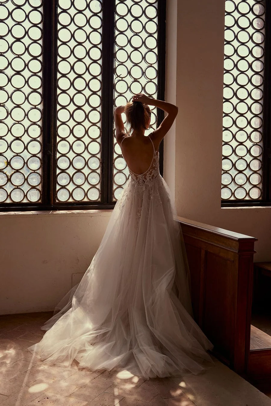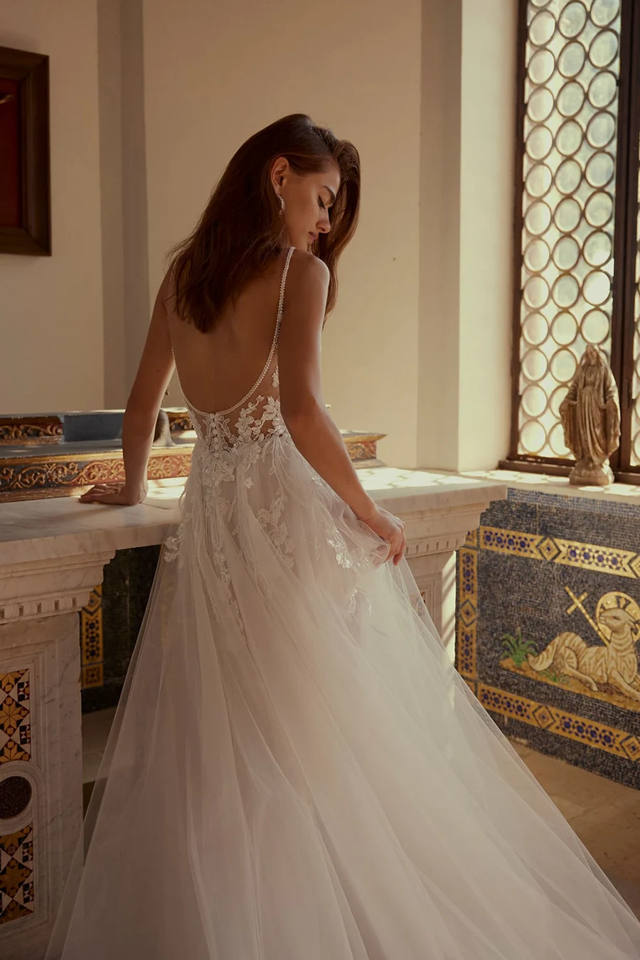Das Brautkleid Darana von Modeca ist ein A-Linien Brautkleid mit semitransparenten Oberteil und sichtbaren Stäben.