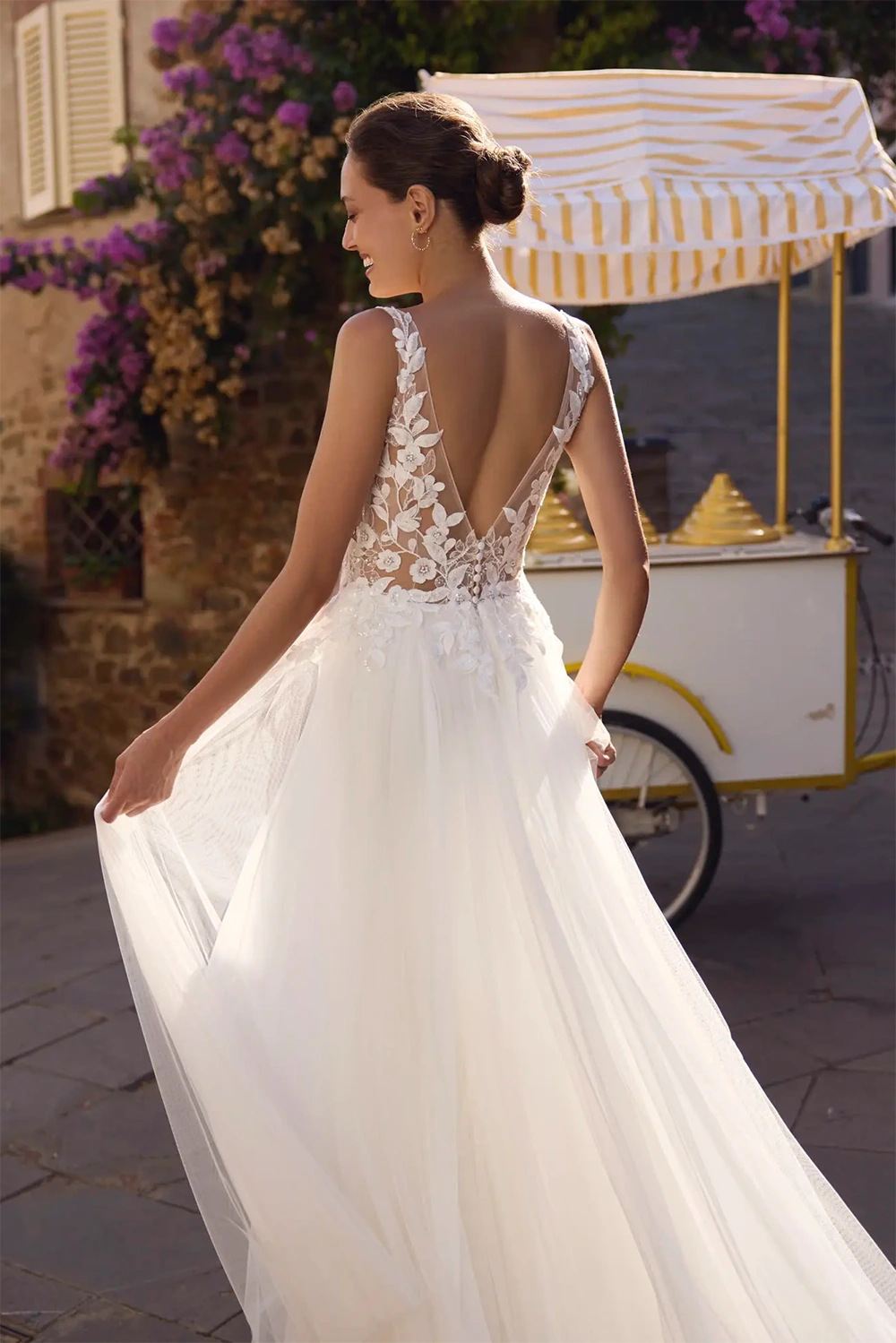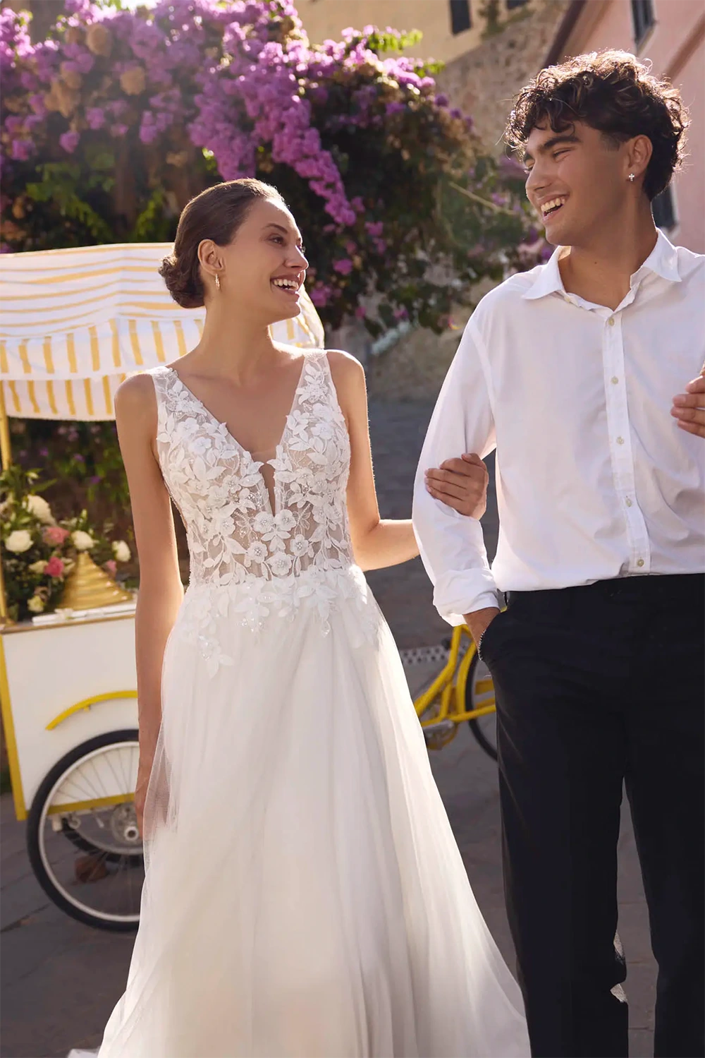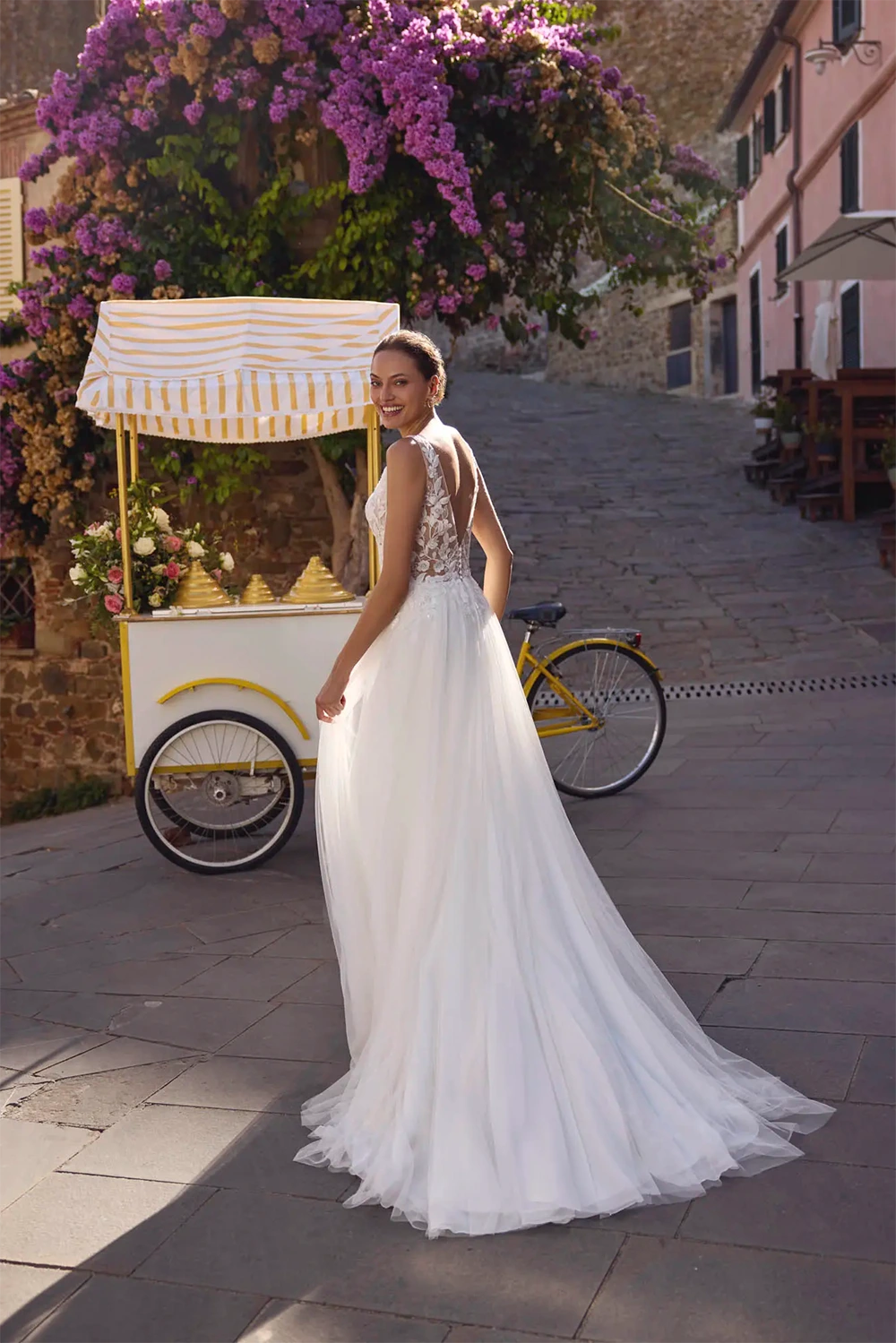 Das Modell Gabby von Modeca ist ein elegantes und romantisches A-Linien Brautkleid mit weichem Tüllrock.