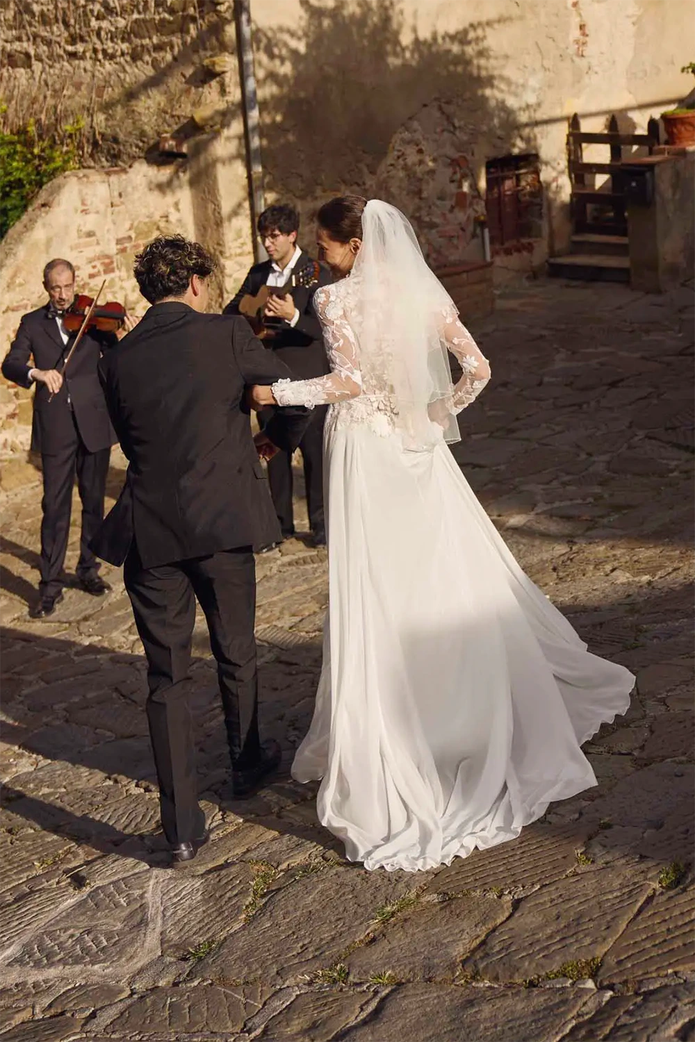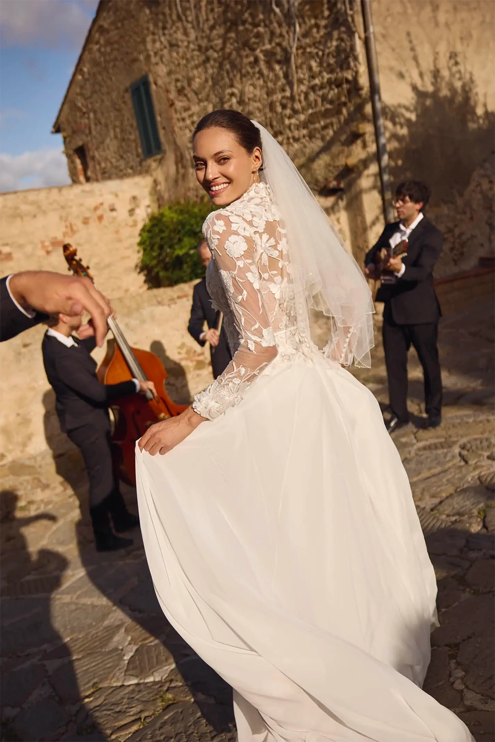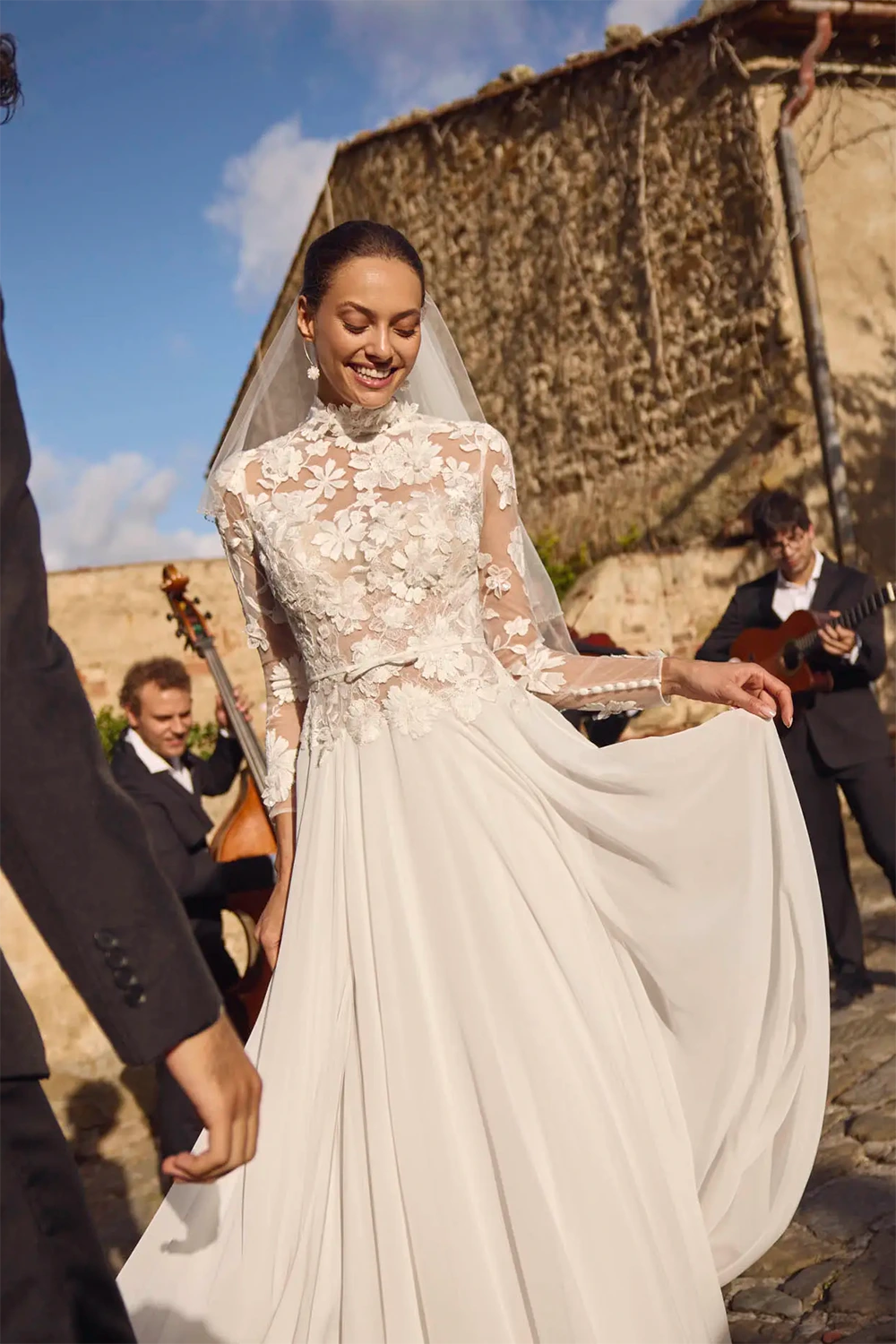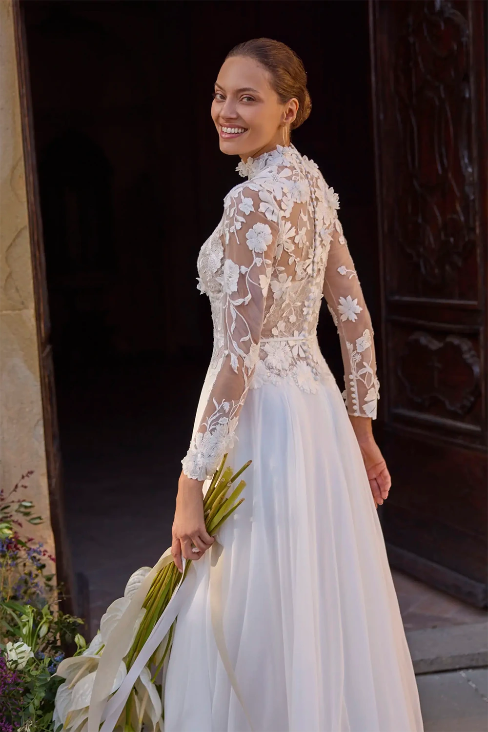 Das Modell Gaia von Modeca ist ein modernes A-Linien Brautkleid mit weich fallendem Chiffonrock.