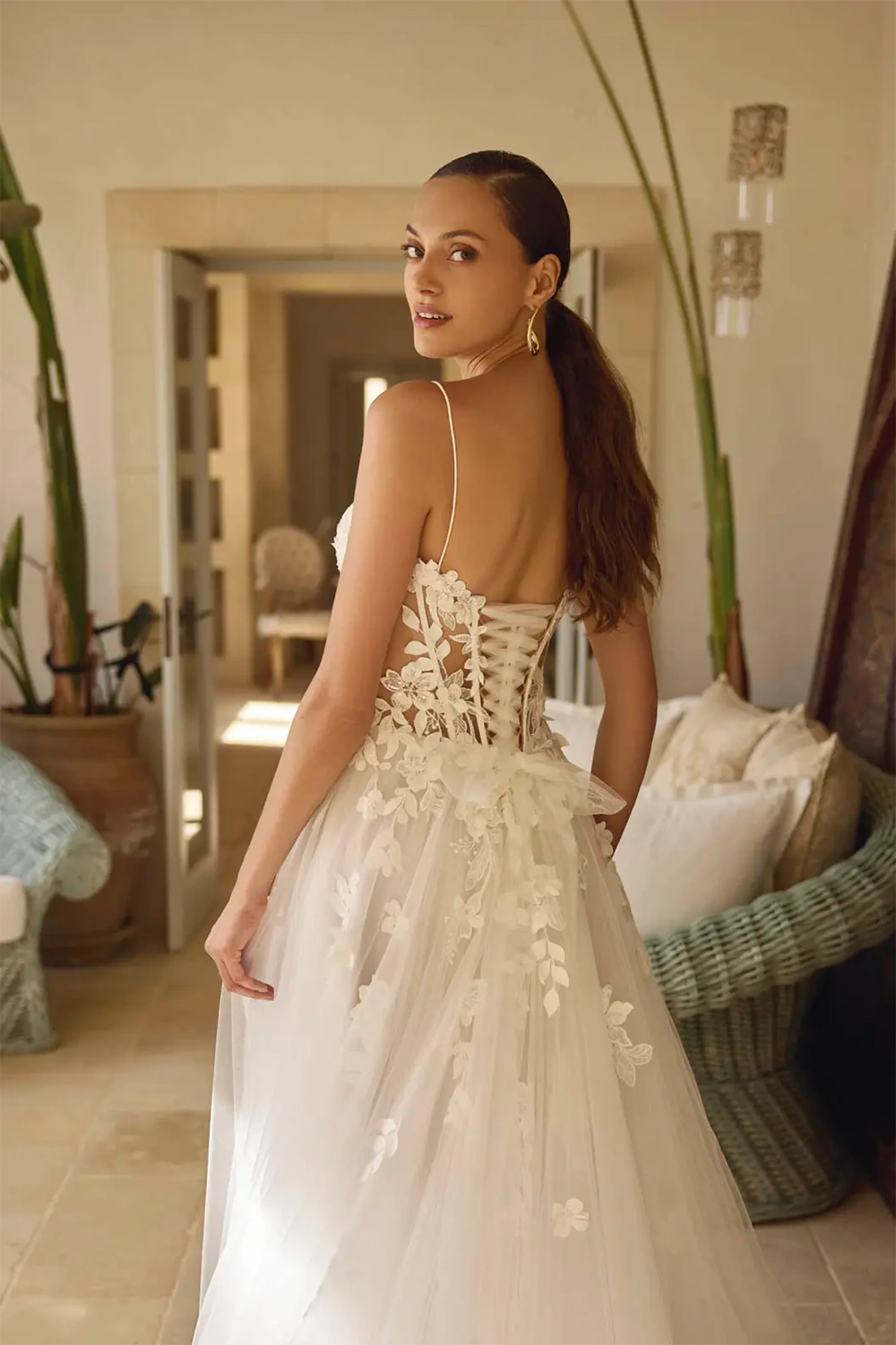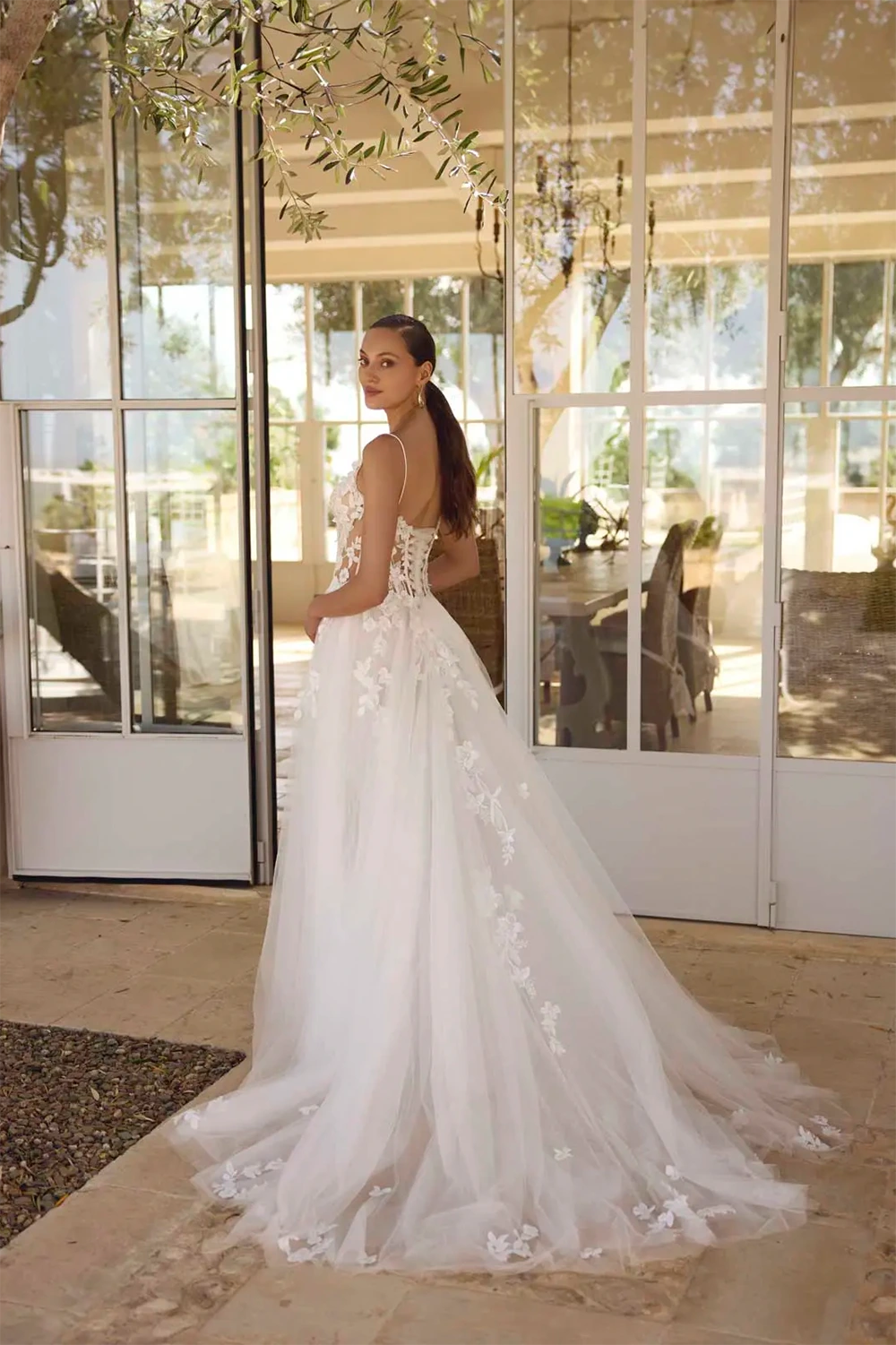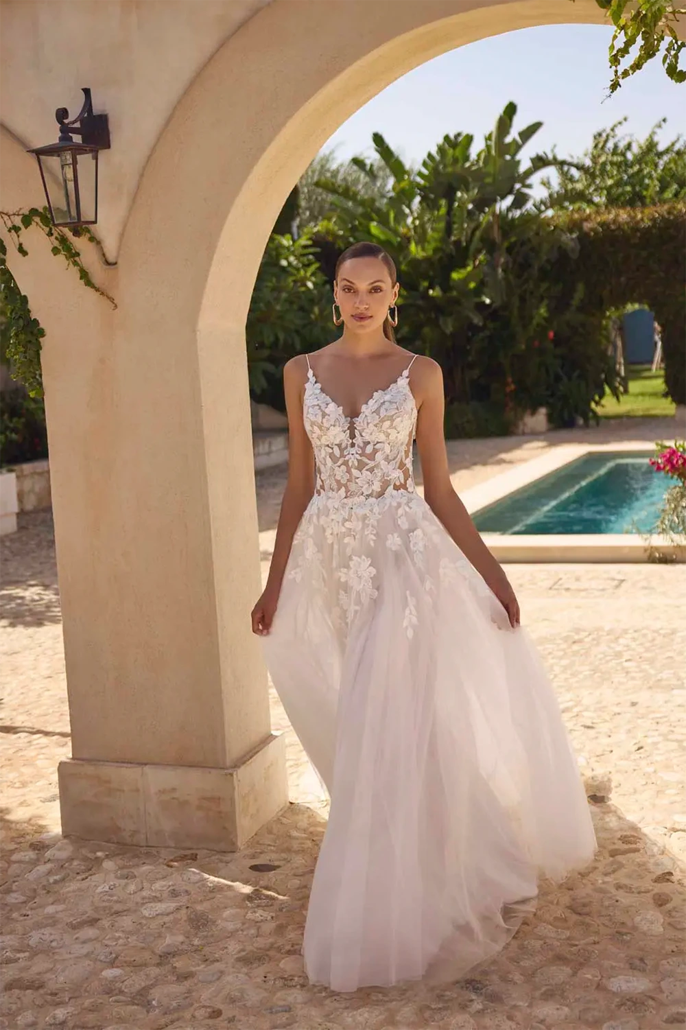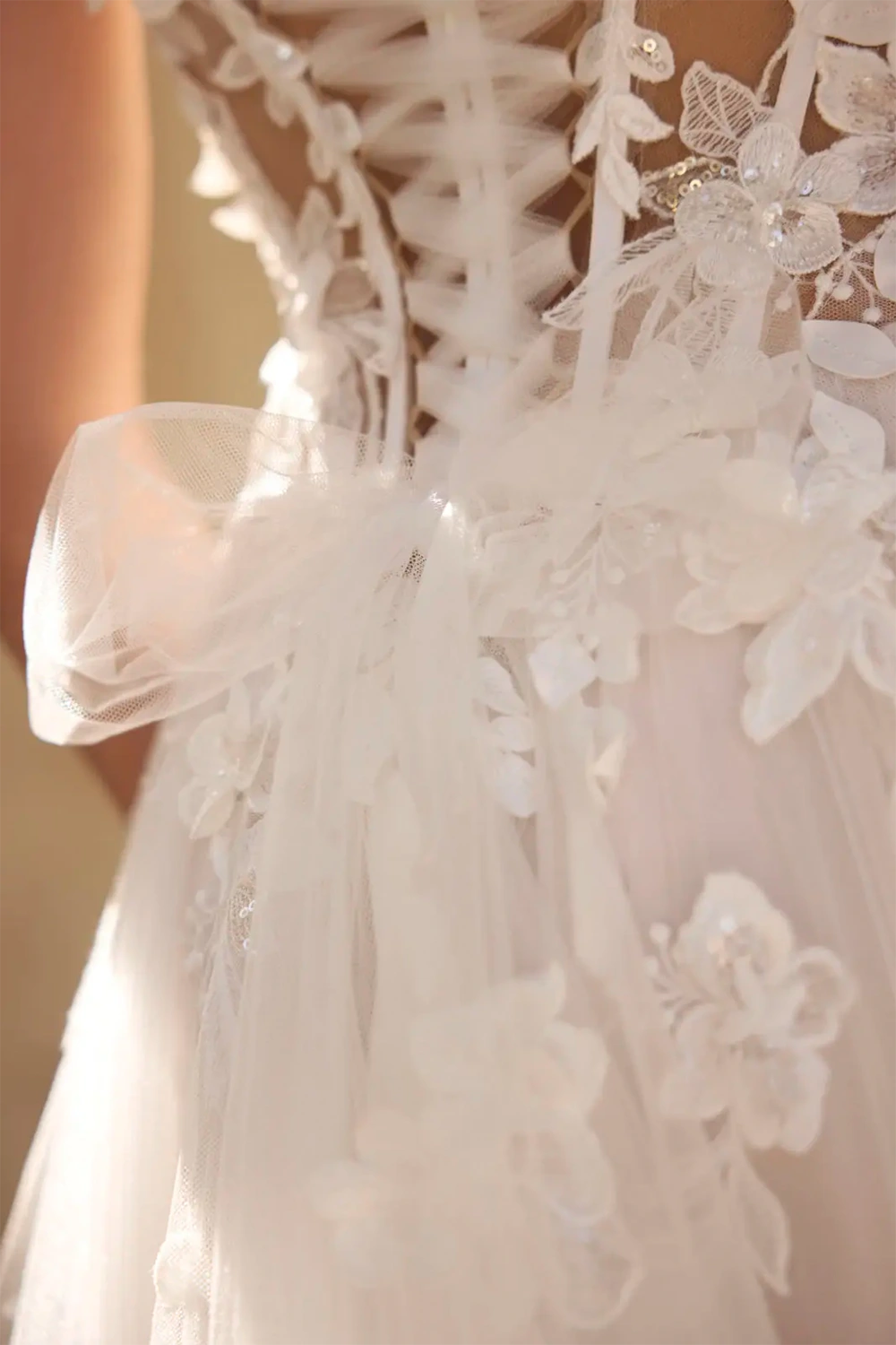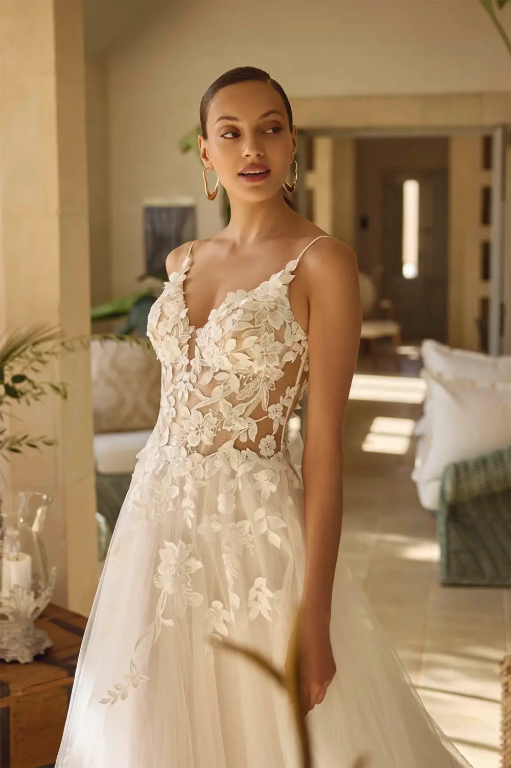 Das Modell Galaxy von Modeca ist ein atemberaubendes A-Linien Brautkleid mit Illusion Spitze und 3D-Apllikationen.