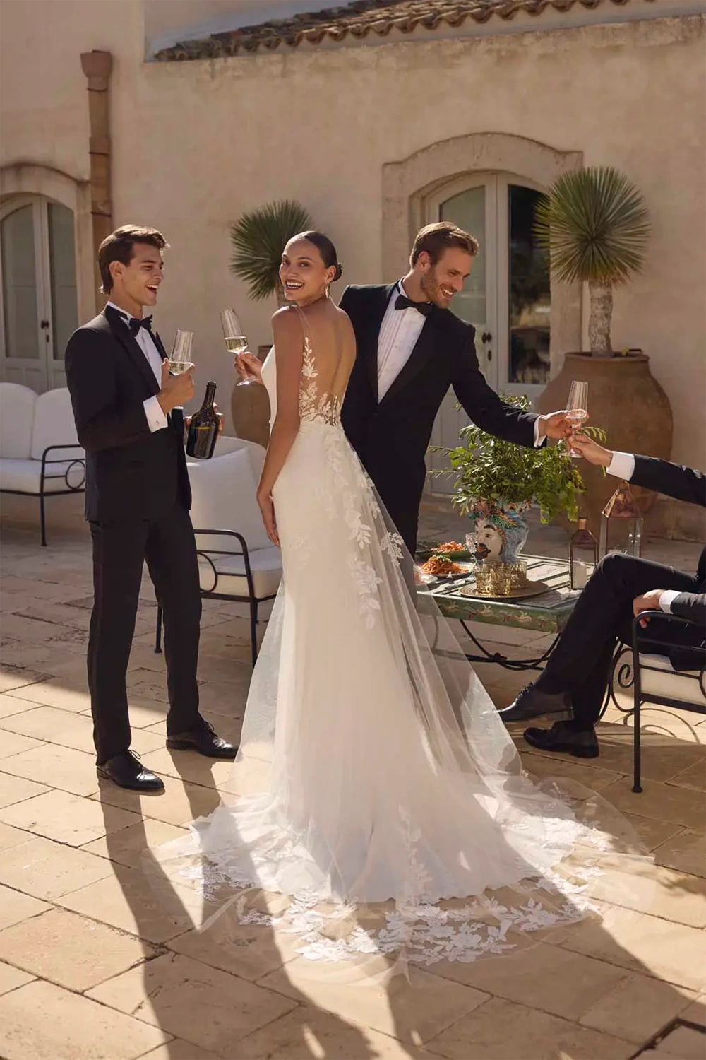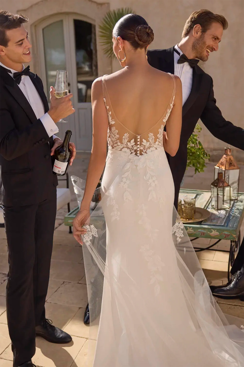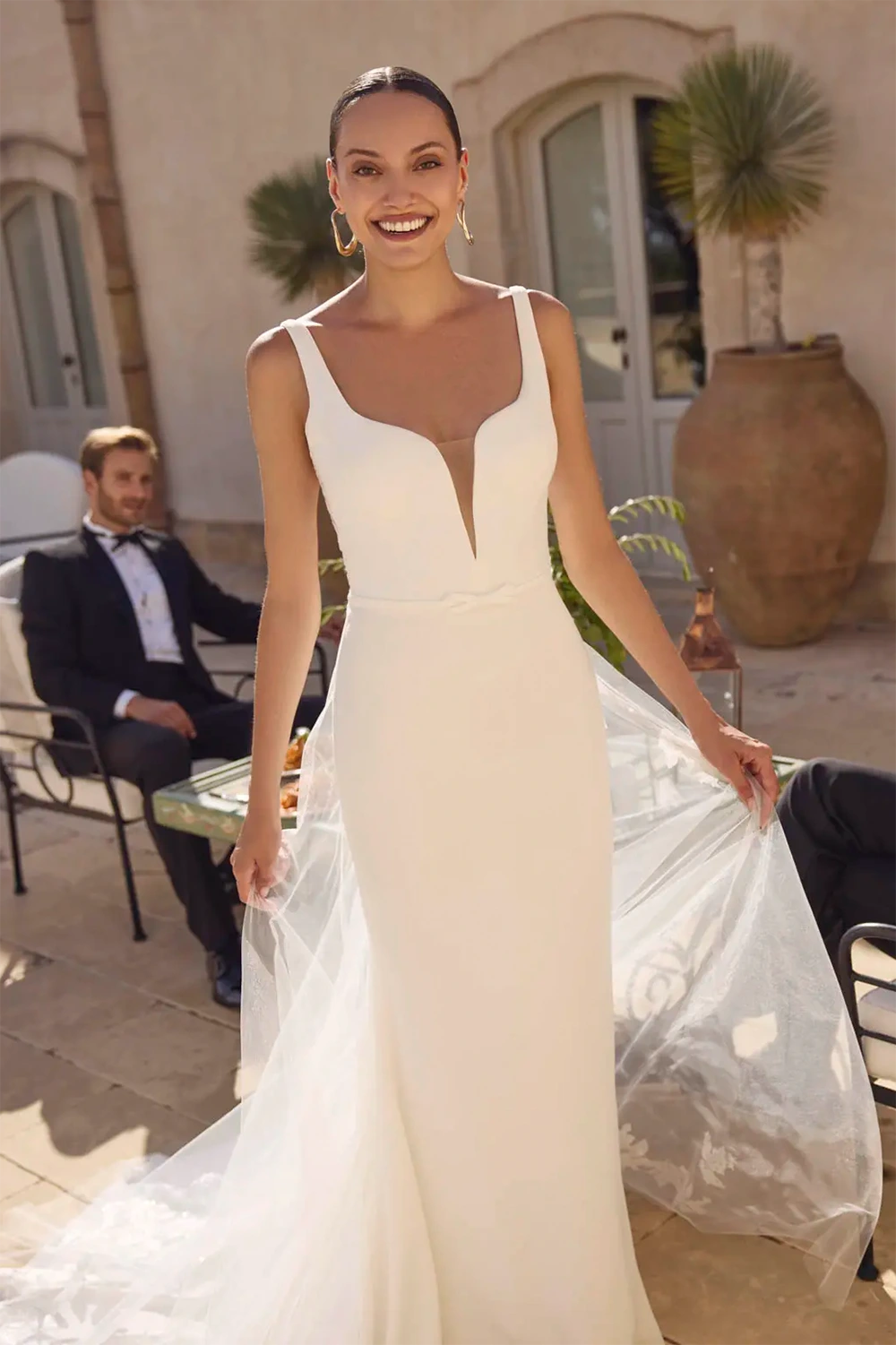 Das Modell Geerda-D von Modeca ist ein schlichtes Meerjungfrauen / Fit-and-Fale Brautkleid mit zarter Tüllschleppe.