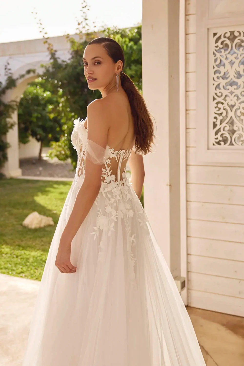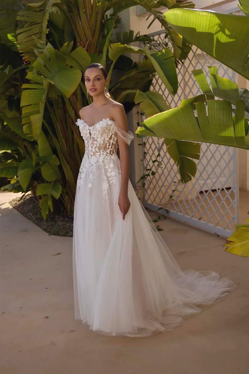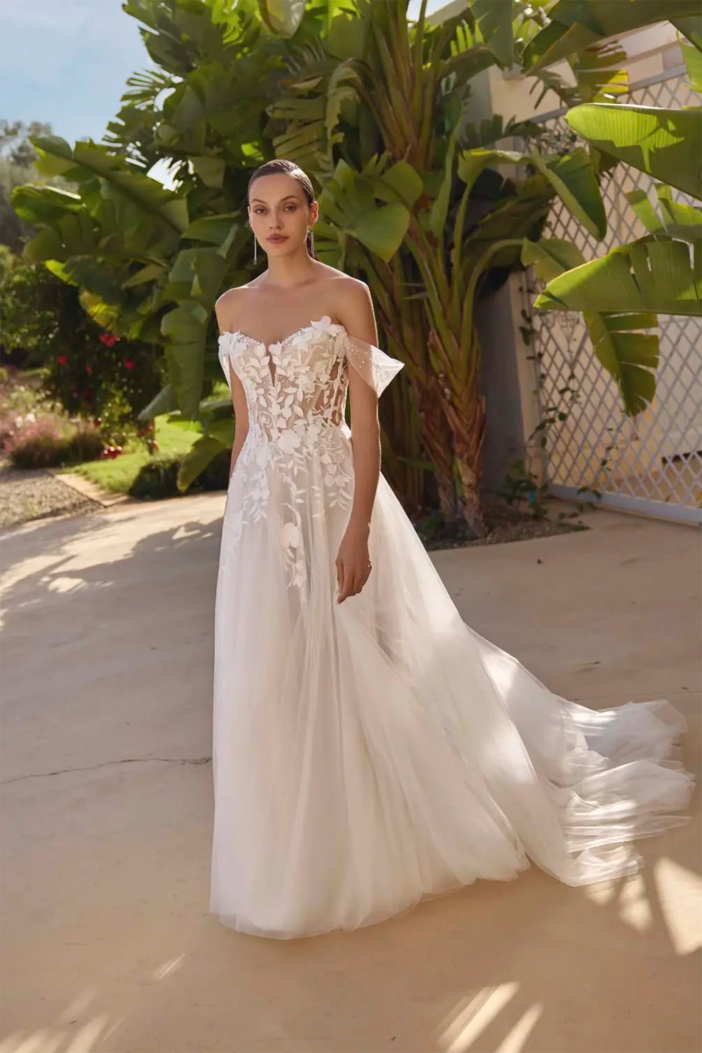 Das Modell Greyson von Modeca ist ein klassisches A-Linien Brautkleid mit Off-Shoulder Trägern.