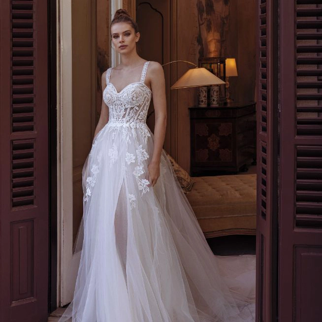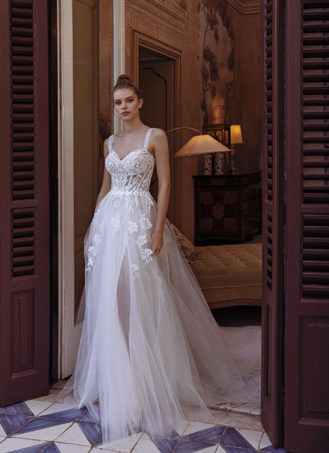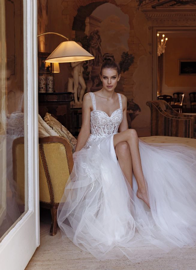 Das Brautkleid Sara von Modeca wirkt überaus glamourös, ganz ohne Perlen oder Pailletten. Sein schmales Oberteil ist transparent und mit sichtbaren Stäbchen gearbeitet. Florale Spitze rankt sich bis in den vorne geschlitzten Rock, während grafische Spitze vor allem den Ausschnitt rahmt und die Träger ziert. Der zarte, lichtdurchlässige Tüllrock umhüllt die Silhouette und greift wiederum die florale Spitze an der breiten Schleppe auf.