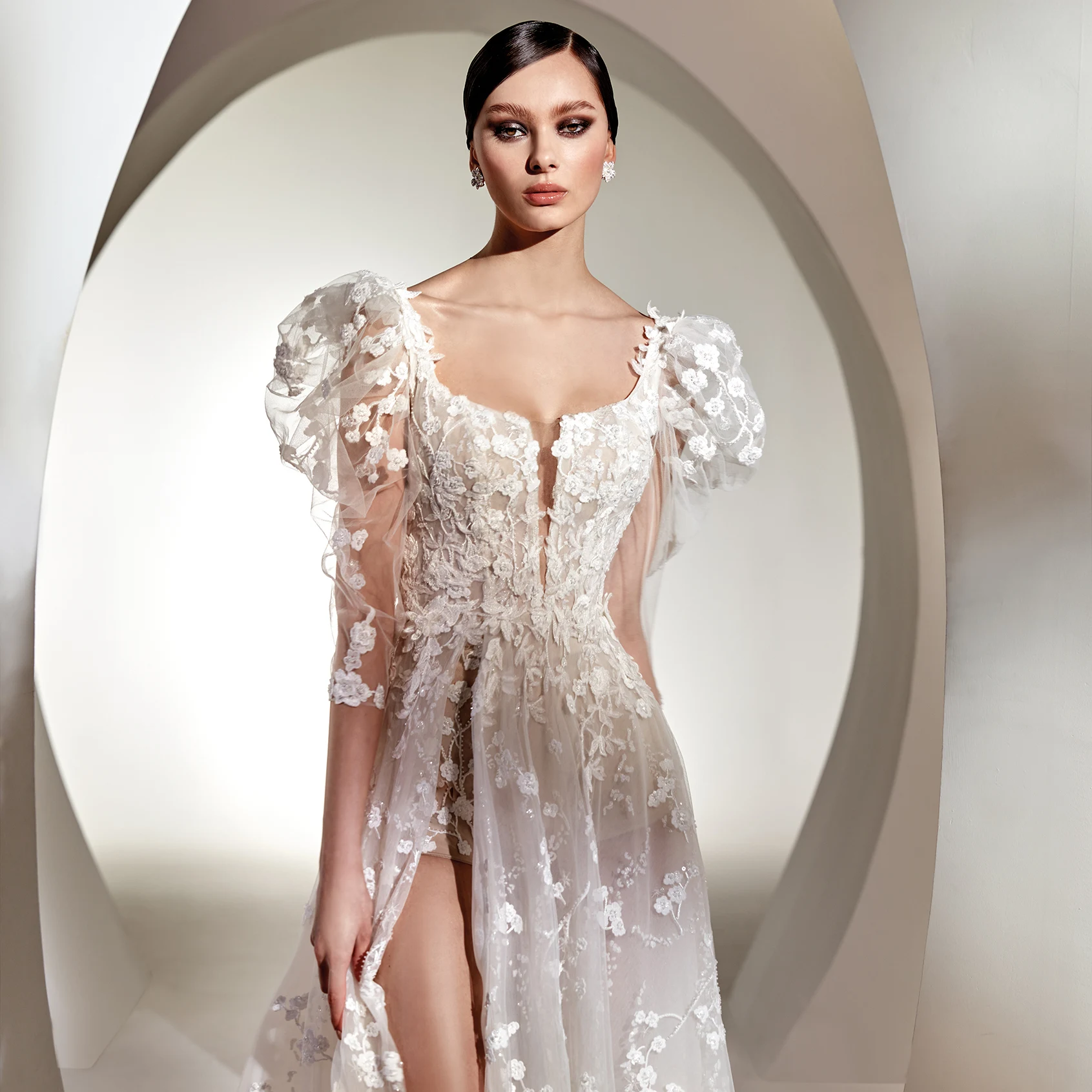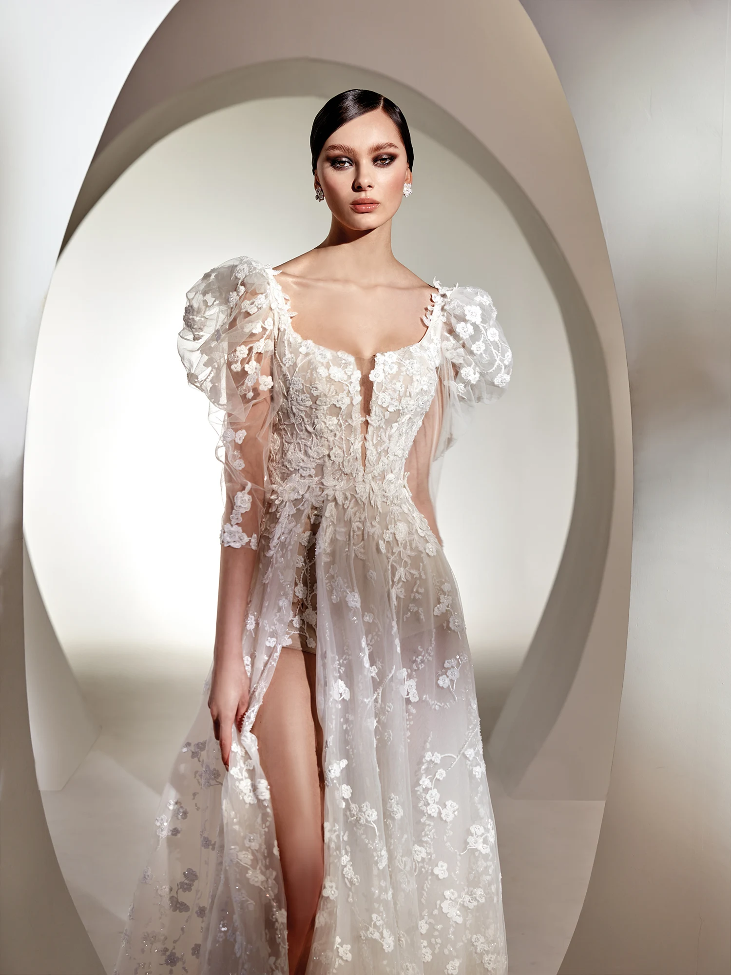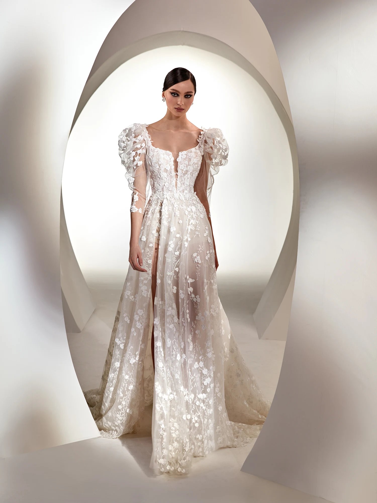 Giza von Nicole Milano ist ein überaus glamouröses und modernes Brautkleid. Florale Spitze bedeckt das grafisch ausgeschnittene Oberteil und setzt sich bis in die Schleppe fort. Besonders auf den transparenten, abnehmbaren Puffärmeln entfaltet sie eine wunderbare 3D-Wirkung. Pailletten lassen das Muster zusätzlich erstrahlen. Der lichtdurchlässige Tüllrock ist an der Vorderseite außergewöhnlich hoch geschlitzt und zeigt einen ebenso bestickten, nudefarbenen Body. Das perfekte Modell für einen großen Auftritt.