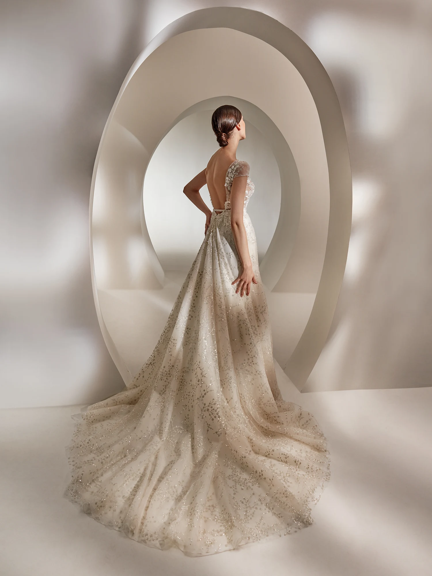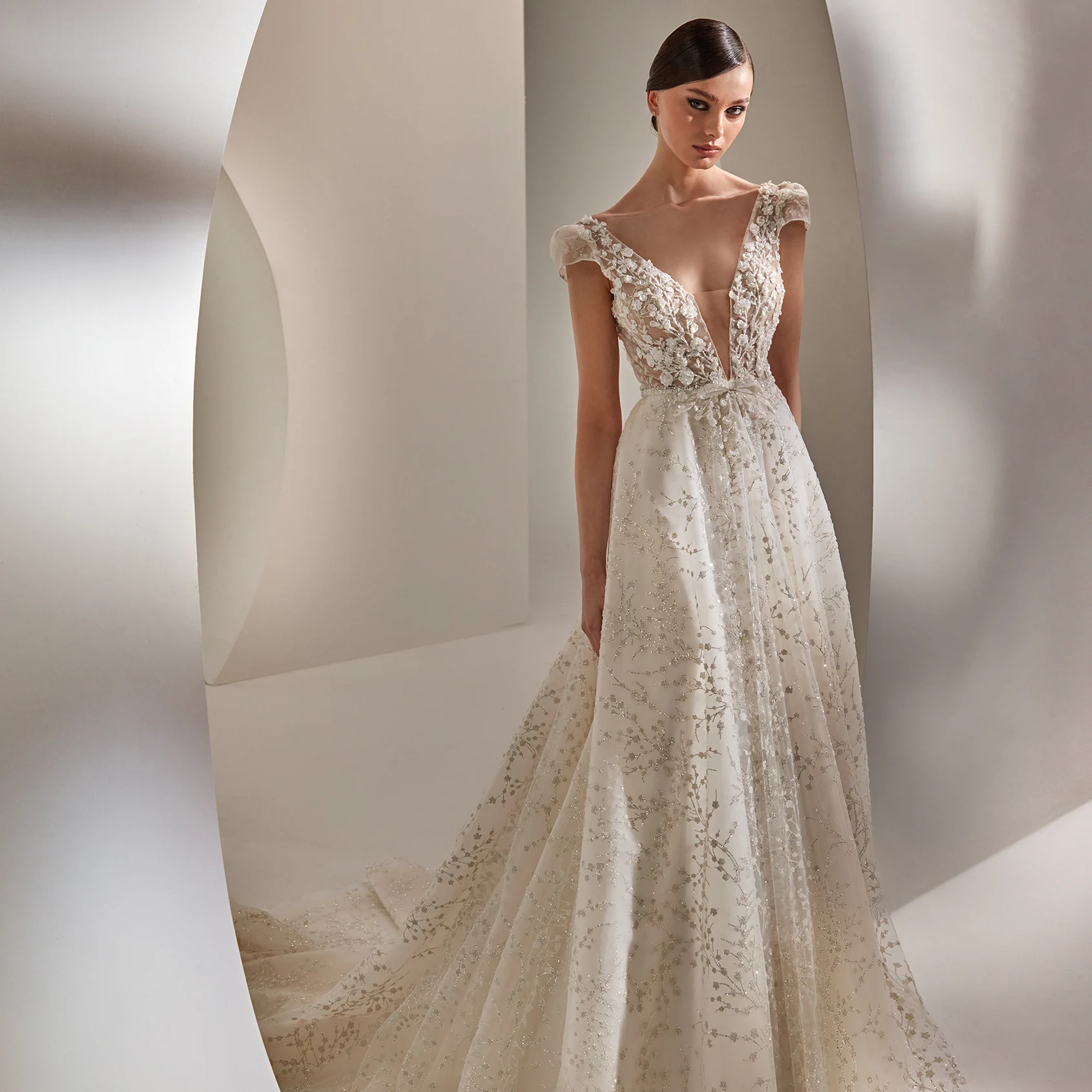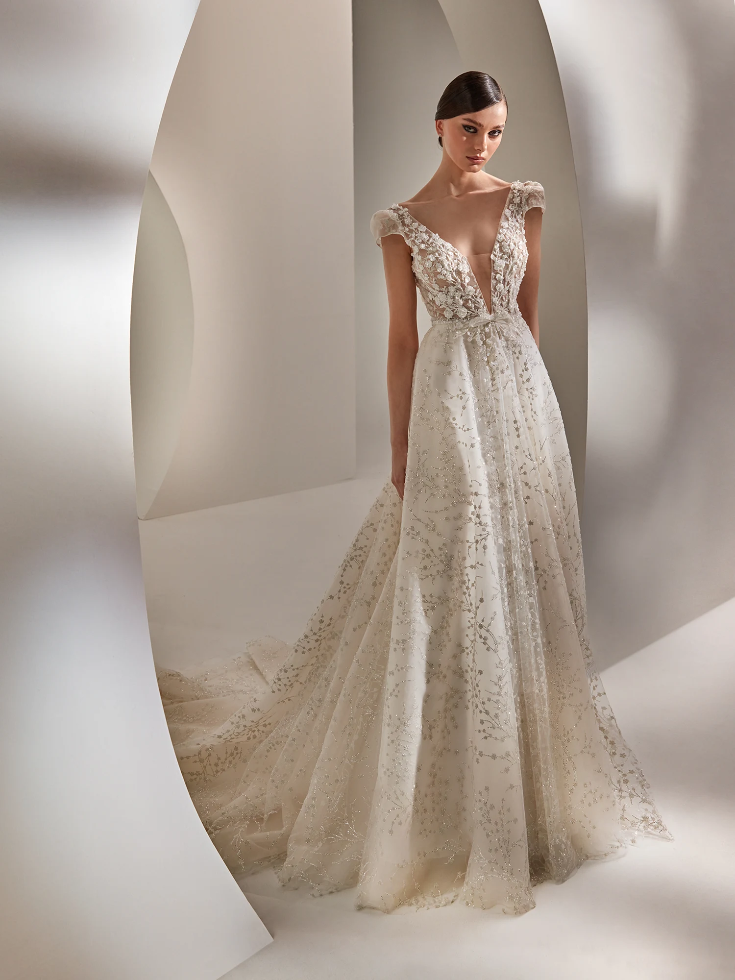 Das Brautkleid Laktha von Nicole Milano sprüht vor Glamour und luxuriöser Eleganz. Florale 3D-Spitze und unzählige Perlen zieren den gesamten Entwurf. Am transparente Oberteil setzen kleine Puffärmel an. Ein Einsatz aus Netzstoff gibt dem besonders tiefen Dekolleté Halt. Unter einem Taillenband aus Perlen mit Schleifendetail fächert sich der Tüllrock besonders an der Rückseite voluminös auf.